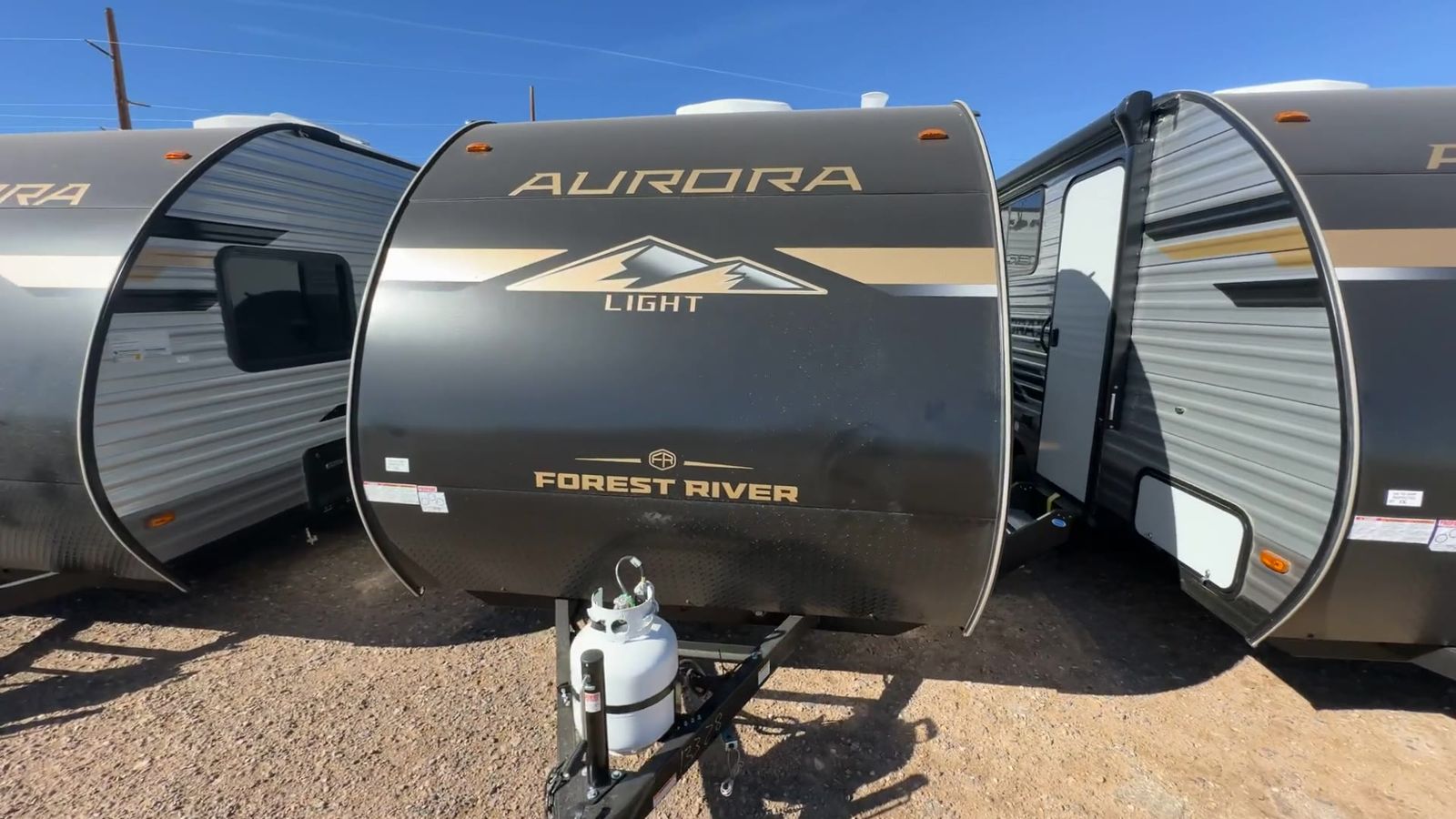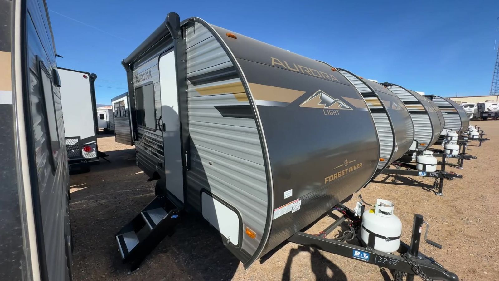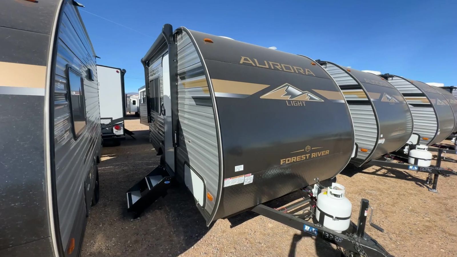 Forest River Aurora Light travel trailer 13RDX highlights: 54" x 74" Queen Bed Two Burner Gas Range Sleeps Three Exterior Storage This lightweight travel trailer includes everything you need for comfortable camping trips at the lake. You can make your meals on the two burner cooktop or in the stainless steel microwave, and a 3.3 cu. ft. 12V refrigerator will keep leftovers fresh. A front queen bed provides a great night's rest, and there is a 29" booth dinette that will double as both dining and additional sleeping space. And a private bath with a 24" x 32" shower and toilet will let you easily freshen up without having to use the camp's facilities! Comfortability, usability, and quality is what you will find in each one of these Forest River Aurora Light travel trailers! They are designed with a superior build and packed full with industry leading, functional, and distinctive standard features. The diamond plate rock guard will protect your unit from road debris and the nitrogen filled radial tires, which keep their pressure longer, offer better fuel economy. You will also find upgraded JBL Elite exterior speaker outside, an electric awning with multicolor lights and remote, plus flush mount baggage doors for easy packing. The interiors are beautifully designed with matte black kitchen and bath faucets, black nightshades in the living room, and GE kitchen appliances!
