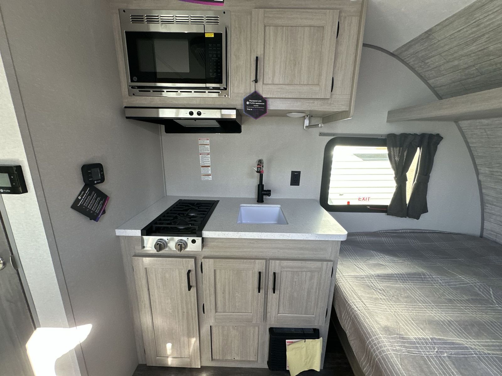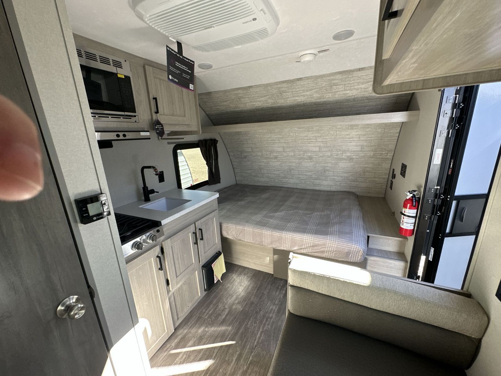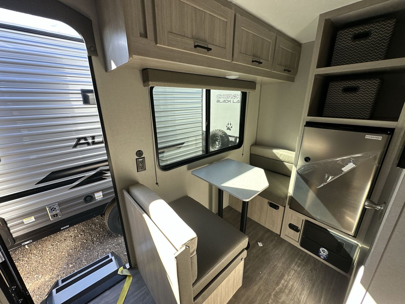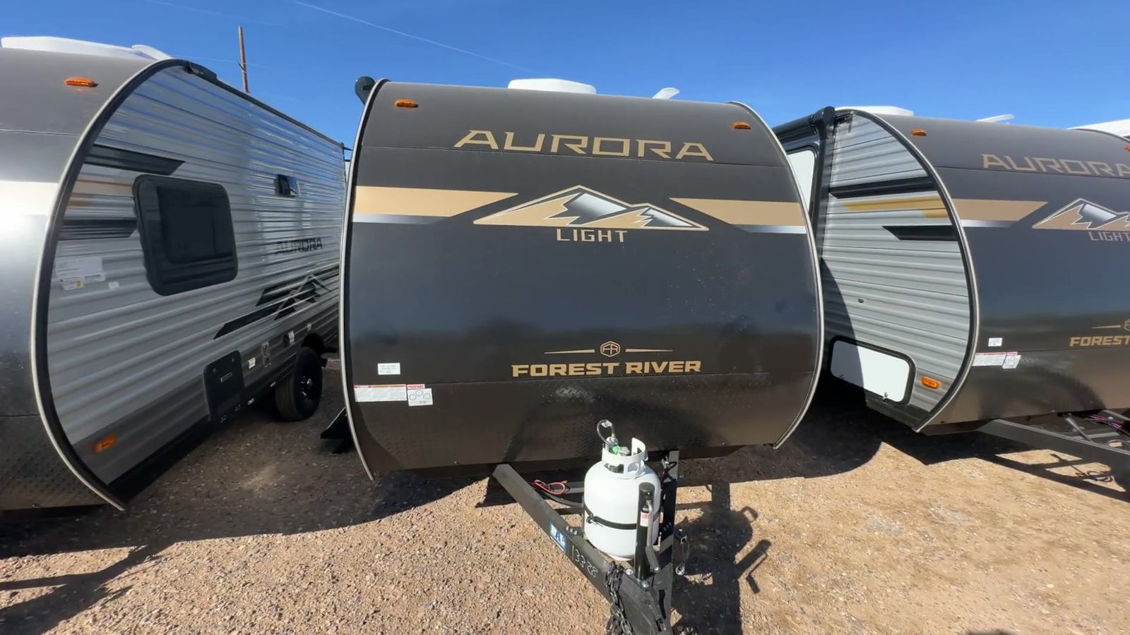 Forest River Aurora Light travel trailer 13RDX highlights: 54" x 74" Queen Bed Two Burner Gas Range Sleeps Three Exterior Storage This lightweight travel trailer includes everything you need for comfortable camping trips at the lake. You can make your meals on the two burner cooktop or in the stainless steel microwave, and a 3.3 cu. ft. 12V refrigerator will keep leftovers fresh. A front queen bed provides a great night's rest, and there is a 29" booth dinette that will double as both dining and additional sleeping space. And a private bath with a 24" x 32" shower and toilet will let you easily freshen up without having to use the camp's facilities! Comfortability, usability, and quality is what you will find in each one of these Forest River Aurora Light travel trailers! They are designed with a superior build and packed full with industry leading, functional, and distinctive standard features. The diamond plate rock guard will protect your unit from road debris and the nitrogen filled radial tires, which keep their pressure longer, offer better fuel economy. You will also find upgraded JBL Elite exterior speaker outside, an electric awning with multicolor lights and remote, plus flush mount baggage doors for easy packing. The interiors are beautifully designed with matte black kitchen and bath faucets, black nightshades in the living room, and GE kitchen appliances!