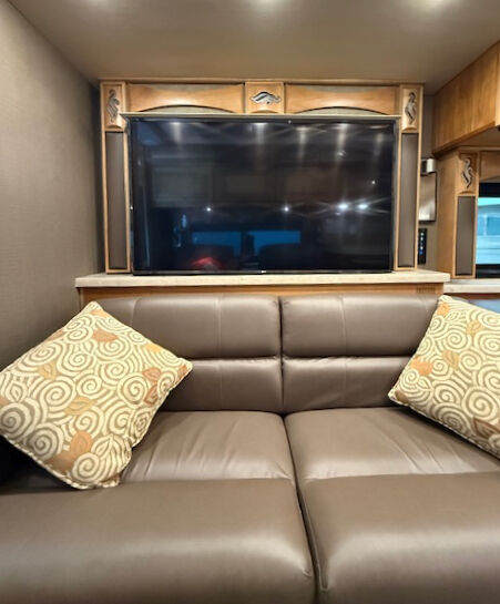 Watch tv, sports, or movies from the fabulous theater recliners on the large tv that is stowed away with an electric lift when you’re not using it. Or watch your favorite program outside on the flat panel exterior tv, on the overhead tv above the front window, or on the flat panel tv in the bedroom.