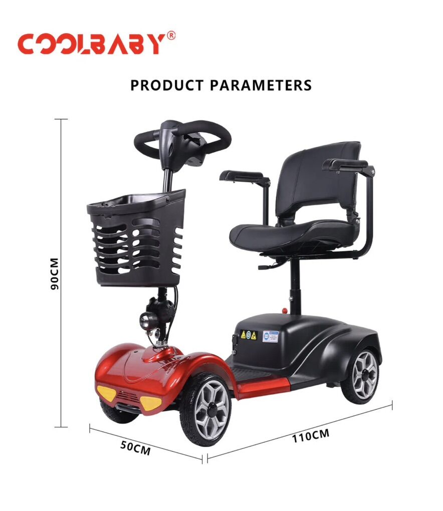PRODUCT PARAMETERS: Dimensions: 1105090cm Package Size: 1145453cm Chassis Height: 12cm off the ground Wheels: 7'' Solid PU tires (Front and Rear) Turning Radius: 110cm Speed: 6-8km/h Battery: 24V×2 12AH Lead Acid Battery Charger: 24V/2A Motor Power: 24V/180W Endurance: ≥ 18km Weight Capacity: 120 kg (264 pounds) Net Weight: 46kg/101lb Gross Weight: 56kg/123lb Charging Time: 8–10 hours Suitable for: disabled or elderly
