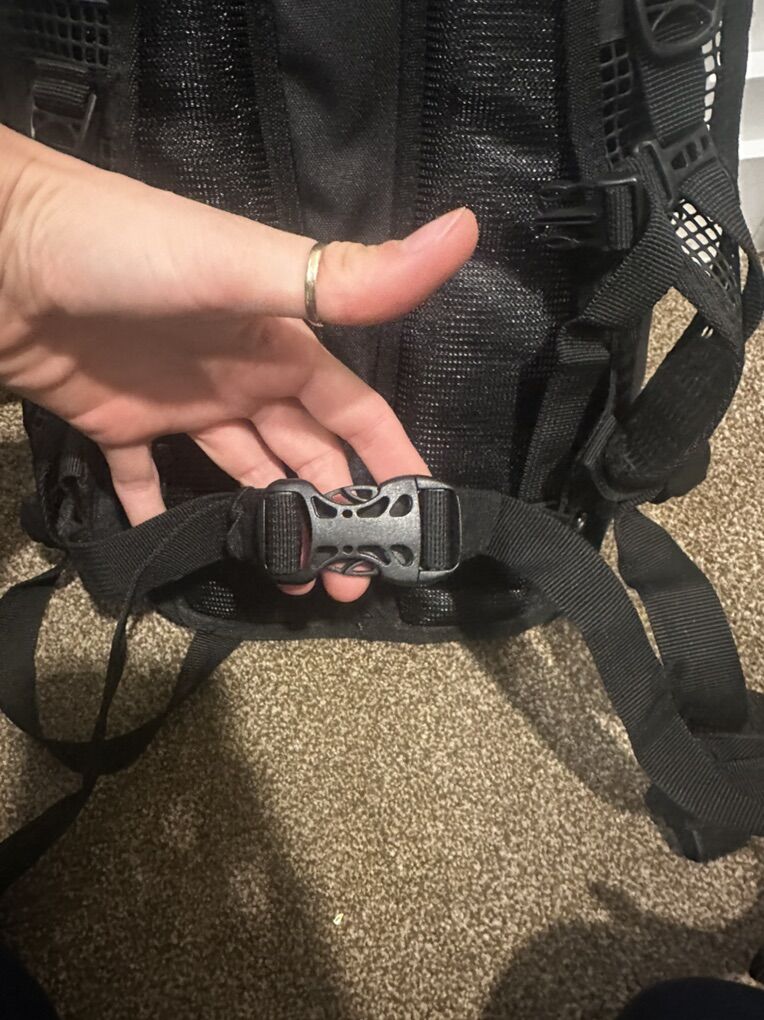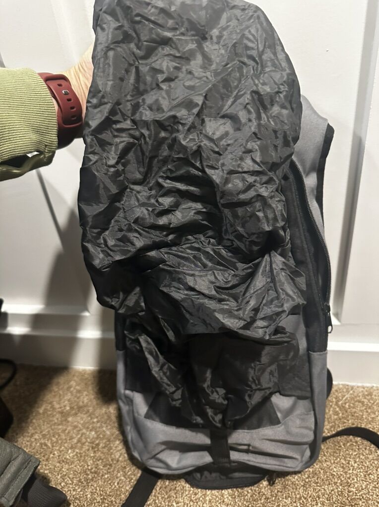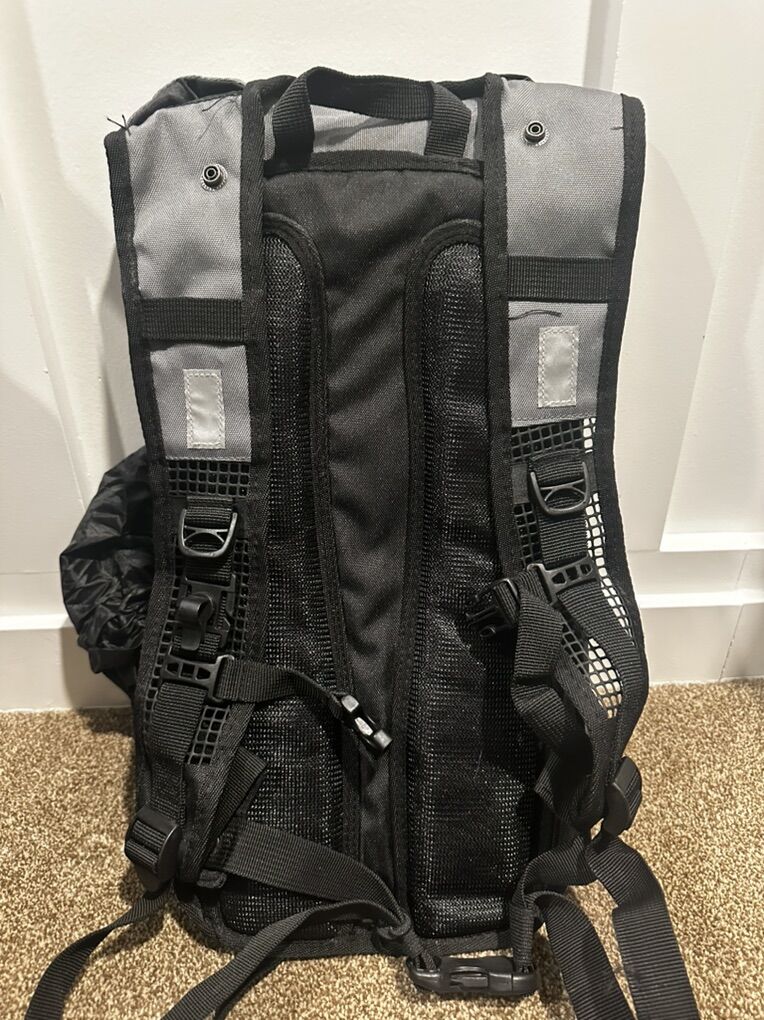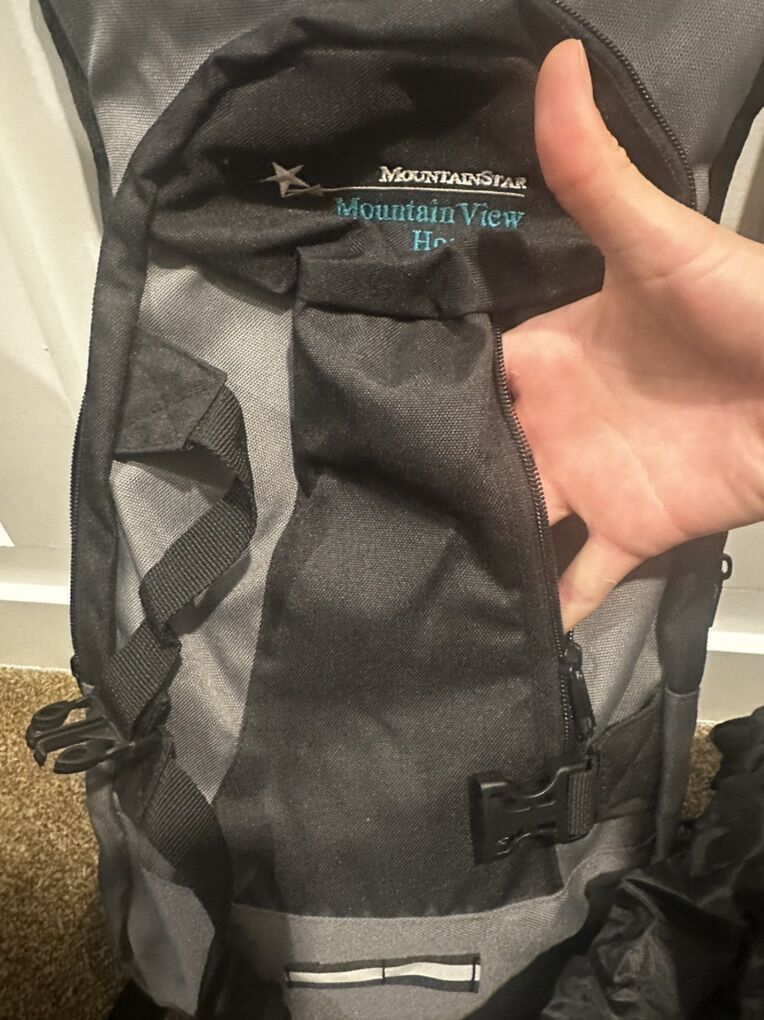 VenmoNever used. Side pocket in front and a large compartment. Waist and chest straps. Also, has a cover for rain days.