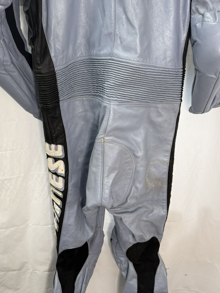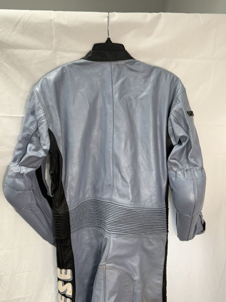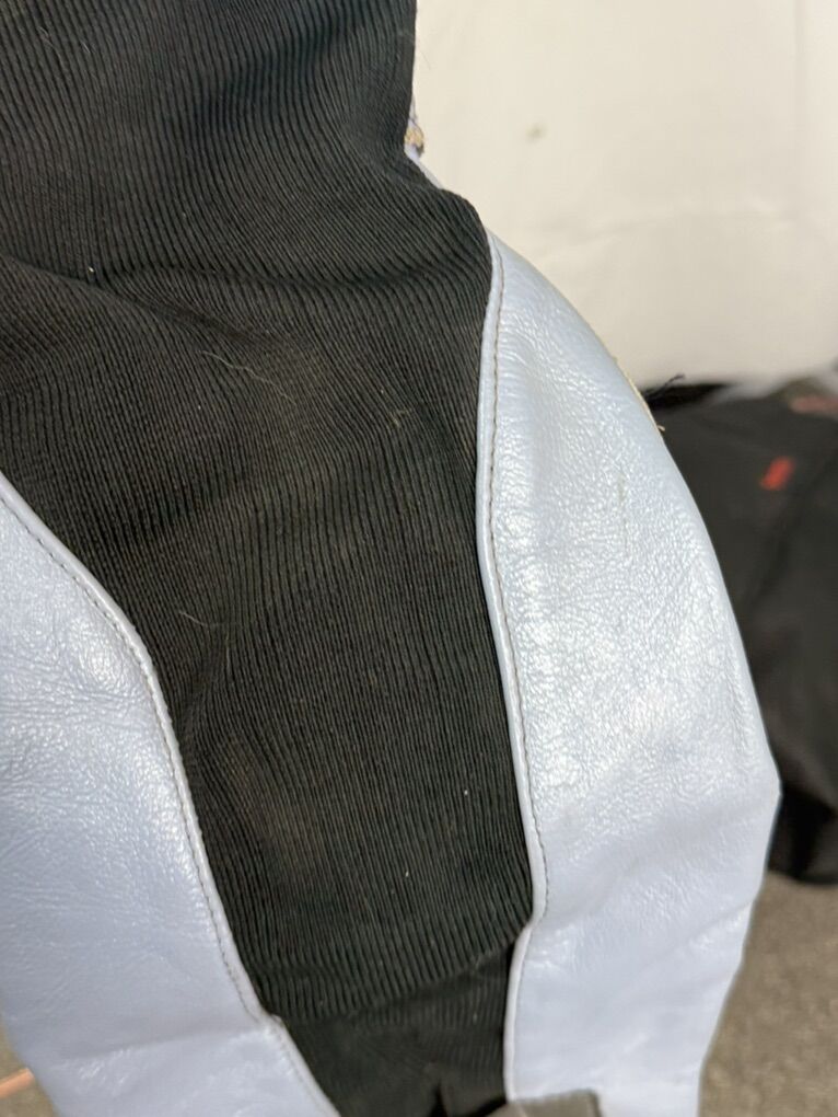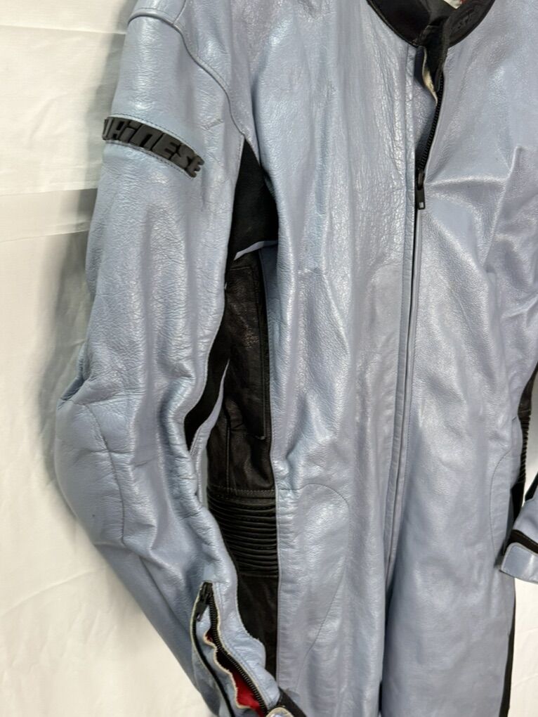 The leather on one of the knees is damaged, as seen in the photos. It also has some road rash on the elbows and on one hip.