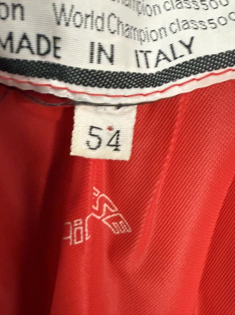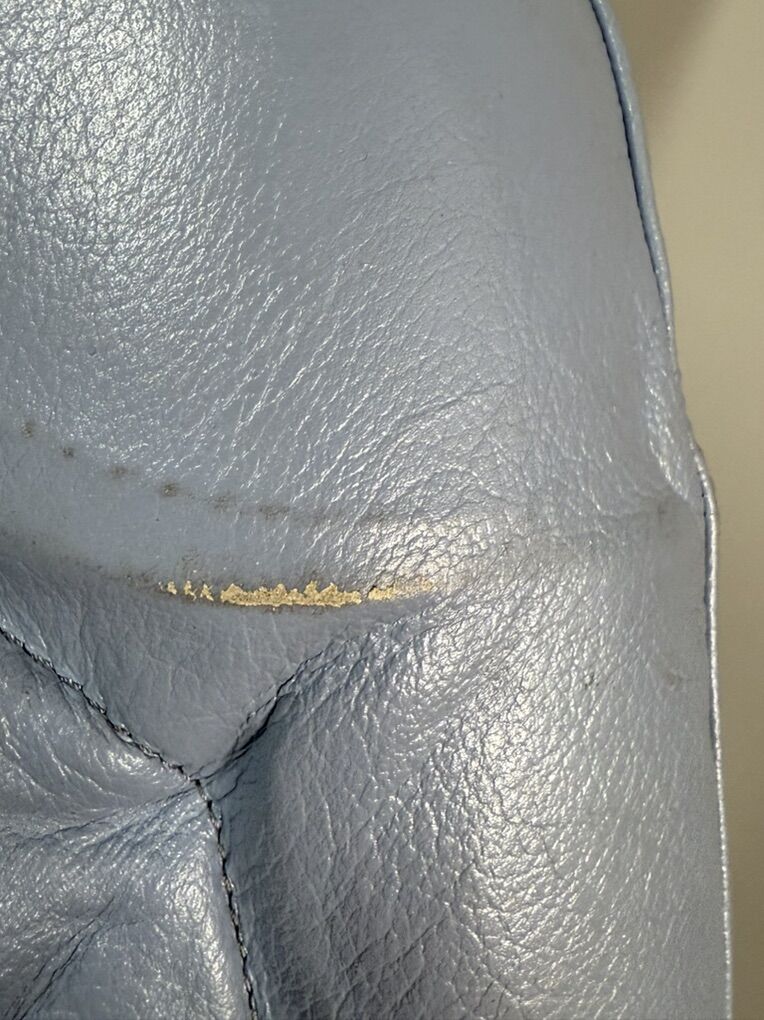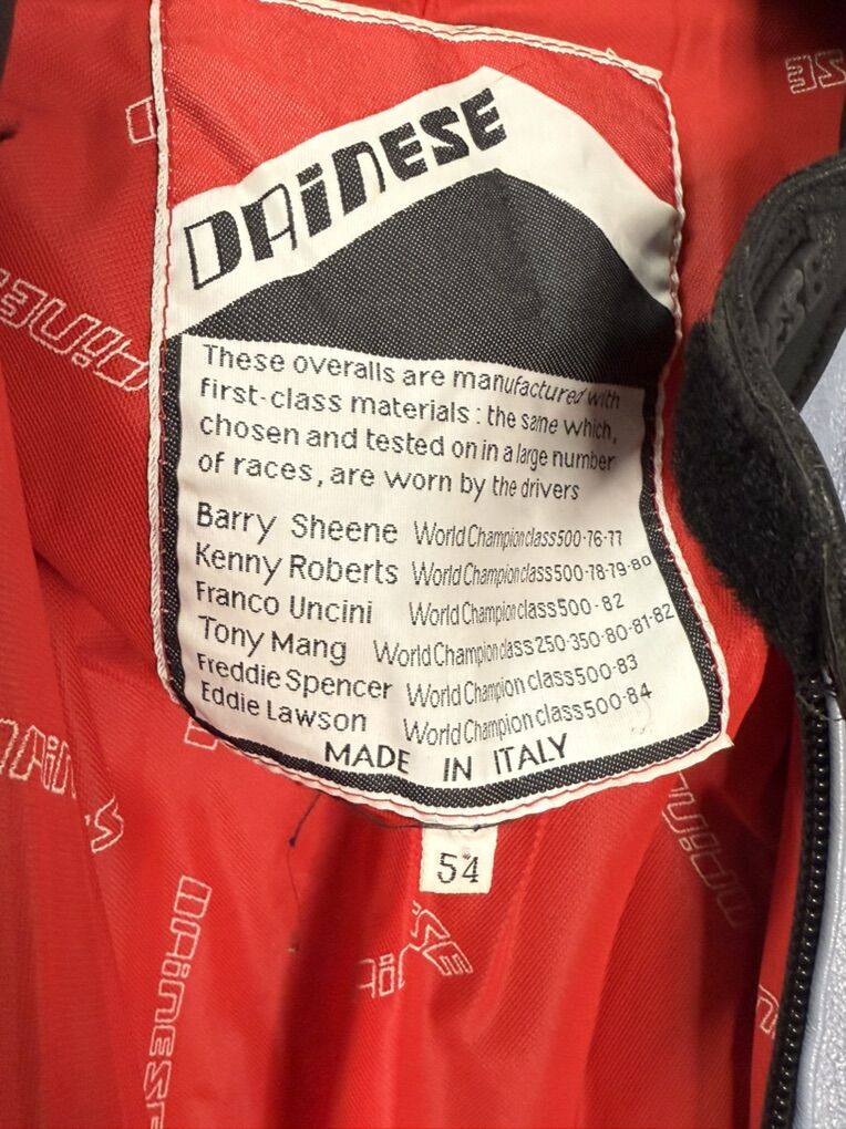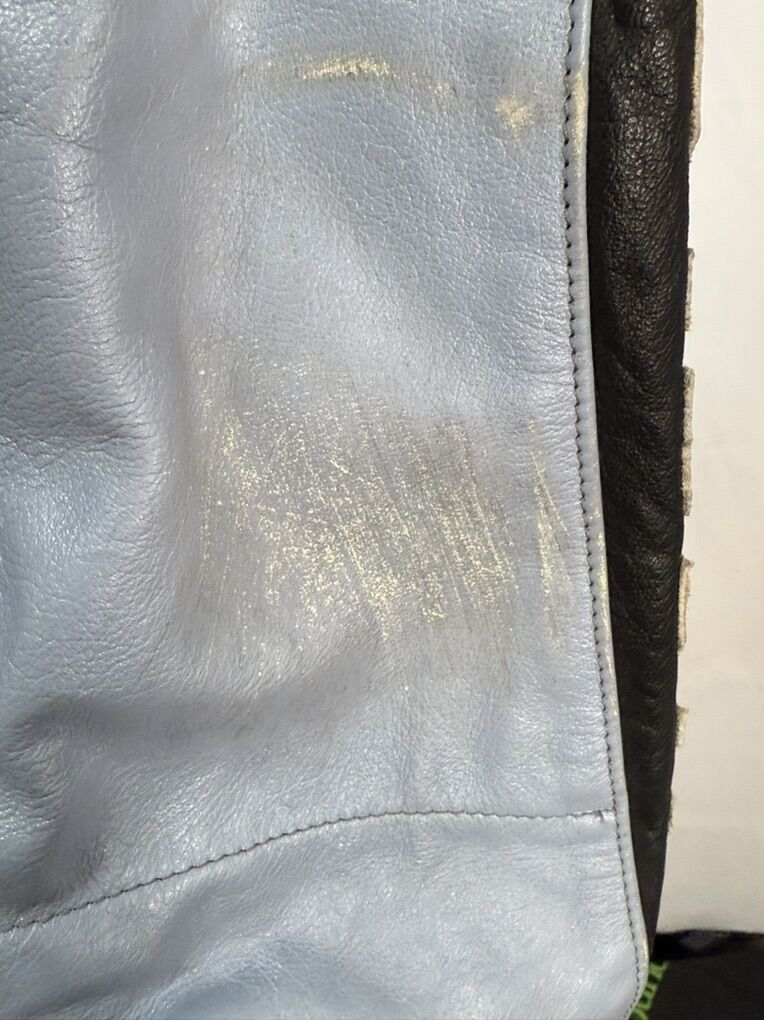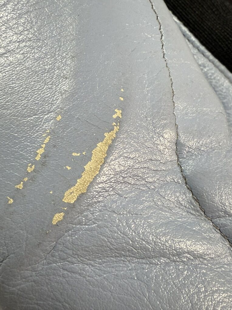 The leather on one of the knees is damaged, as seen in the photos. It also has some road rash on the elbows and on one hip.