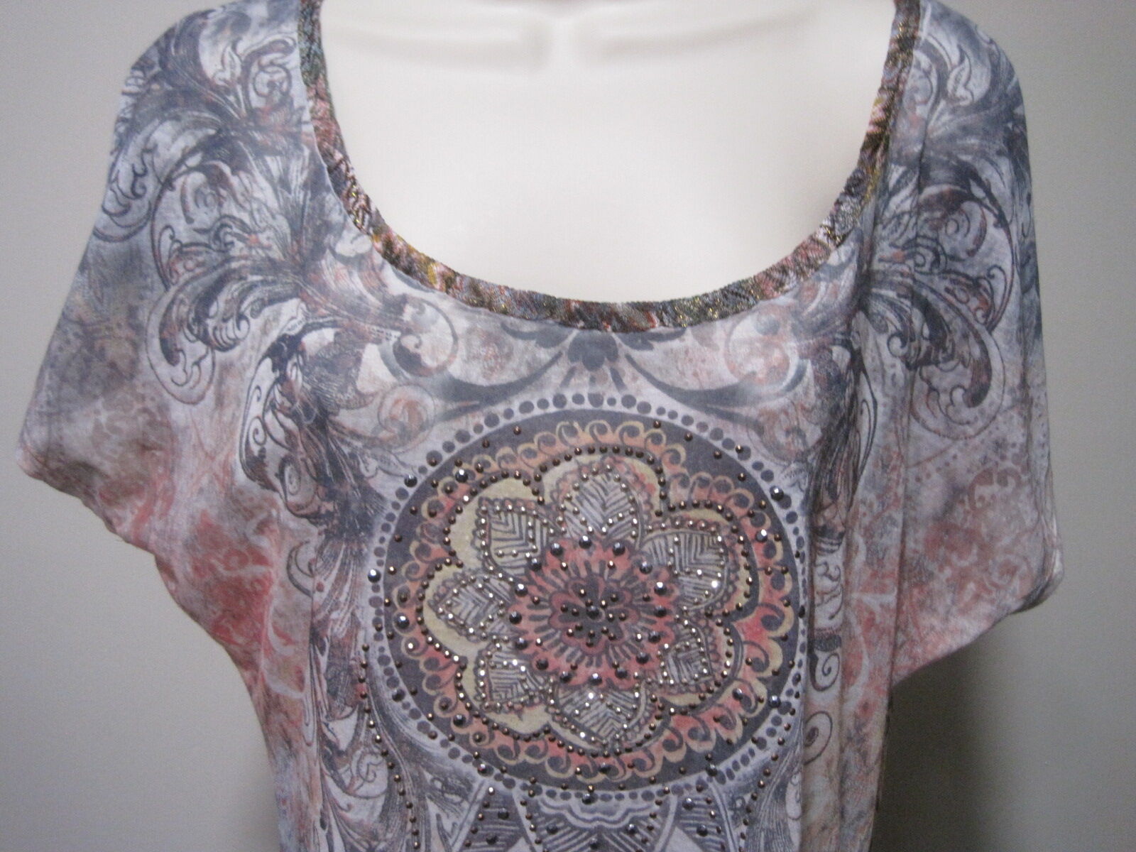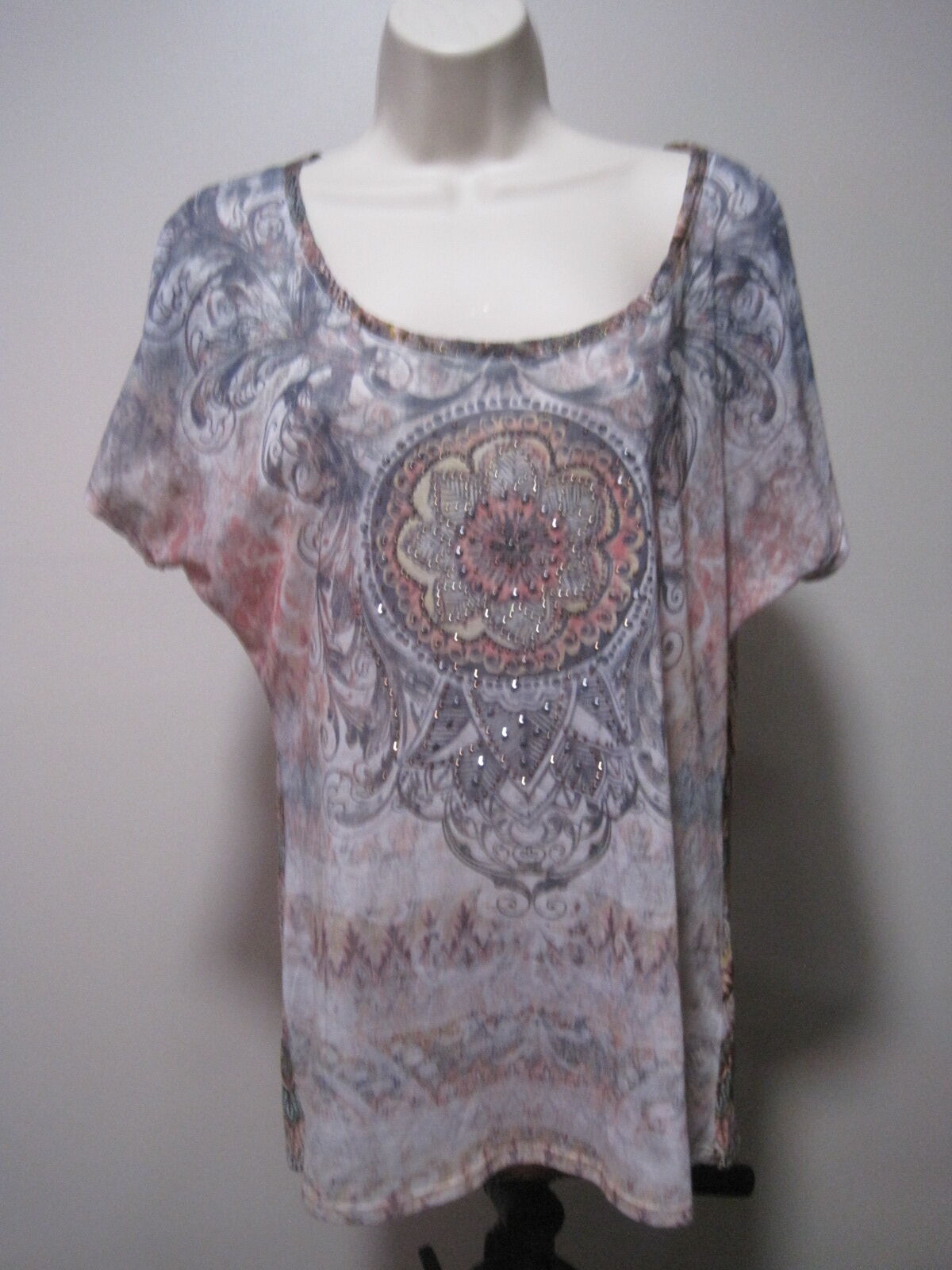 The Maurices Sz LARGE Studded Mandala Print Mixed Media Blouse Top is a versatile and stylish option for any woman's wardrobe. Featuring a scoop neckline, pullover closure, and a mix of prints and fabrics, this blouse is perfect for casual day outings or evening parties. The studded accents add a touch of edginess, while the lightweight knit fabric ensures a comfortable fit. With a regular fit and short dolman sleeves, this top is a must-have for the summer, fall, and spring seasons, offering a boho theme that is on-trend and easy to care for with machine washable instructions.