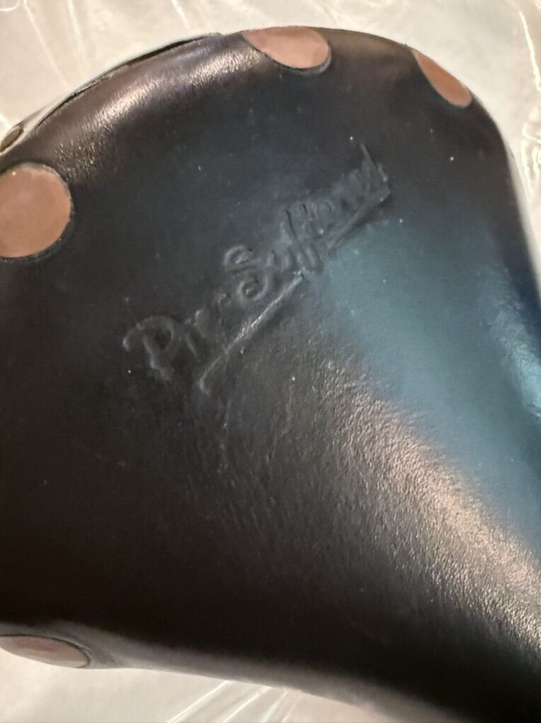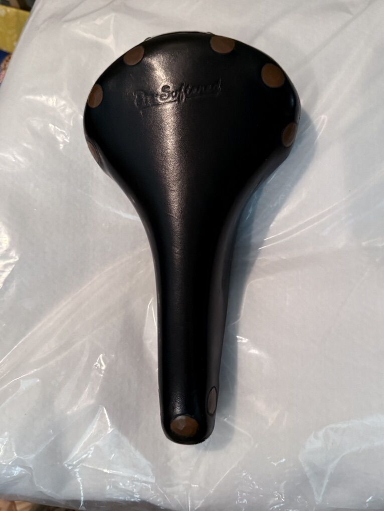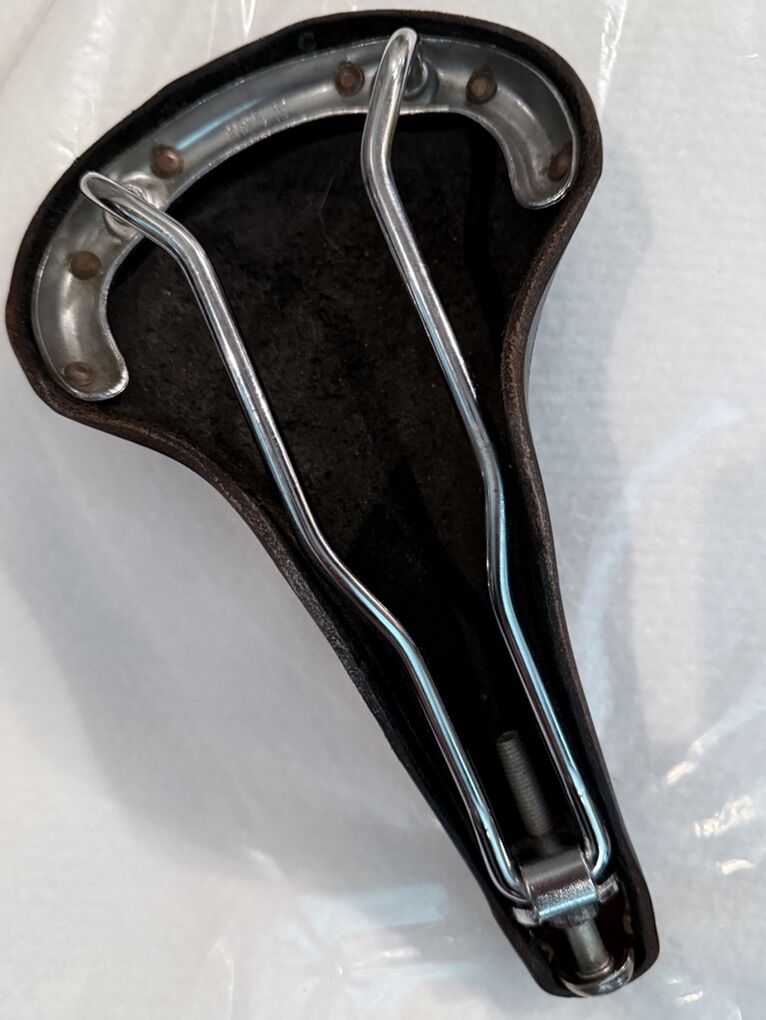 I found this Brooks saddle in a box of things I had packed away back in 1994. I believe I bought this saddle from a bike shop in SoCal around 1993. I have never mounted or used it. Brooks does not make this ‘pre-softened’ version anymore. Don’t let that name fool you, it’s still a little stiff, but not as much as the new ones nowadays. It does have the large hand-hammered copper rivets, with that greenish patina around the edges, as seen in the pictures. This would be a nice addition to an old-school classic steel bike you have hanging on the wall or put to use on the road as intended. Thank you for looking. ~E