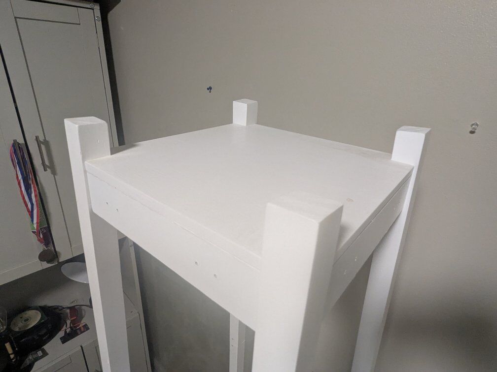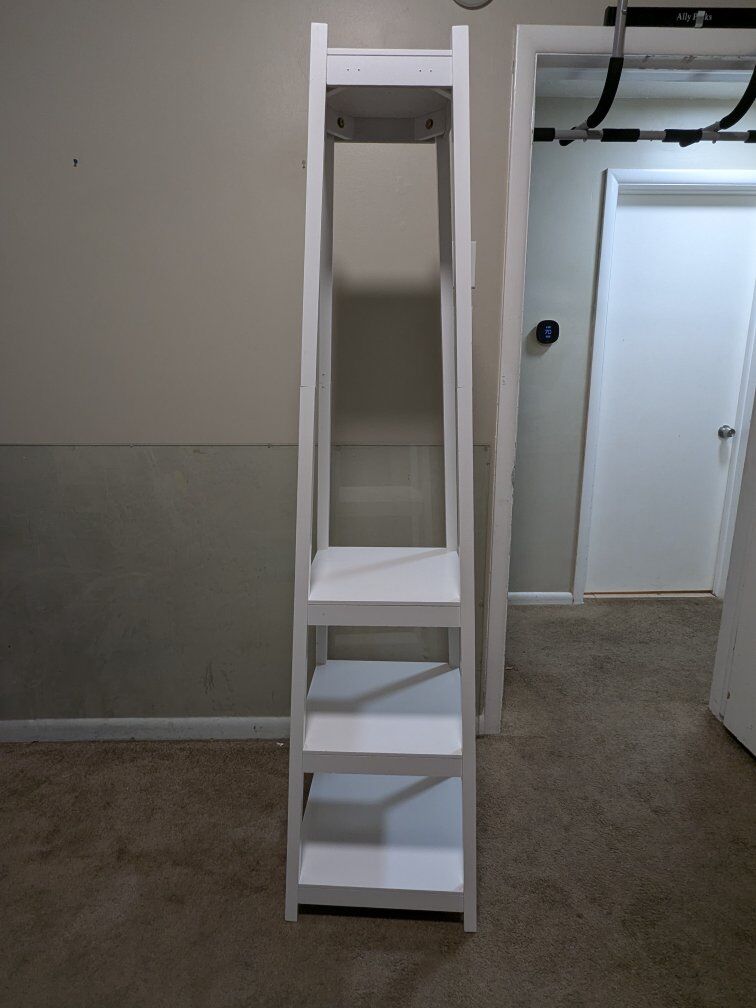 Dimensions: Full: 71"T x 17"W (at base) Very top shelf: 10 1/2" x 10 1/2" Main shelf: 14" x 14" Middle shelf: 15 3/8" x 15 3/8" x 11"T Bottom shelf: 16 1/2" x 16 1/2" x 11"T