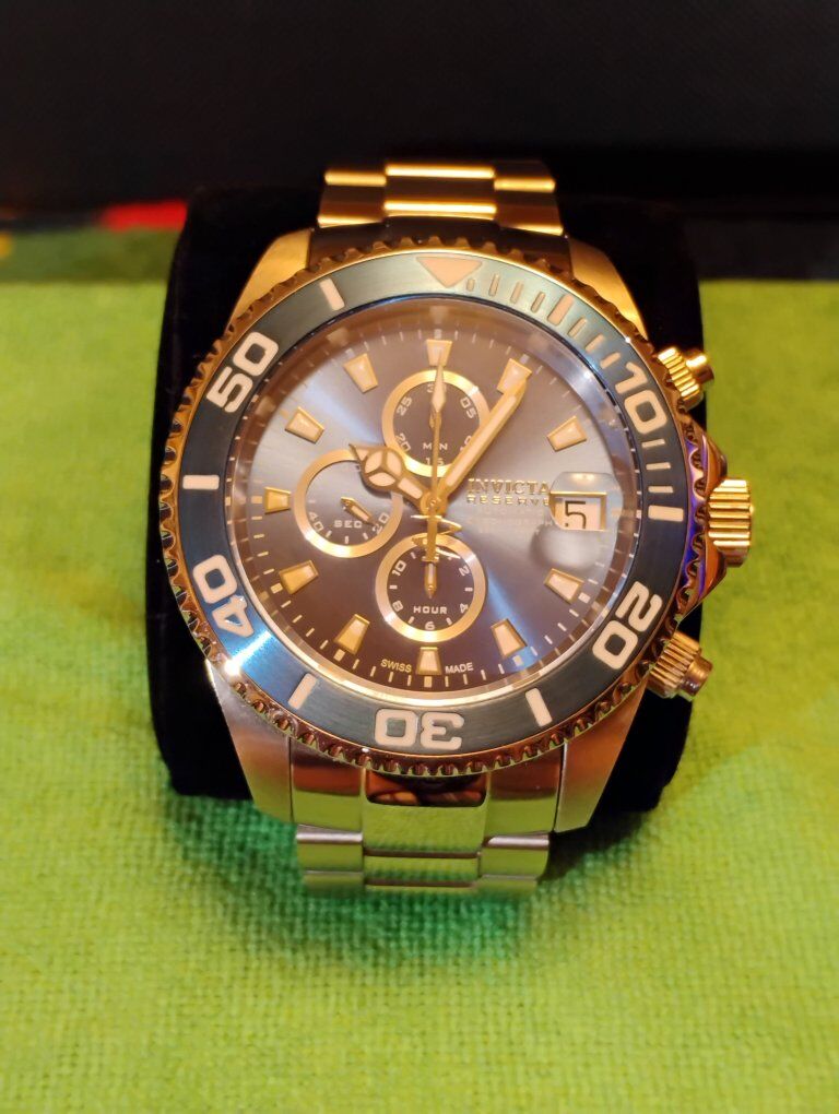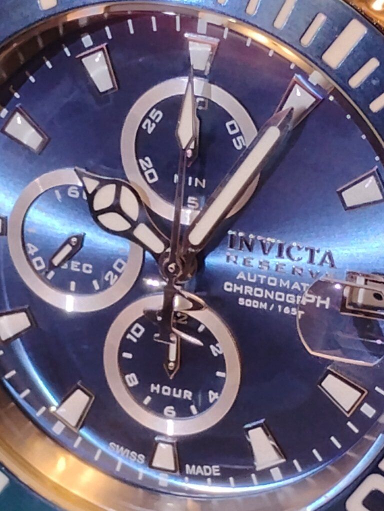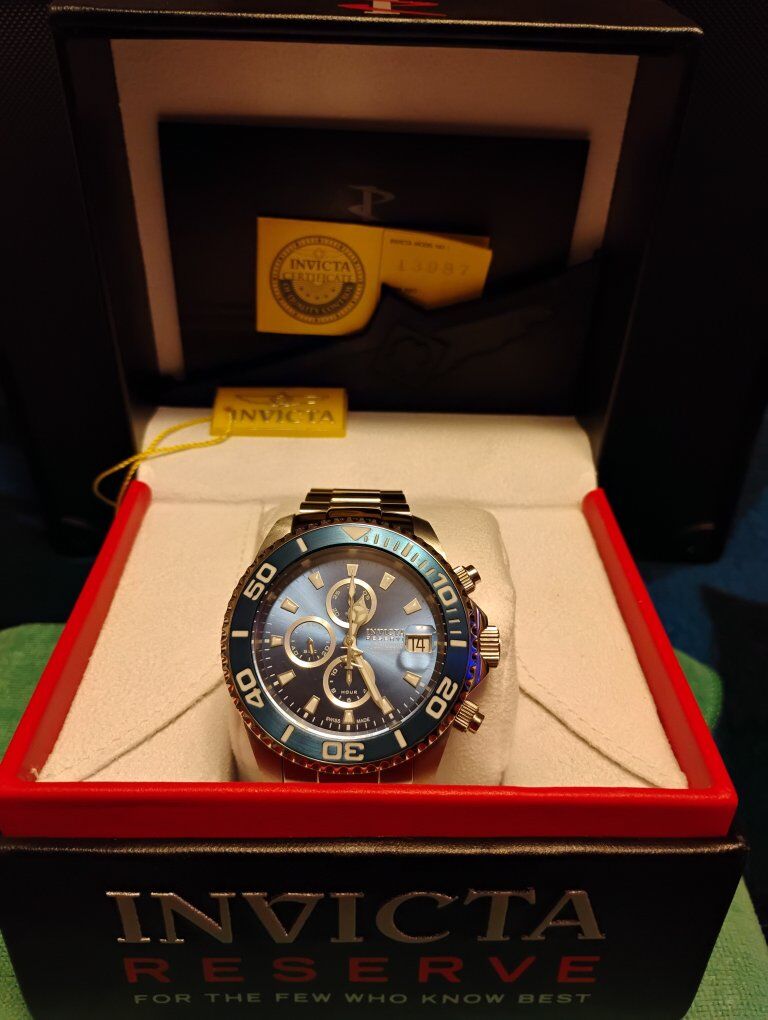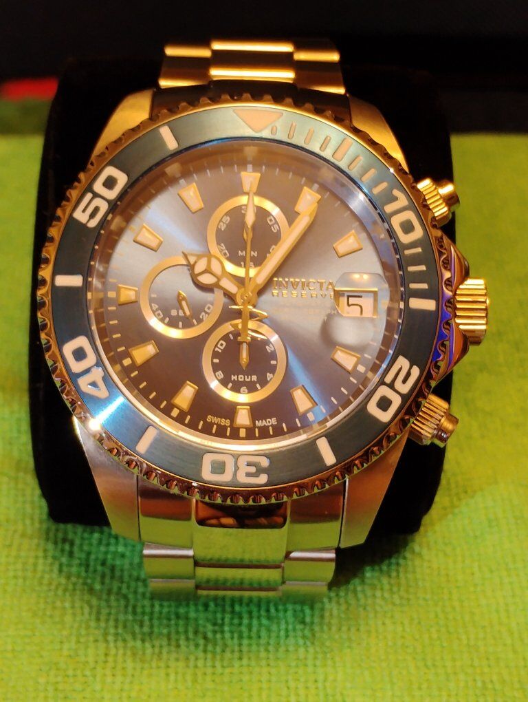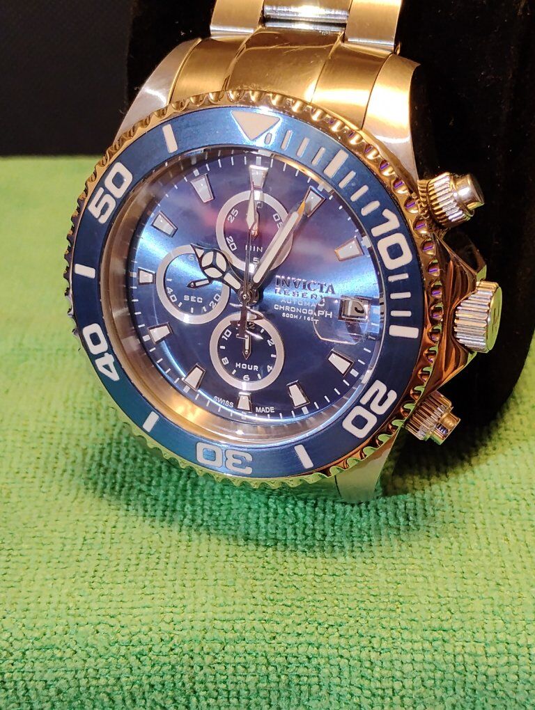 Invicta Reserve Pro Diver Elite Automatic Chronograph Watch. This is a large heavy timepiece, silver tone -52mm case size, 15mm thick. Rare hard to find watch, model number 13987 100% Swiss made watch, excellent condition. Decorated main plate and Geneva stripes on rotor, Swiss ETA- Val-Granges Cal. A07.211-25 jewel automatic chronograph movement. This movement is based on the Swiss ETA Valjoux 7750 model, but heavy duty made for larger watches. Arctic Blue dial color, mercedes style hands, cyclops magnifier over date, 3 hand day and 3 subdials- seconds, minutes and hours. Lumed bezel, hands and hour markers. All 316L stainless steel case and bracelet, arctic blue sunburst dial and bezel. Flame fusion crystals, water resistant 500 meters (1650 feet), screw down crowns, uni directional divers bezel, dual deployent decorated bracelet clasp. Comes with boxes and papers. Serious buyers only please.