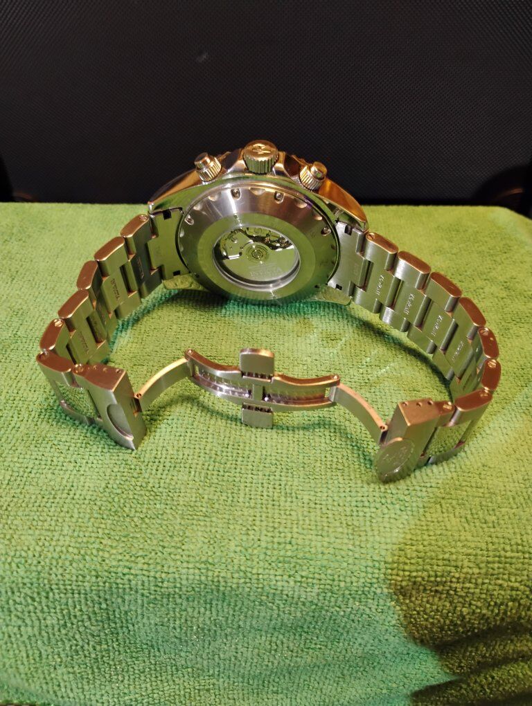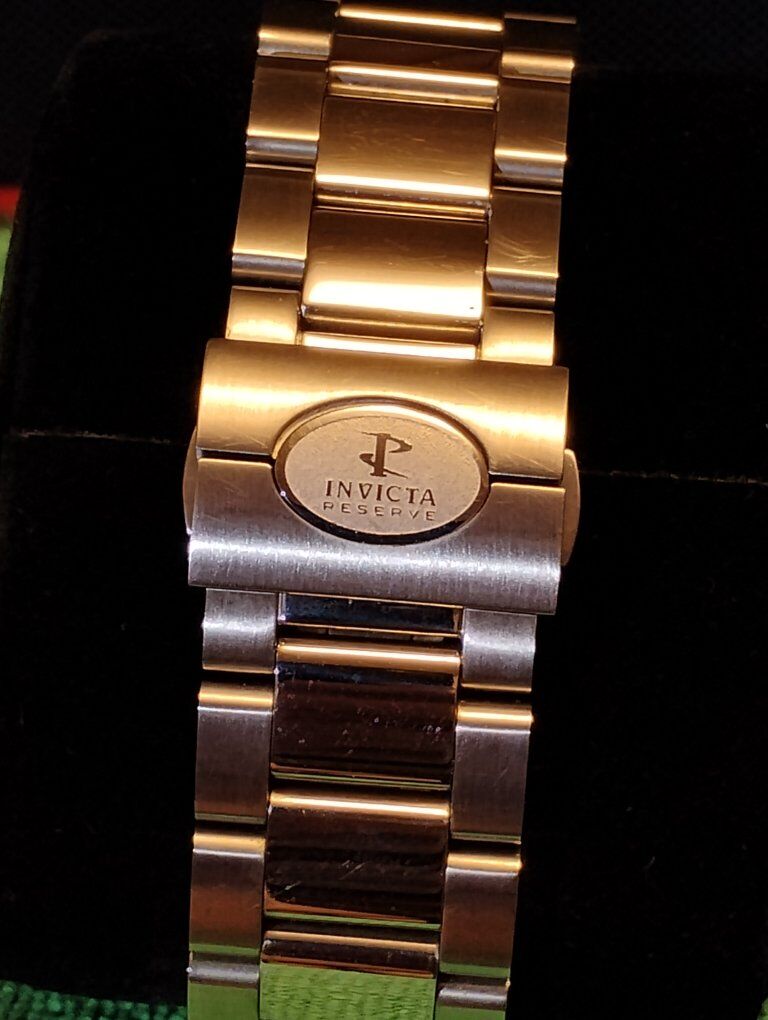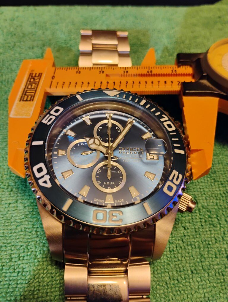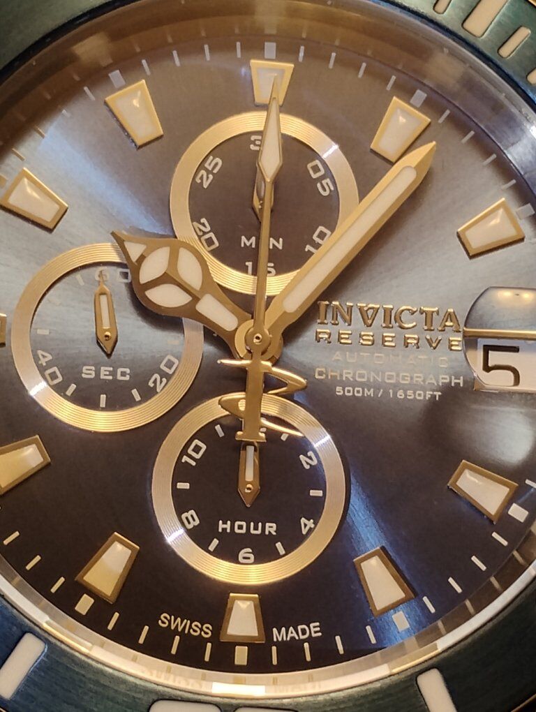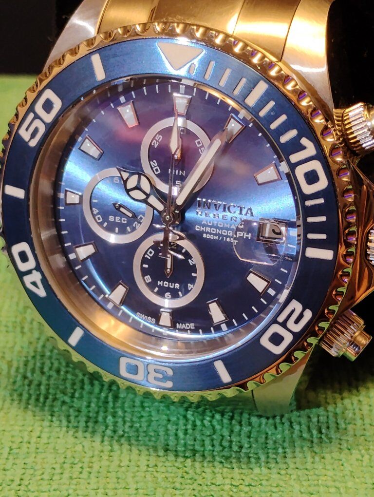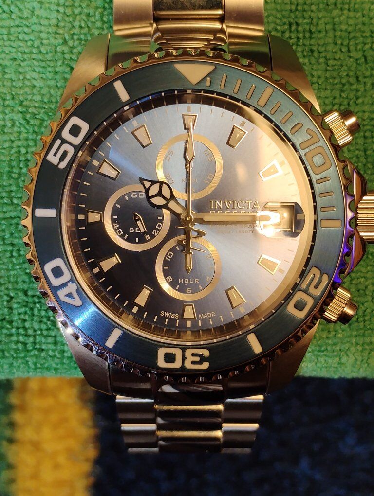Invicta Reserve Pro Diver Elite Automatic Chronograph Watch. This is a large heavy timepiece, silver tone -52mm case size, 15mm thick. Rare hard to find watch, model number 13987 100% Swiss made watch, excellent condition. Decorated main plate and Geneva stripes on rotor, Swiss ETA- Val-Granges Cal. A07.211-25 jewel automatic chronograph movement. This movement is based on the Swiss ETA Valjoux 7750 model, but heavy duty made for larger watches. Arctic Blue dial color, mercedes style hands, cyclops magnifier over date, 3 hand day and 3 subdials- seconds, minutes and hours. Lumed bezel, hands and hour markers. All 316L stainless steel case and bracelet, arctic blue sunburst dial and bezel. Flame fusion crystals, water resistant 500 meters (1650 feet), screw down crowns, uni directional divers bezel, dual deployent decorated bracelet clasp. Comes with boxes and papers. Serious buyers only please.