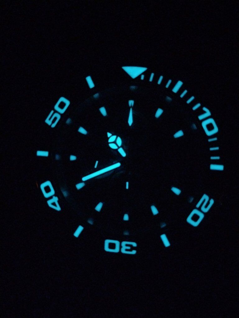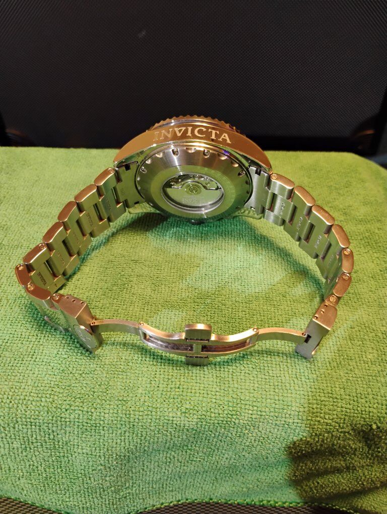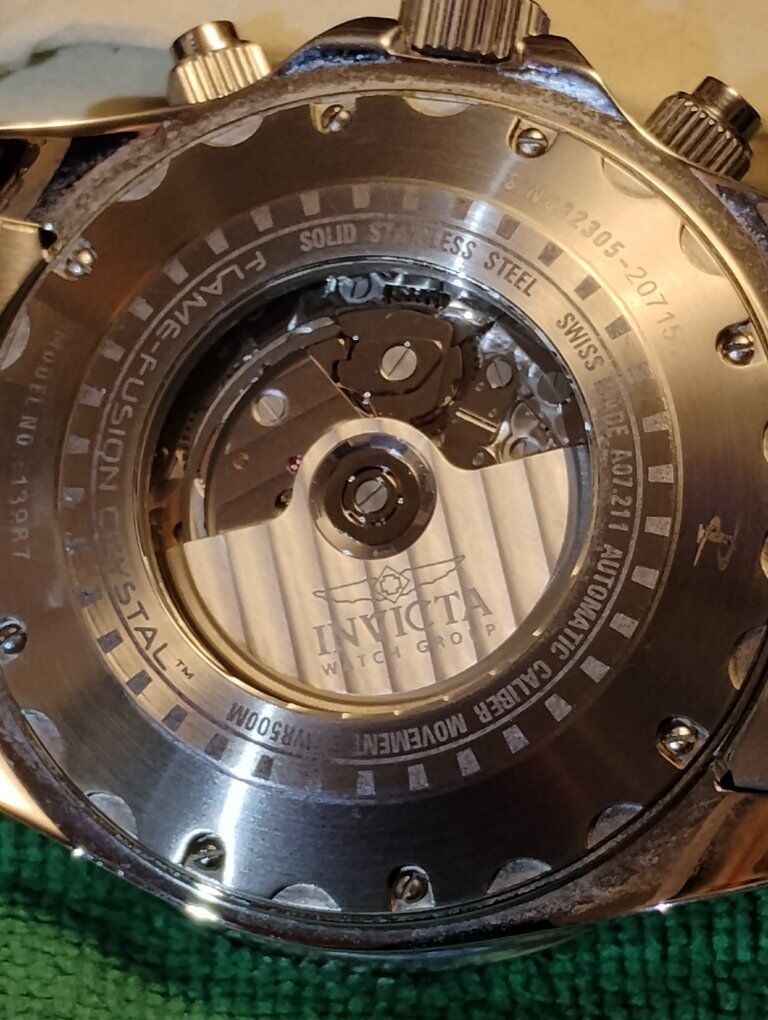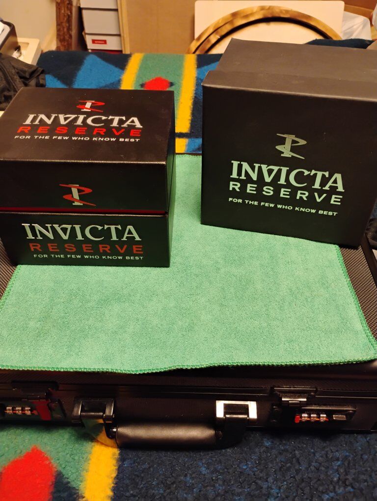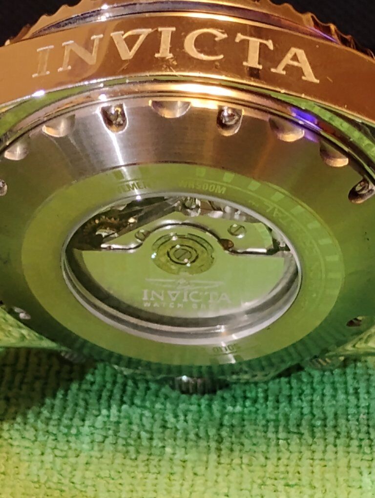 Invicta Reserve Pro Diver Elite Automatic Chronograph Watch. This is a large heavy timepiece, silver tone -52mm case size, 15mm thick. Rare hard to find watch, model number 13987 100% Swiss made watch, excellent condition. Decorated main plate and Geneva stripes on rotor, Swiss ETA- Val-Granges Cal. A07.211-25 jewel automatic chronograph movement. This movement is based on the Swiss ETA Valjoux 7750 model, but heavy duty made for larger watches. Arctic Blue dial color, mercedes style hands, cyclops magnifier over date, 3 hand day and 3 subdials- seconds, minutes and hours. Lumed bezel, hands and hour markers. All 316L stainless steel case and bracelet, arctic blue sunburst dial and bezel. Flame fusion crystals, water resistant 500 meters (1650 feet), screw down crowns, uni directional divers bezel, dual deployent decorated bracelet clasp. Comes with boxes and papers. Serious buyers only please.