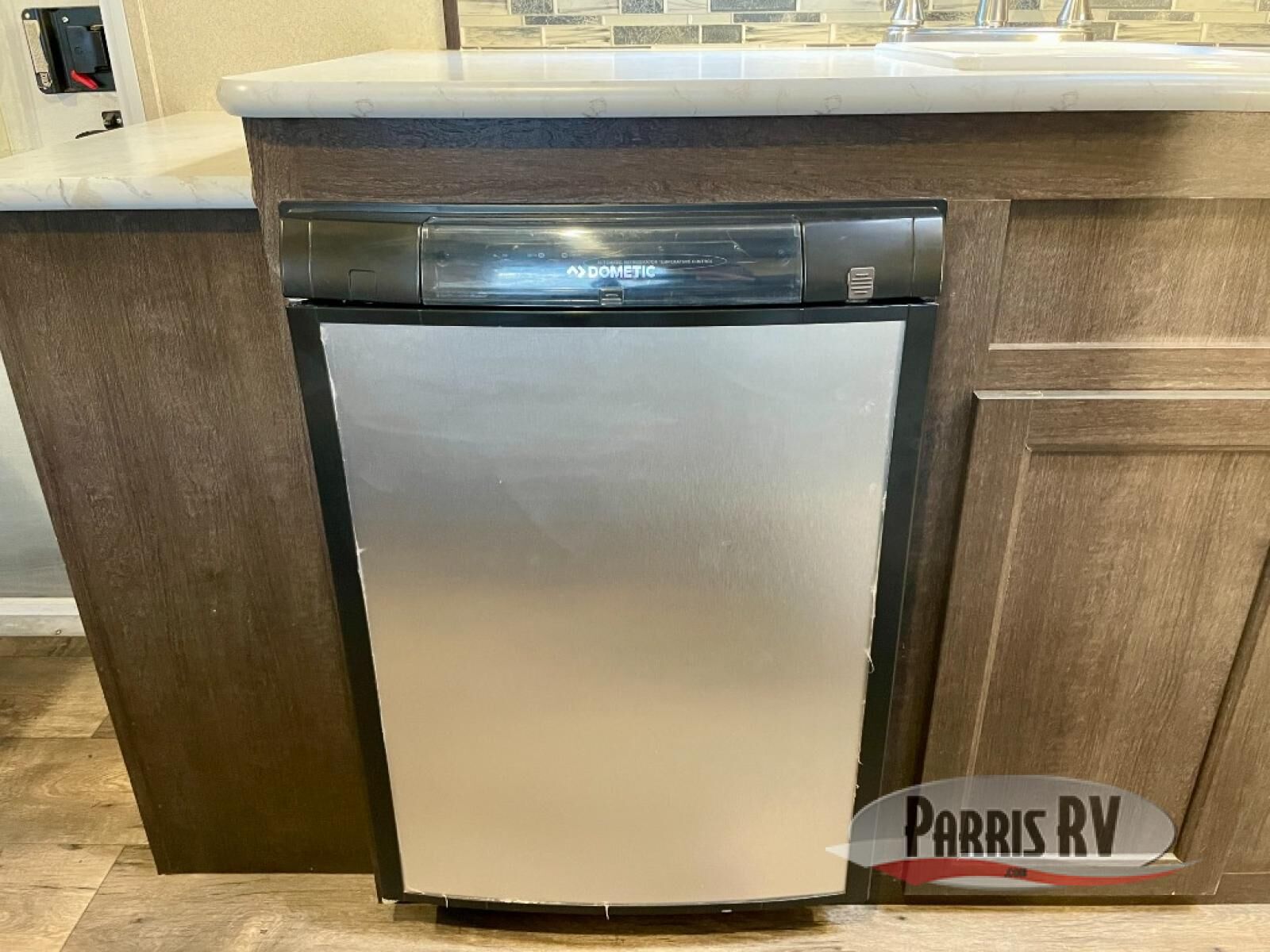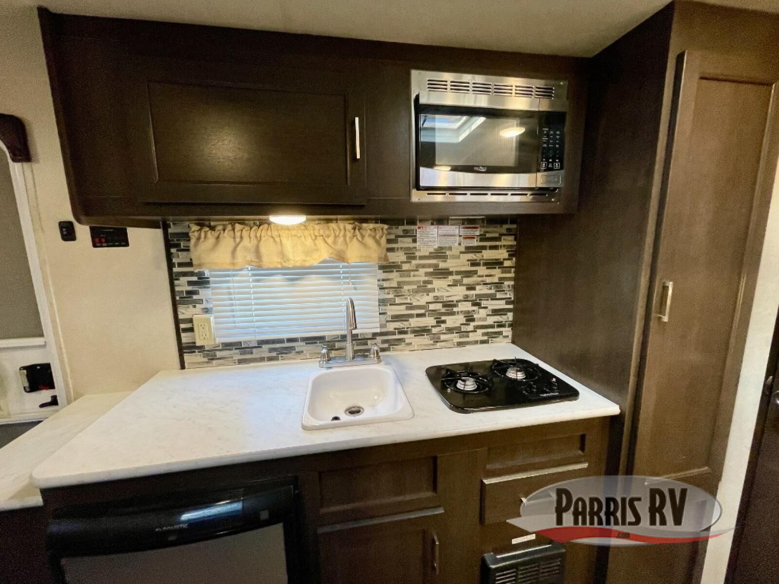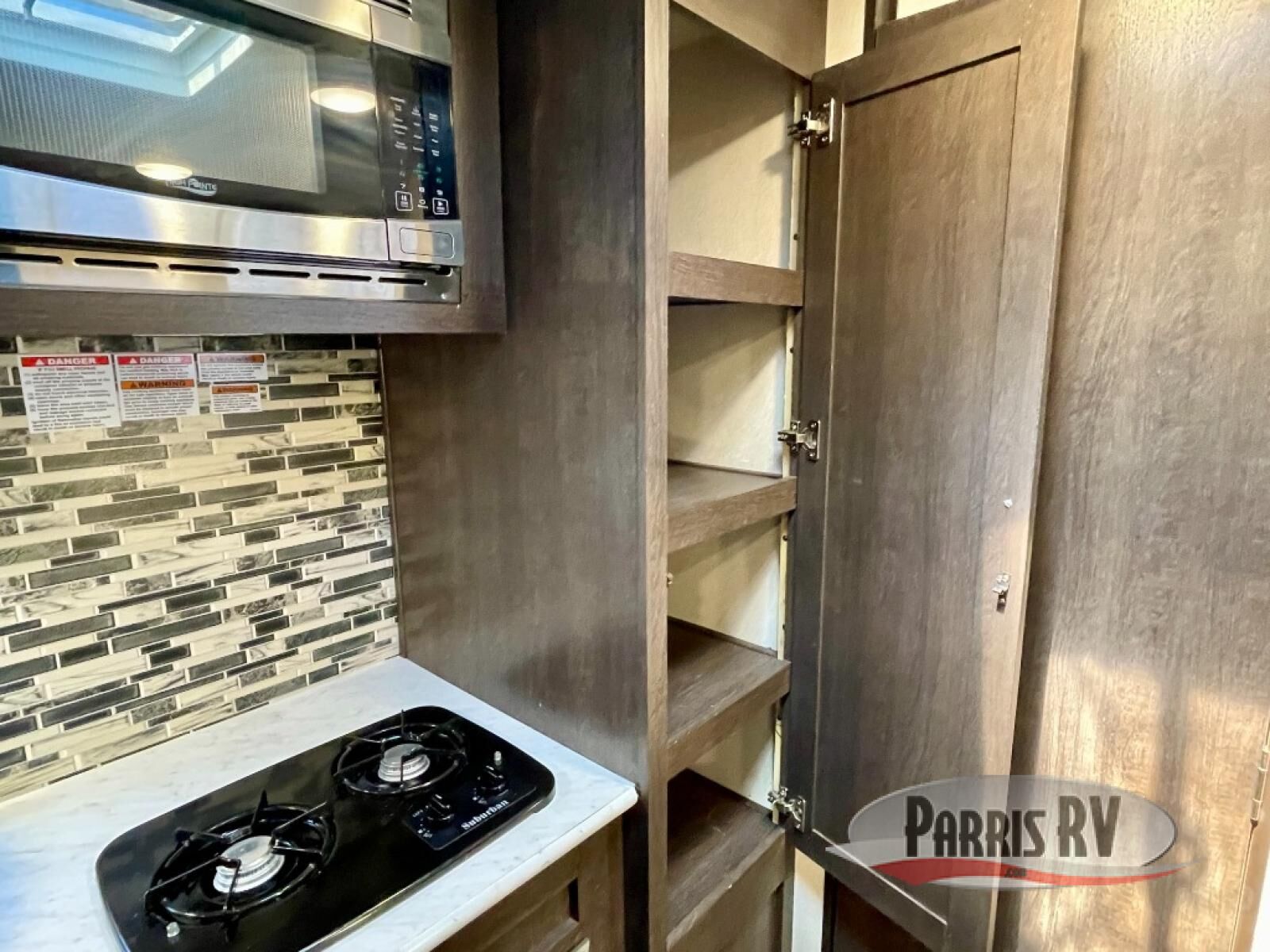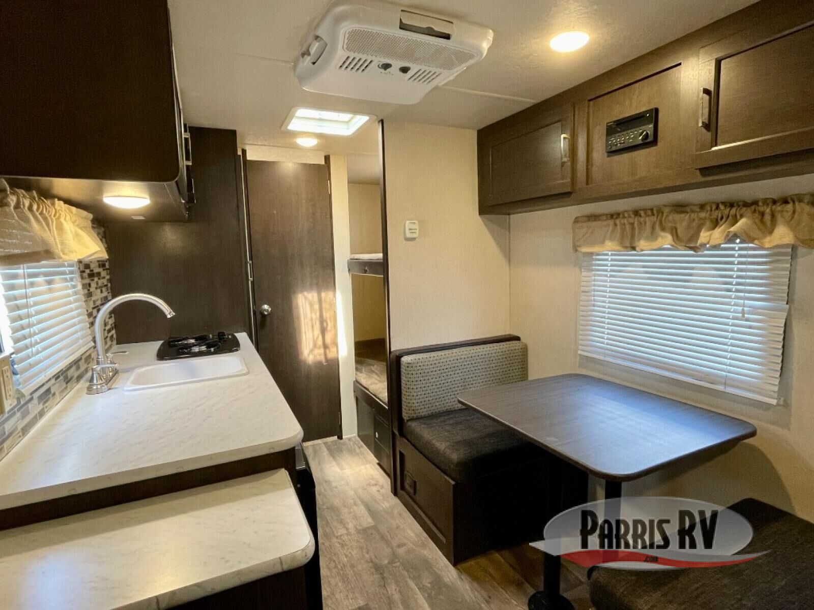 To the left of the entrance is a wardrobe, refrigerator, microwave, overhead cabinets, single sink, two burner range, and a pantry. The opposite side of the trailer offers a two person dinette with overhead cabinets.