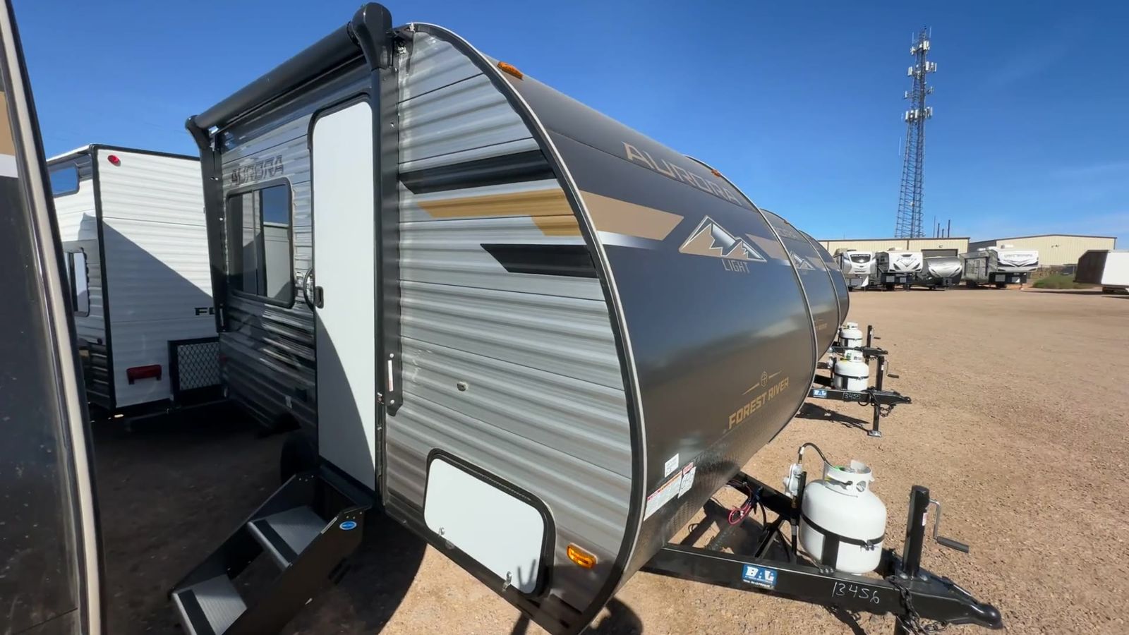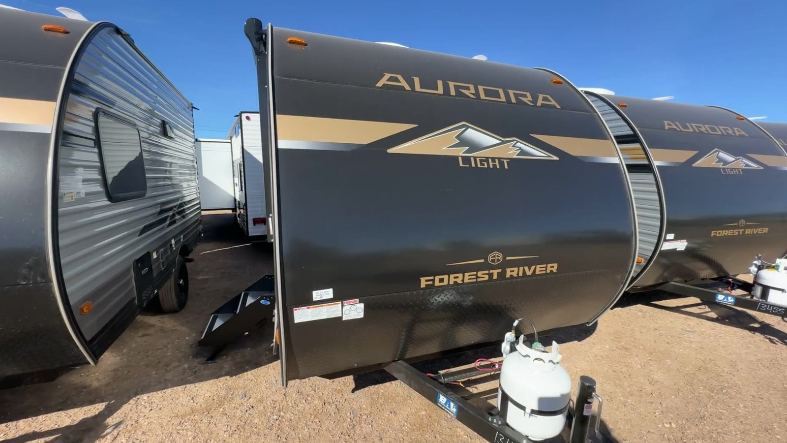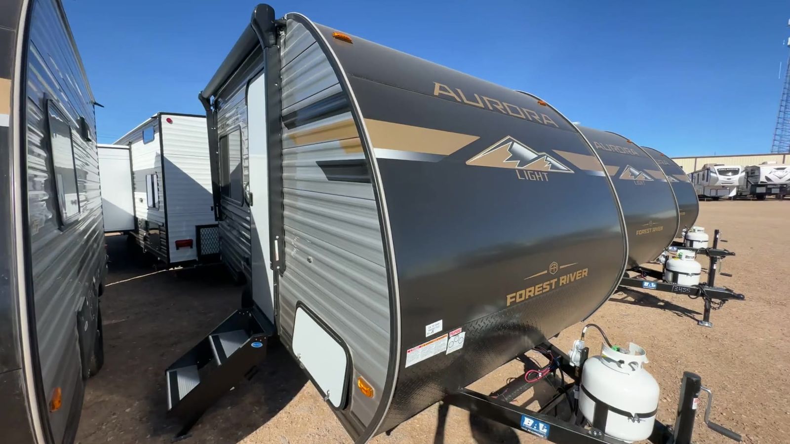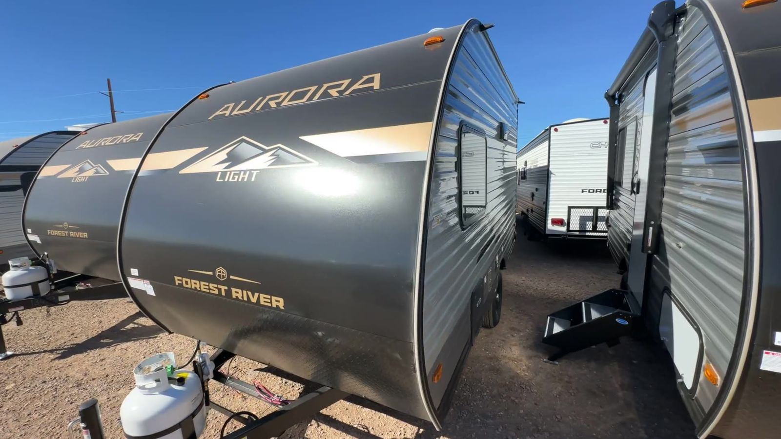 Forest River Aurora Light travel trailer 13RDX highlights: 54" x 74" Queen Bed Two Burner Gas Range Sleeps Three Exterior Storage This lightweight travel trailer includes everything you need for comfortable camping trips at the lake. You can make your meals on the two burner cooktop or in the stainless steel microwave, and a 3.3 cu. ft. 12V refrigerator will keep leftovers fresh. A front queen bed provides a great night's rest, and there is a 29" booth dinette that will double as both dining and additional sleeping space. And a private bath with a 24" x 32" shower and toilet will let you easily freshen up without having to use the camp's facilities! Comfortability, usability, and quality is what you will find in each one of these Forest River Aurora Light travel trailers! They are designed with a superior build and packed full with industry leading, functional, and distinctive standard features. The diamond plate rock guard will protect your unit from road debris and the nitrogen filled radial tires, which keep their pressure longer, offer better fuel economy. You will also find upgraded JBL Elite exterior speaker outside, an electric awning with multicolor lights and remote, plus flush mount baggage doors for easy packing. The interiors are beautifully designed with matte black kitchen and bath faucets, black nightshades in the living room, and GE kitchen appliances!