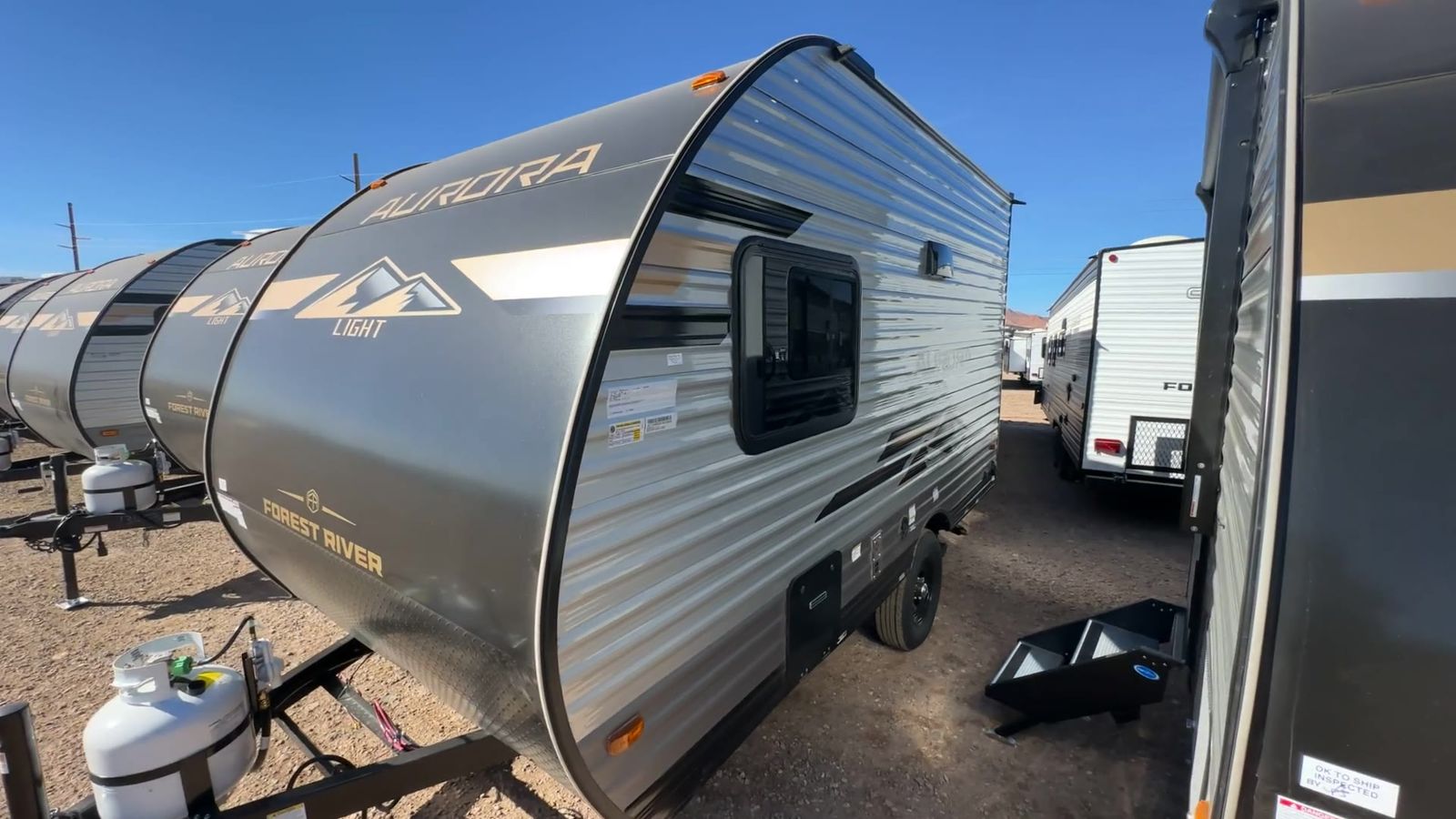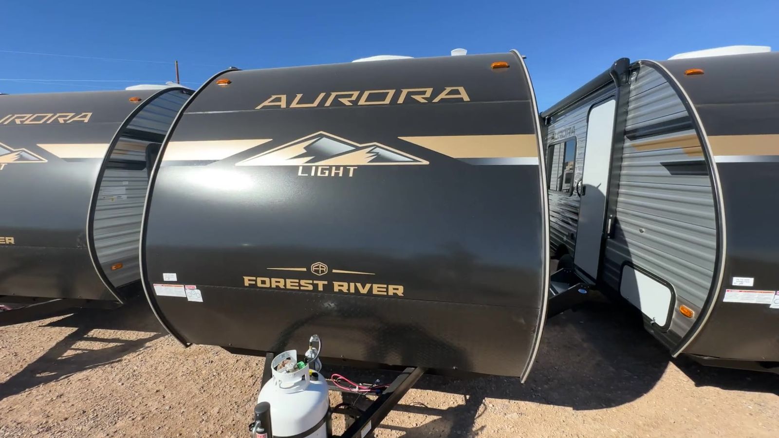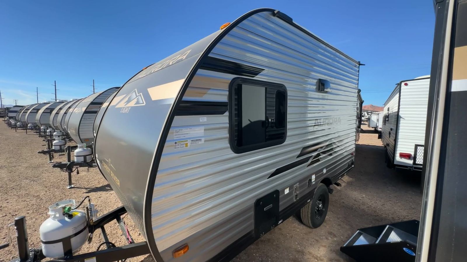 Forest River Aurora Light travel trailer 13RDX highlights: 54" x 74" Queen Bed Two Burner Gas Range Sleeps Three Exterior Storage This lightweight travel trailer includes everything you need for comfortable camping trips at the lake. You can make your meals on the two burner cooktop or in the stainless steel microwave, and a 3.3 cu. ft. 12V refrigerator will keep leftovers fresh. A front queen bed provides a great night's rest, and there is a 29" booth dinette that will double as both dining and additional sleeping space. And a private bath with a 24" x 32" shower and toilet will let you easily freshen up without having to use the camp's facilities! Comfortability, usability, and quality is what you will find in each one of these Forest River Aurora Light travel trailers! They are designed with a superior build and packed full with industry leading, functional, and distinctive standard features. The diamond plate rock guard will protect your unit from road debris and the nitrogen filled radial tires, which keep their pressure longer, offer better fuel economy. You will also find upgraded JBL Elite exterior speaker outside, an electric awning with multicolor lights and remote, plus flush mount baggage doors for easy packing. The interiors are beautifully designed with matte black kitchen and bath faucets, black nightshades in the living room, and GE kitchen appliances!