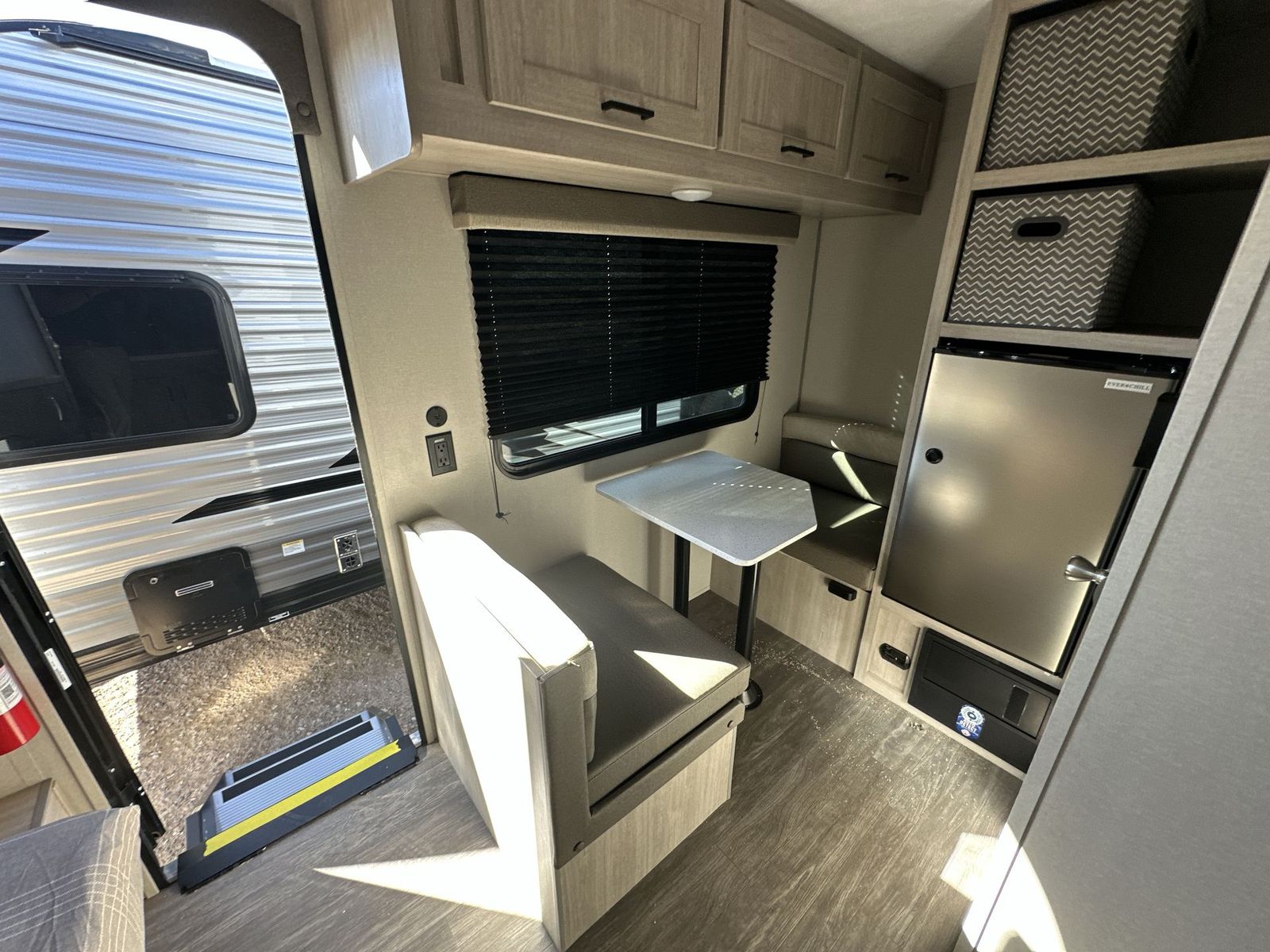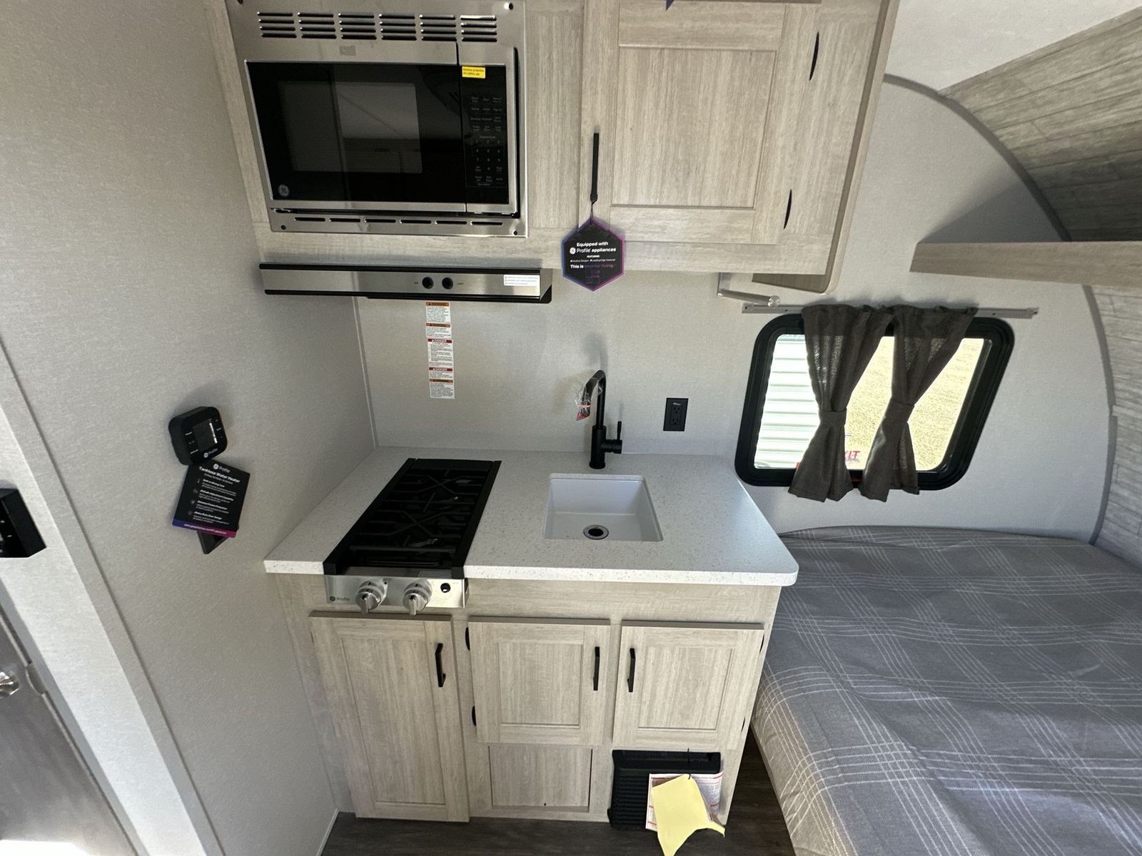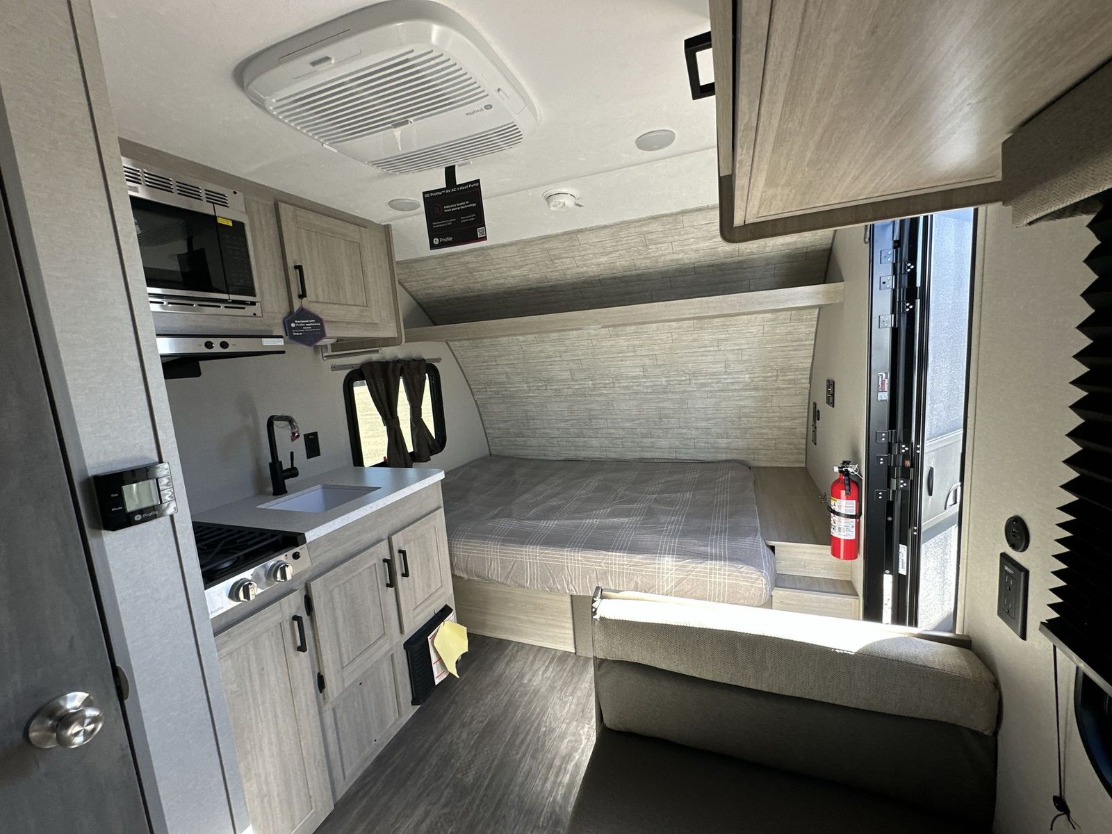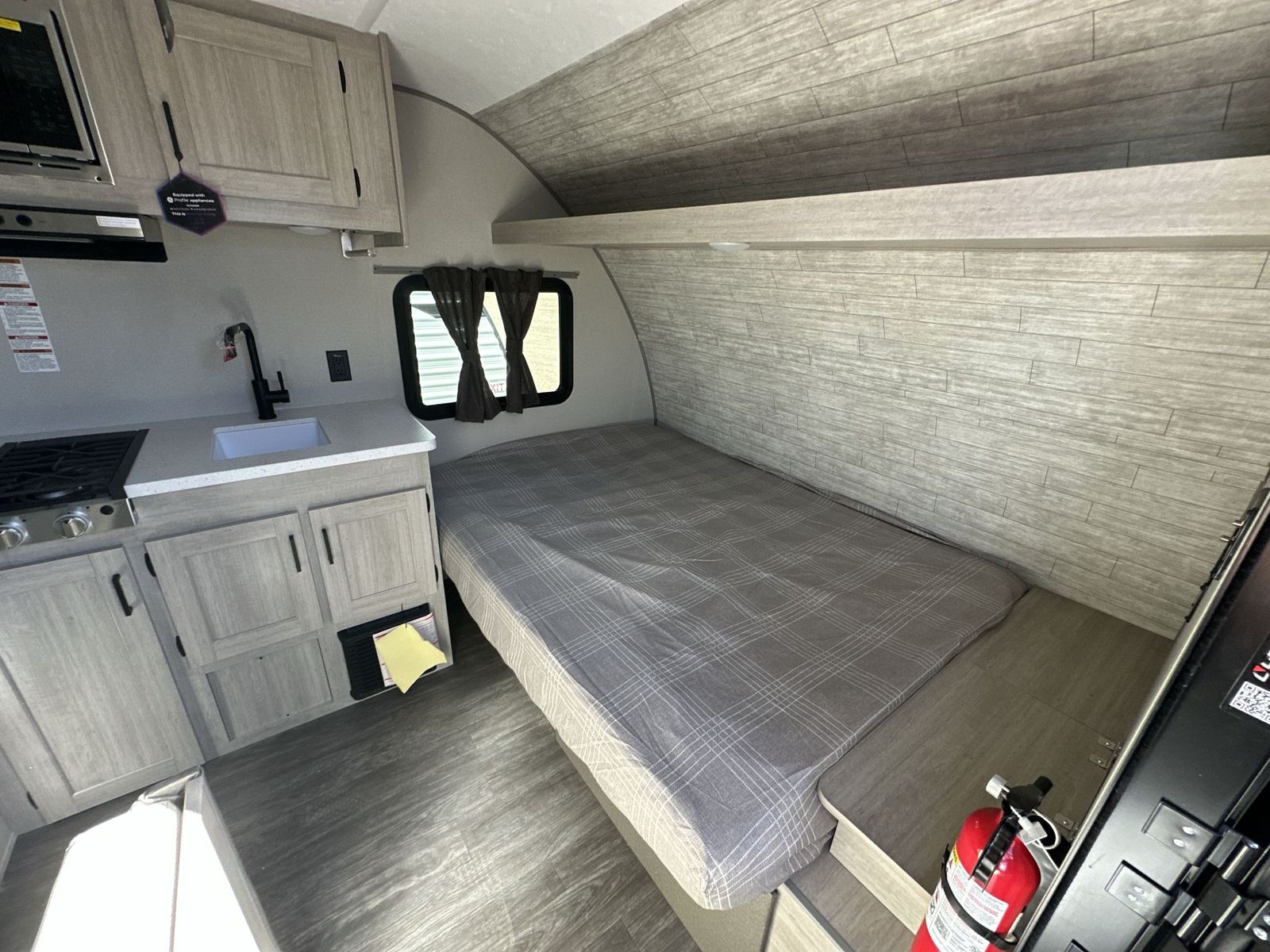 Forest River Aurora Light travel trailer 13RDX highlights: 54" x 74" Queen Bed Two Burner Gas Range Sleeps Three Exterior Storage This lightweight travel trailer includes everything you need for comfortable camping trips at the lake. You can make your meals on the two burner cooktop or in the stainless steel microwave, and a 3.3 cu. ft. 12V refrigerator will keep leftovers fresh. A front queen bed provides a great night's rest, and there is a 29" booth dinette that will double as both dining and additional sleeping space. And a private bath with a 24" x 32" shower and toilet will let you easily freshen up without having to use the camp's facilities! Comfortability, usability, and quality is what you will find in each one of these Forest River Aurora Light travel trailers! They are designed with a superior build and packed full with industry leading, functional, and distinctive standard features. The diamond plate rock guard will protect your unit from road debris and the nitrogen filled radial tires, which keep their pressure longer, offer better fuel economy. You will also find upgraded JBL Elite exterior speaker outside, an electric awning with multicolor lights and remote, plus flush mount baggage doors for easy packing. The interiors are beautifully designed with matte black kitchen and bath faucets, black nightshades in the living room, and GE kitchen appliances!