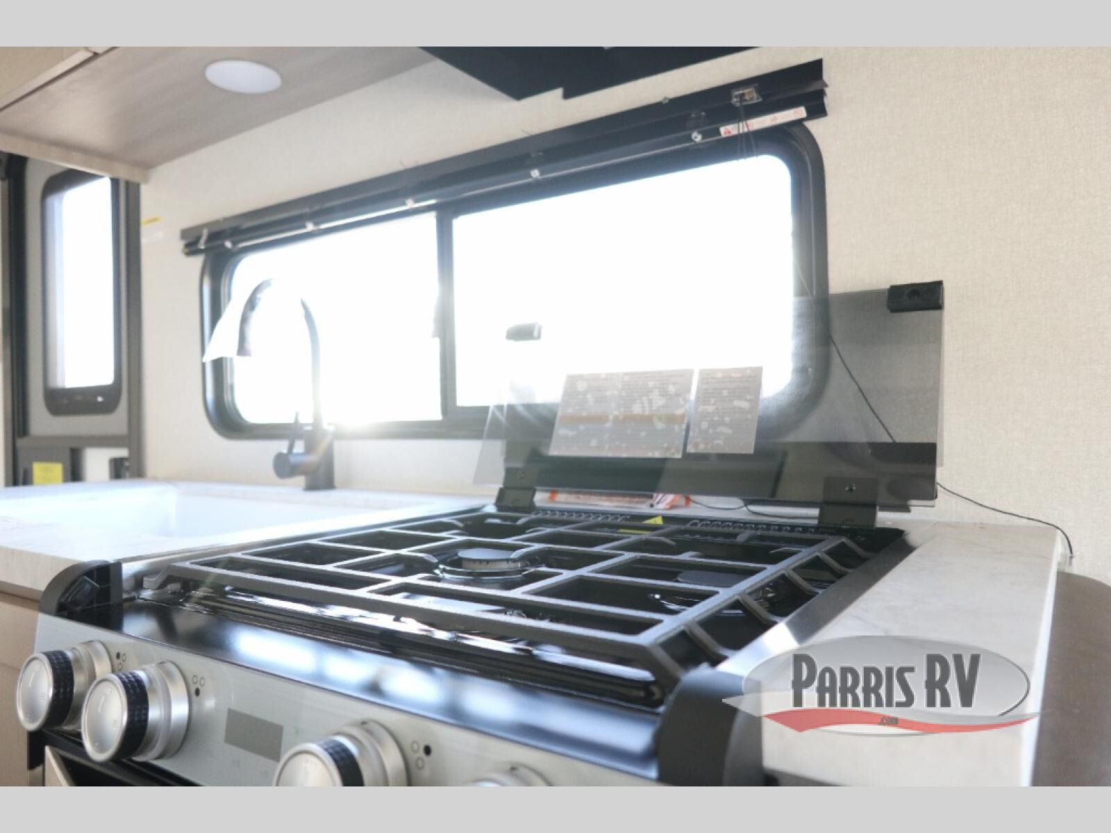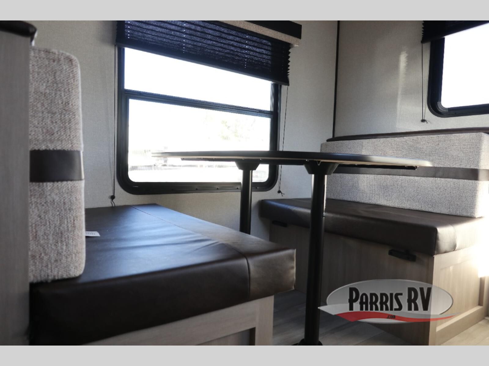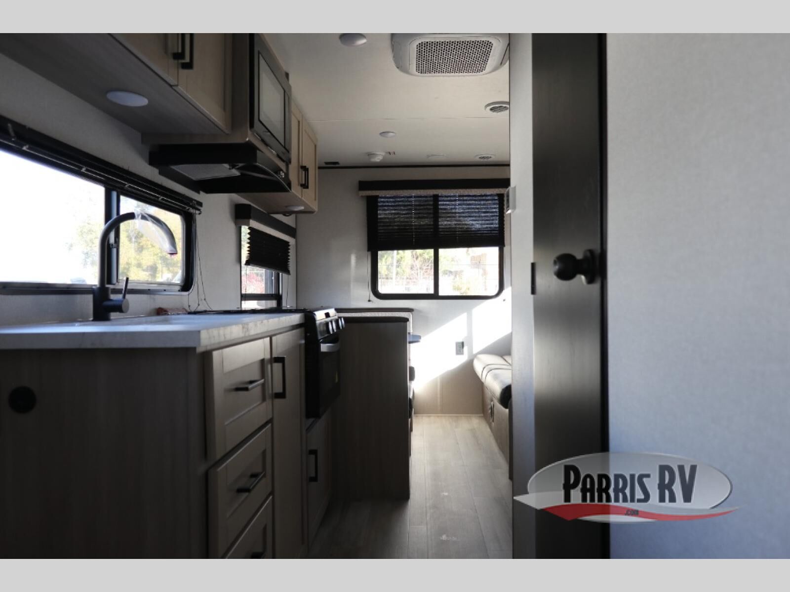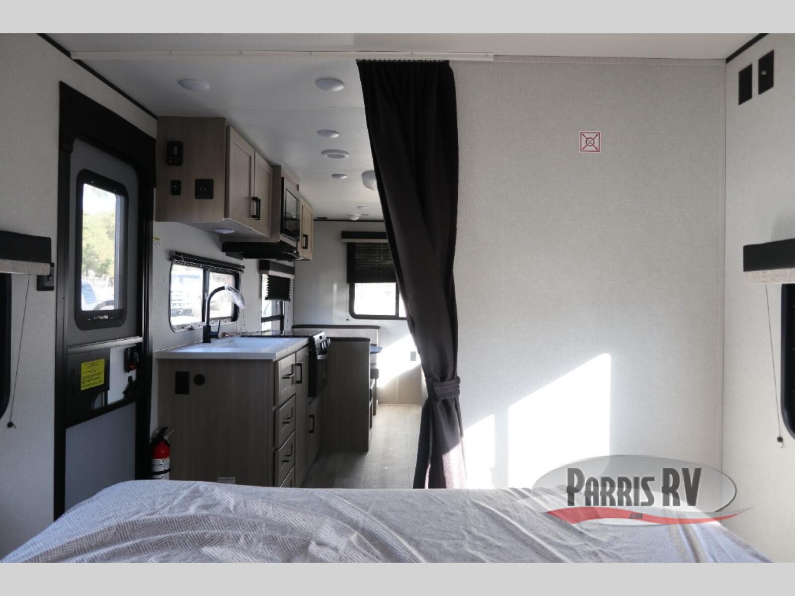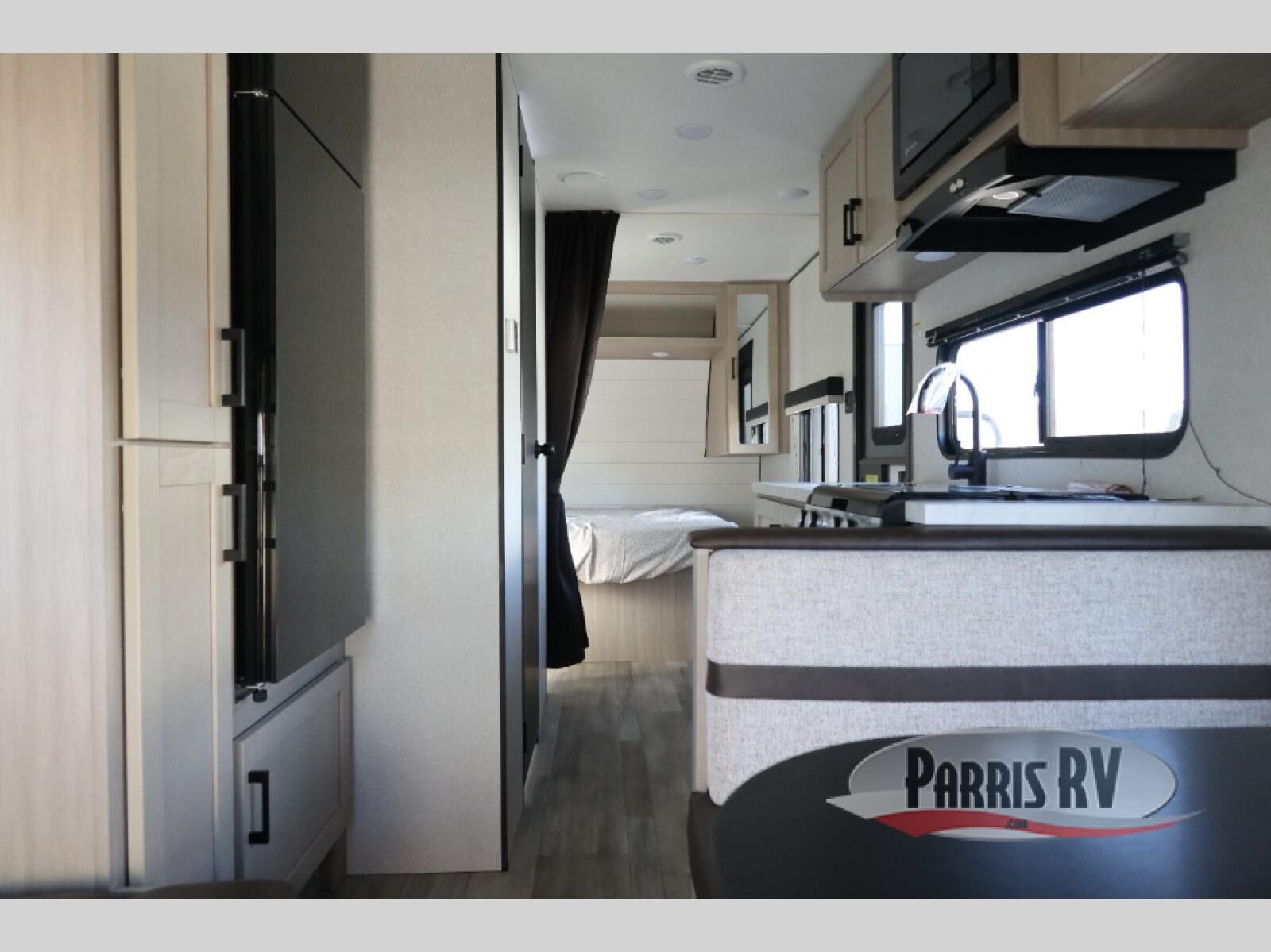 Weekend trips to the campground will be made unforgettable in this travel trailer for five to six. You will enjoy your own space in the front bedroom with a privacy curtain, RV queen bed and dual bedside wardrobes to keep your things tidy. If you have any guests staying over, then can convert the jack knife sofa and booth dinette back into seating spaces for breakfast in the morning. Speaking of breakfast, you'll have a three-burner cooktop and microwave oven to cook eggs and bacon, plus an 8-cu. ft. 12V refrigerator and pantry for food storage.