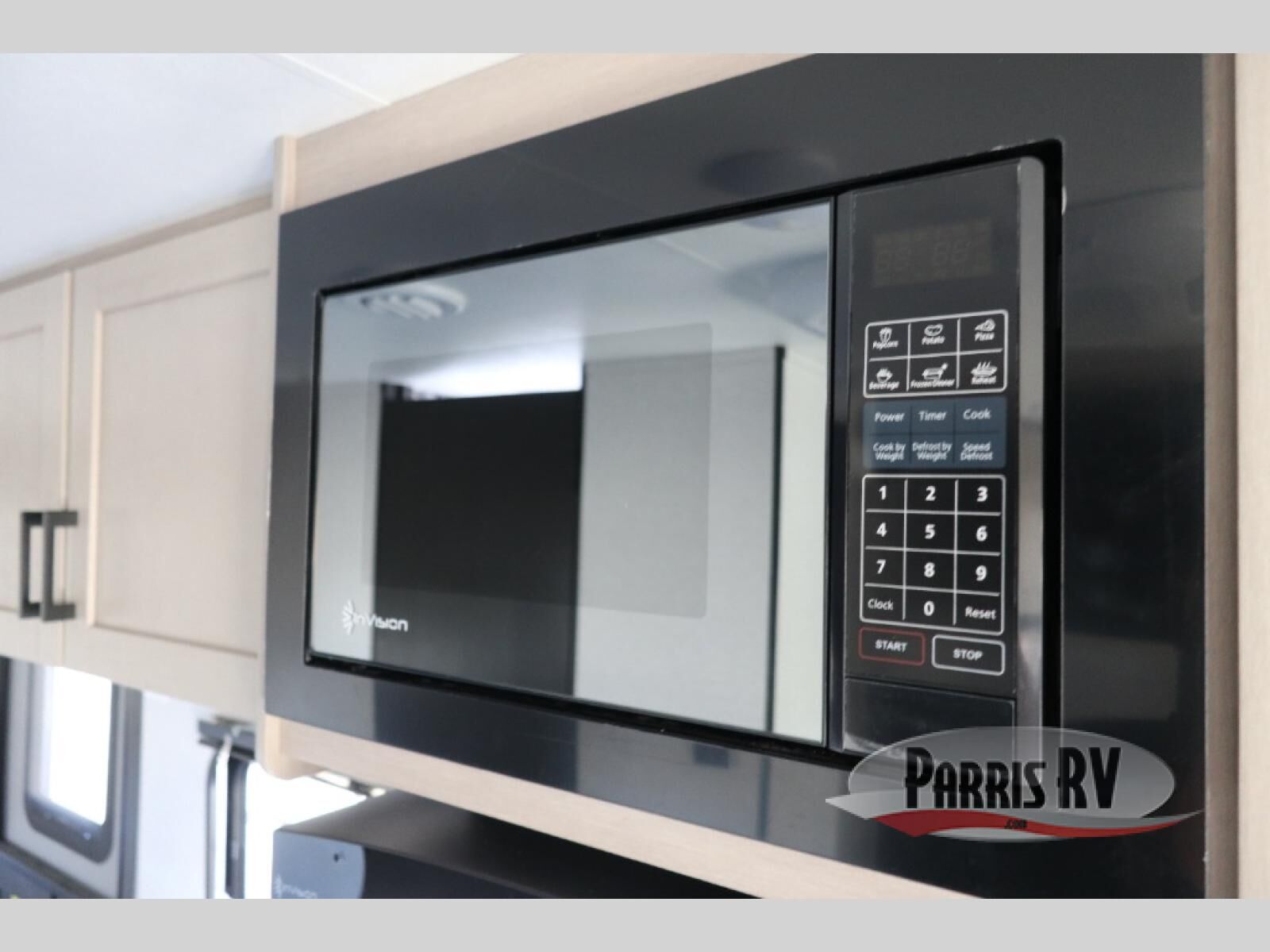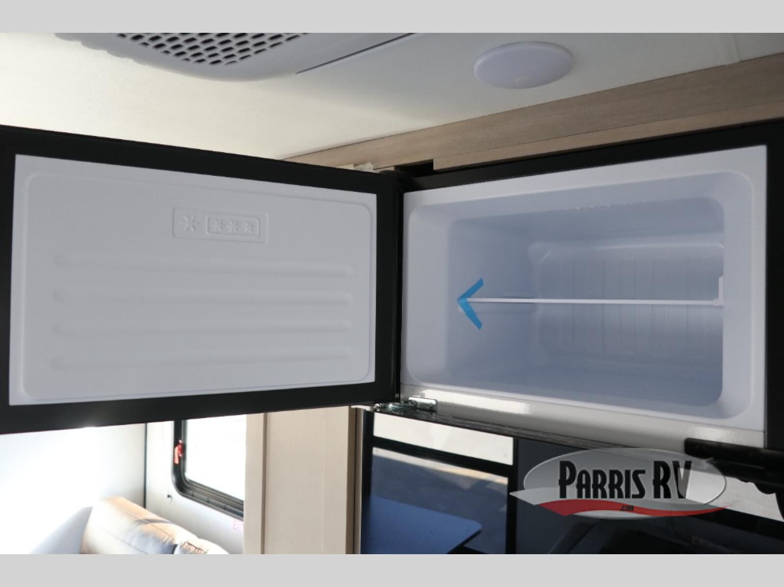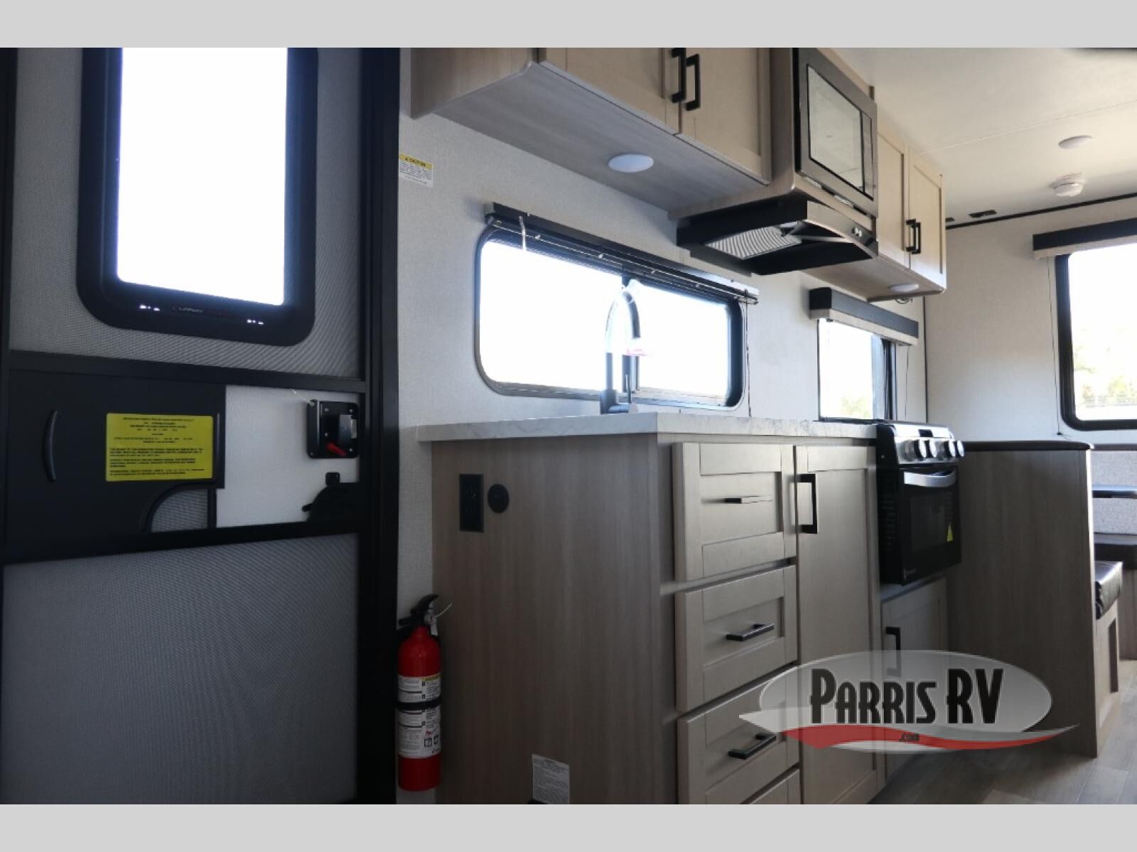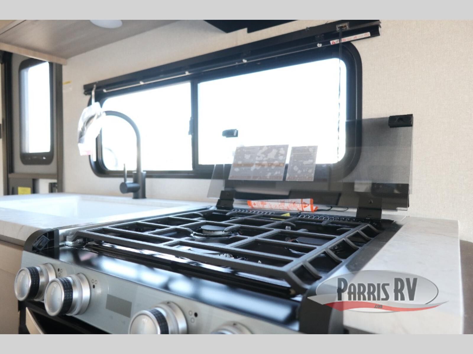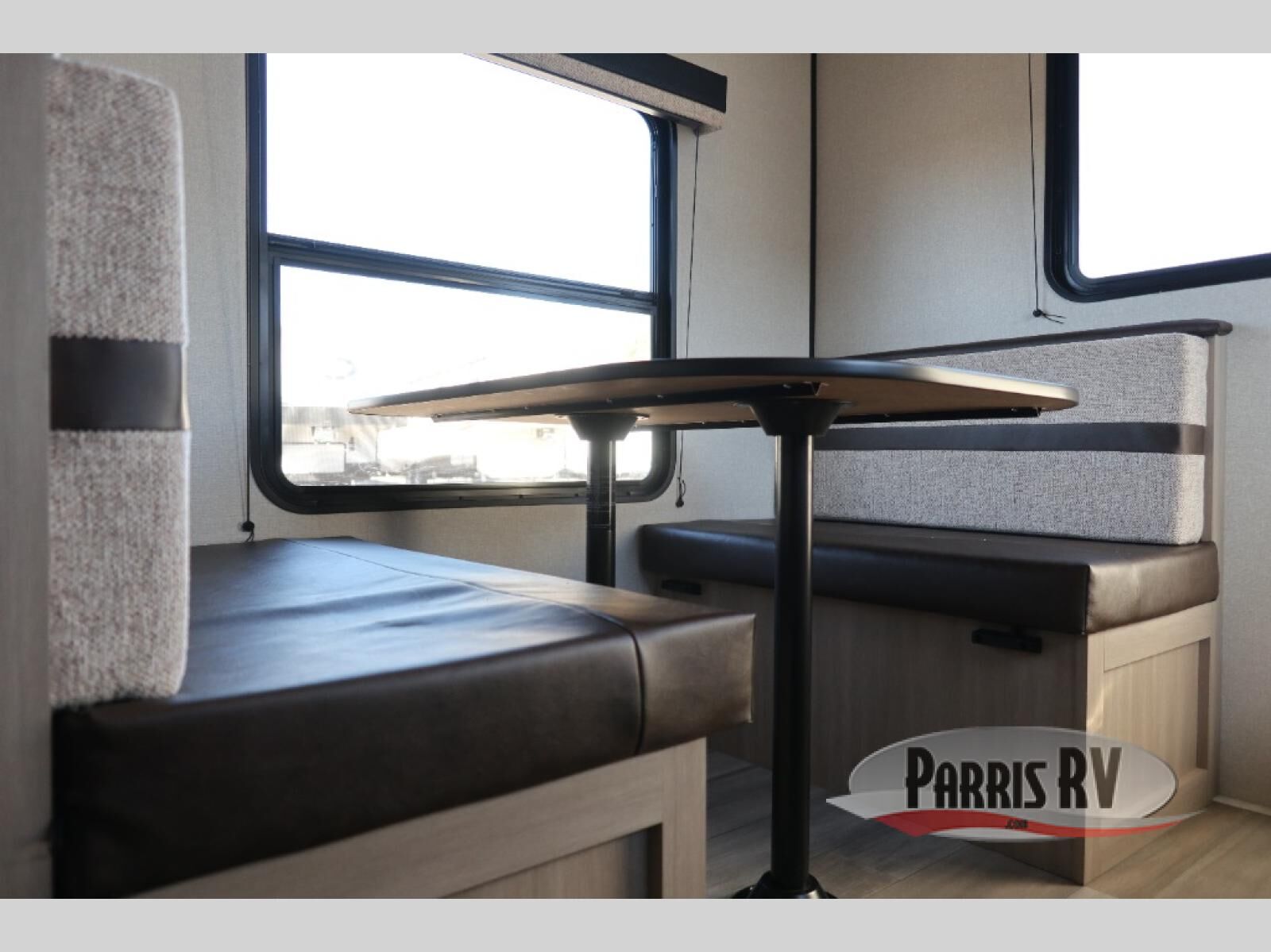 Weekend trips to the campground will be made unforgettable in this travel trailer for five to six. You will enjoy your own space in the front bedroom with a privacy curtain, RV queen bed and dual bedside wardrobes to keep your things tidy. If you have any guests staying over, then can convert the jack knife sofa and booth dinette back into seating spaces for breakfast in the morning. Speaking of breakfast, you'll have a three-burner cooktop and microwave oven to cook eggs and bacon, plus an 8-cu. ft. 12V refrigerator and pantry for food storage.
