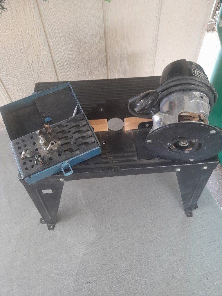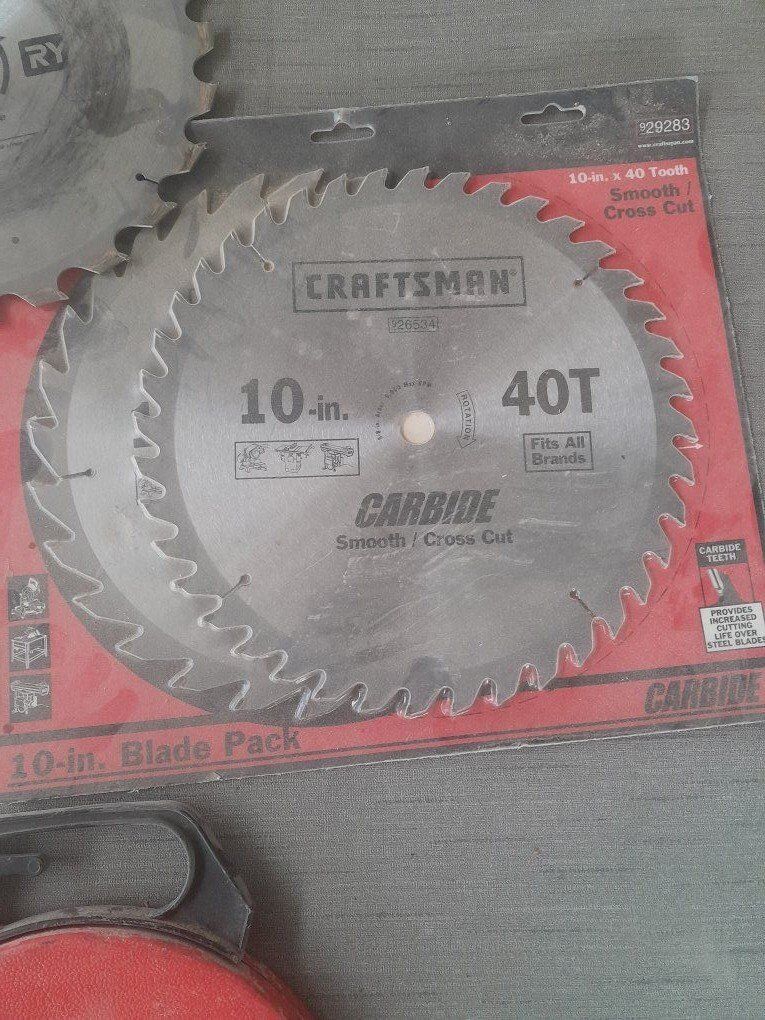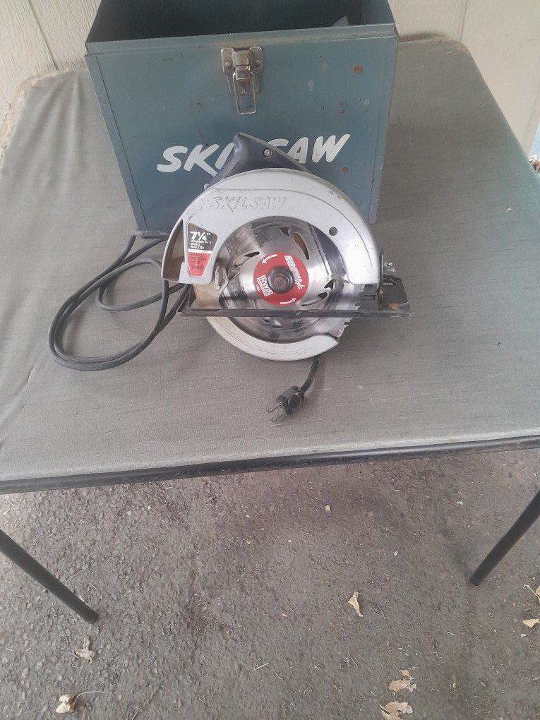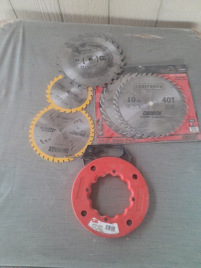 Skill saw with box extra blade $25 grinder buffer with buffing wheels $25 router table with router and some bits $25 saw blades of various sizes $30