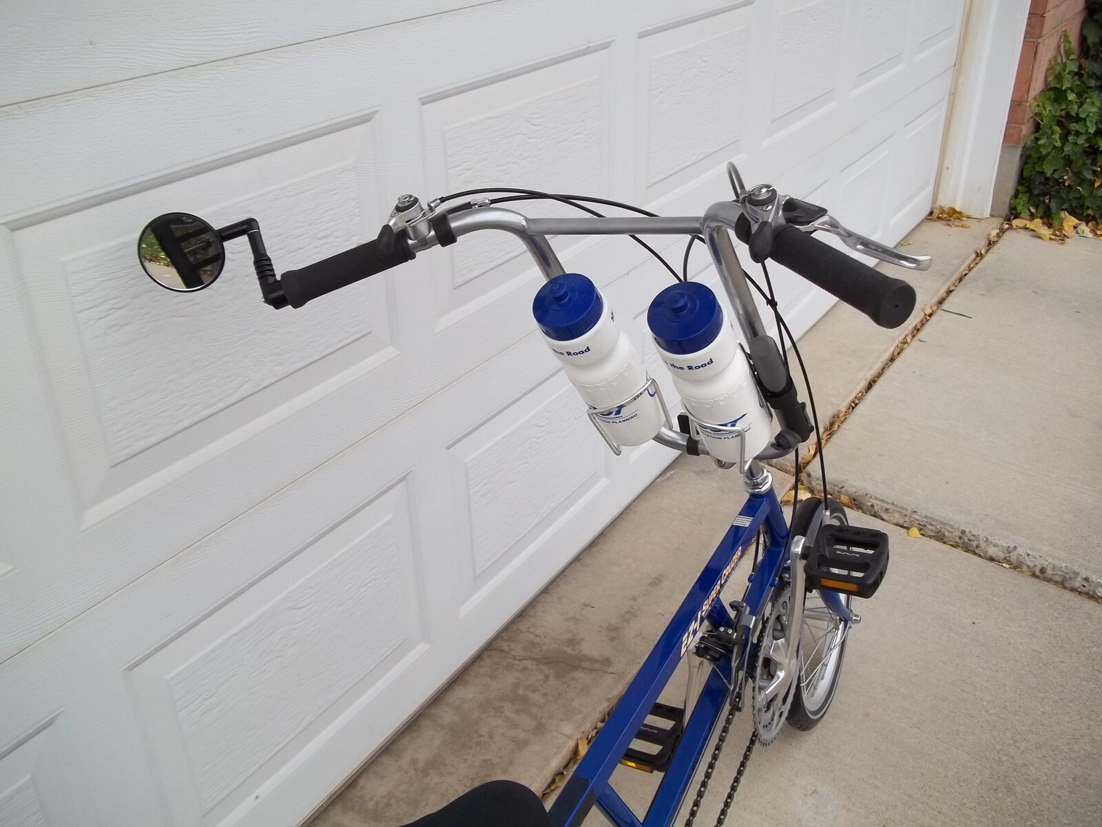 Has a triple chain ring up front with a 8 cog cassette on the rear for a 24-speed selection, using Shimano Deore XT derailleurs. Has SRAM grip shifters & brake levers. This is a two wheel recumbent with a 26" quick release rear wheel & a 20" quick release front wheel. Also has two water bottle cages mounted on the handle bar sides , rear luggage rack, side mirror, tire pump & front light.
