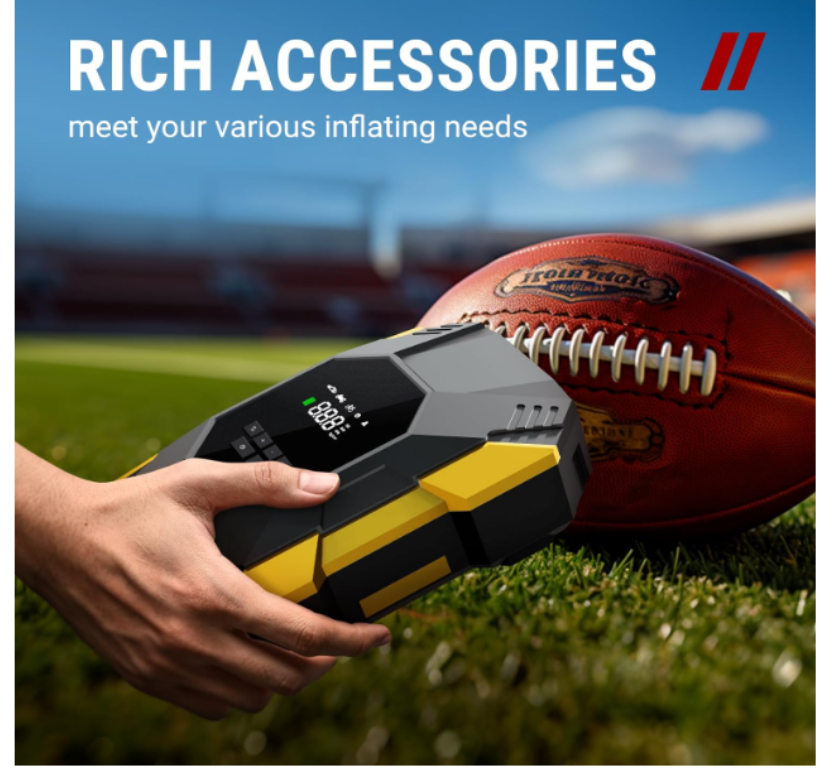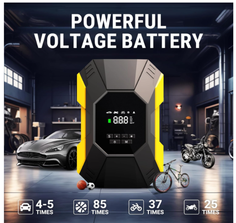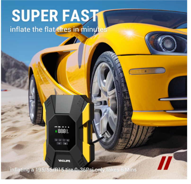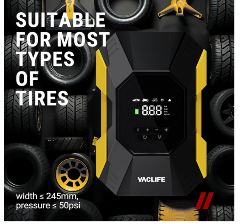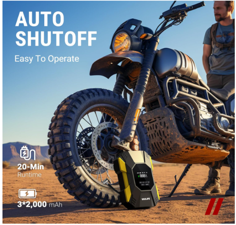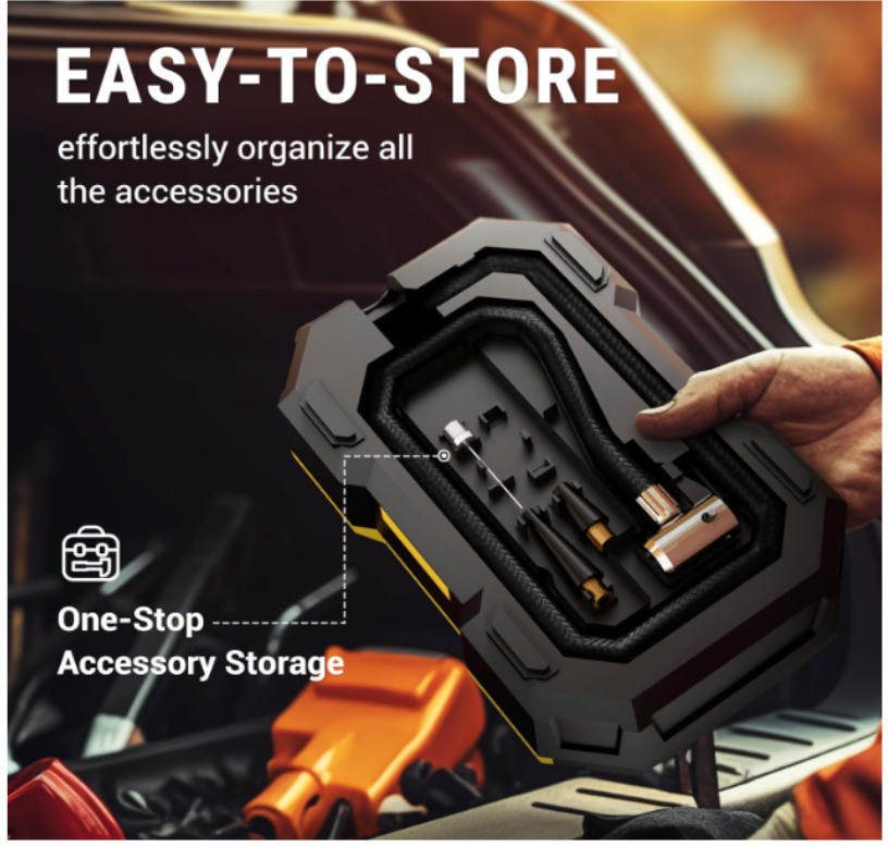 ZelleFAST INFLATING:This air compressor with portable design is a great solution for emergencies on the way. It can provide up to 150 psi pressure and refill a 195/55/R15 car tire from 0 to 35 psi less in than 6 mins. Besides, the auto-shutoff design also prevents over-inflating, making it safe to use. 4+N SMART MODES: This portable air compressor for car tires is convenient to use with 5 smart modes, easily meeting your various inflating needs! The 4 preset modes are car mode, motorcycle mode, bike mode, and ball mode, which facilitate the operation of the new beginners. Moreover, the manual mode enables you to set the desired pressure from 3-150psi according to different inflatables. CORDLESS & EASY-TO STORE: No external power supply is needed, This portable tire inflator for cars with a rechargeable battery pack can help you inflate most inflatables anytime and anywhere. On the bottom of the device, there's room for you to effortlessly organize all the accessories. No fear of missing the attachments anymore! LONG-LASTING POWER: This portable tire inflator is powered by three large-capacity batteries of 2,000mAh that can work continuously for up to 20mins after being fully charged in 3-4 hours. For maintaining its good performance, it's recommended to rest for 3-5 minutes after each 10-minute use. MULTIPLE ATTACHMENTS: This cordless tire inflator is a must-have for drivers, cyclists, and adventurers. With rich accessories included, this portable air pump can not only inflate car tires with width ≤ 245mm and pressure ≤ 50psi, but also refill tires of bikes, motorcycles, balls, and other inflatables!