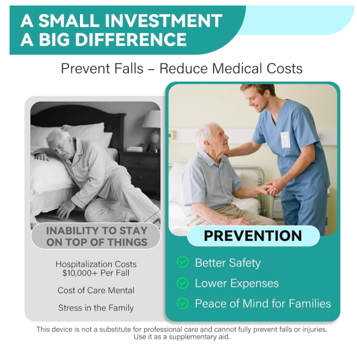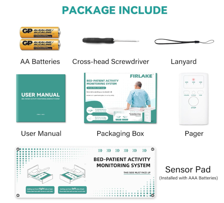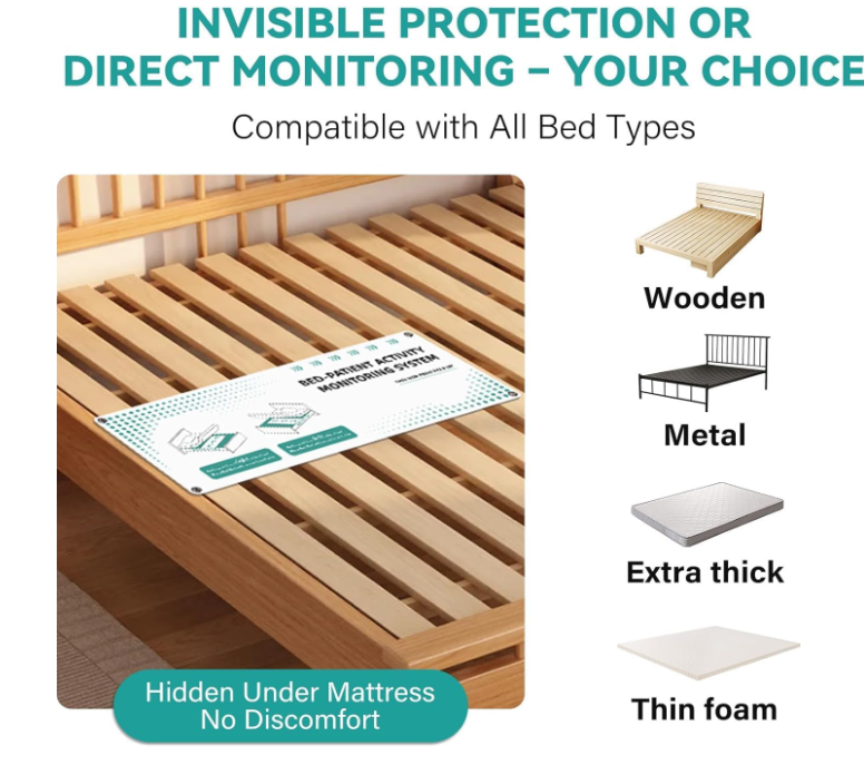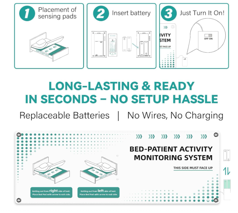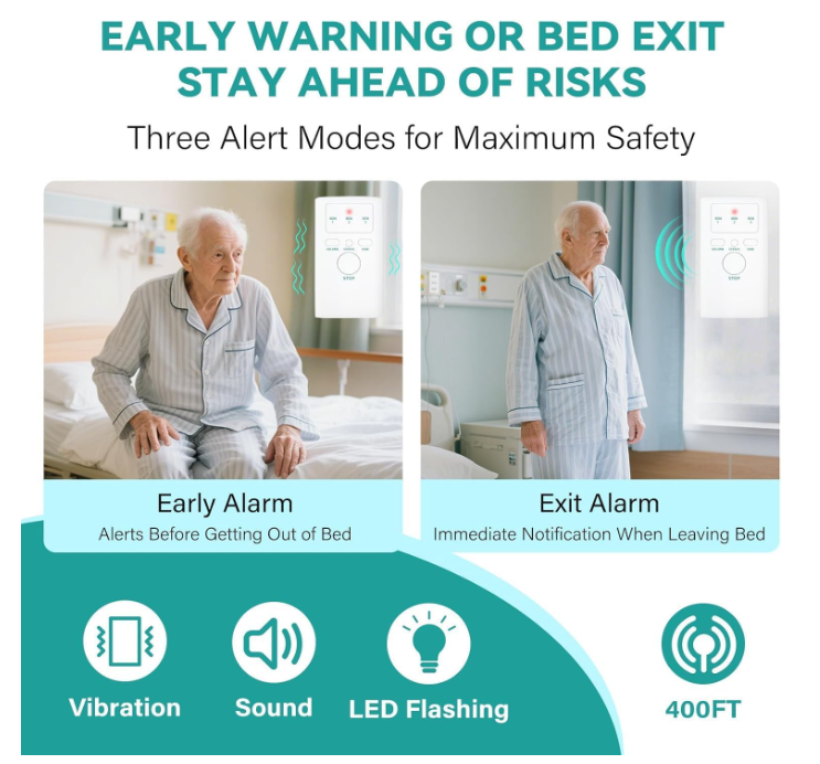 ZelleDual Alarm Modes – Early & Exit Alerts for Enhanced Fall PreventionEquipped with two smart detection modes, this assistive device for elderly adults provides Early Alarm Mode (alerts when the user sits up) and Exit Alarm Mode (alerts when they leave the bed). By detecting movement in advance, it helps reduce fall risks, making it an ideal fall prevention solution for seniors and dementia patients. 400FT Wireless Range – Reliable Alerts Across Rooms & Floors With an industry-leading 400FT range, this bed alarm system works seamlessly in homes, multi-level houses, assisted living centers, and nursing facilities. The portable pager features three alert settings (LED + sound + vibration) so users can choose the most convenient way to receive notifications, whether during the day or while sleeping.