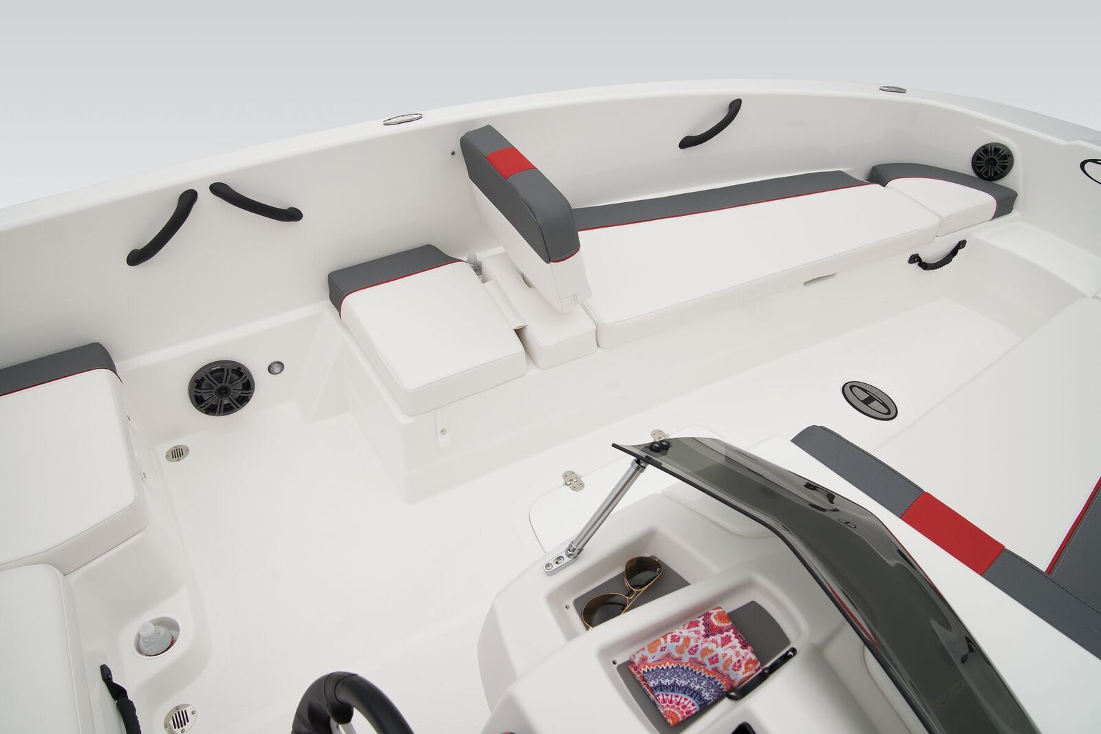 The aft swim platform with a 4-step telescoping boarding ladder makes it easy to jump in and out of the water. Find your favorite seat in the 3-across midship bench, dual forward lounges, or aft sun pad. The port bow backrest can be reversed for forward or aft seating and its cushion can even be flipped up so passengers don't step on the upholstery as they board. Add the optional bimini top to create the perfect lake-day boat your friends and family will love!