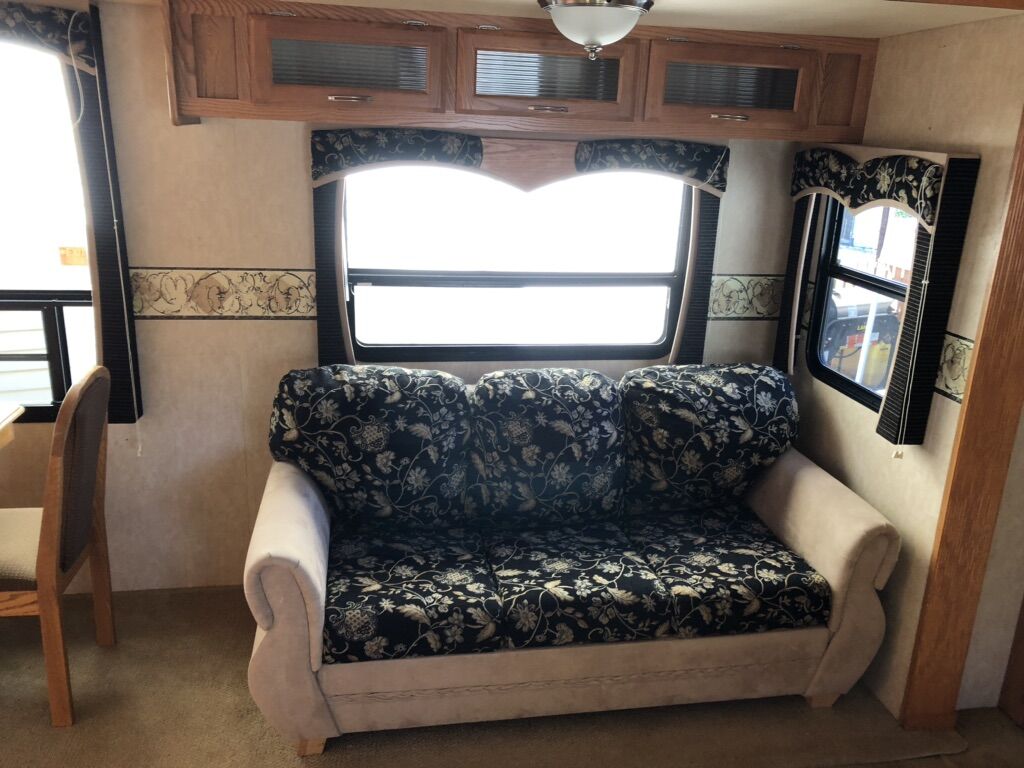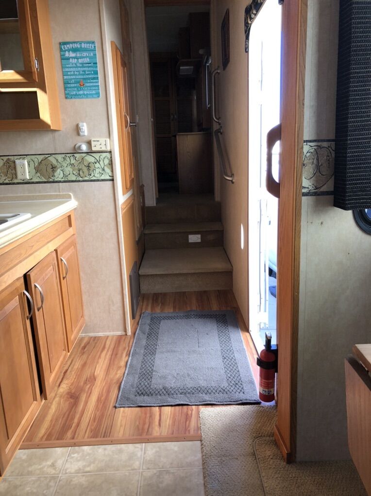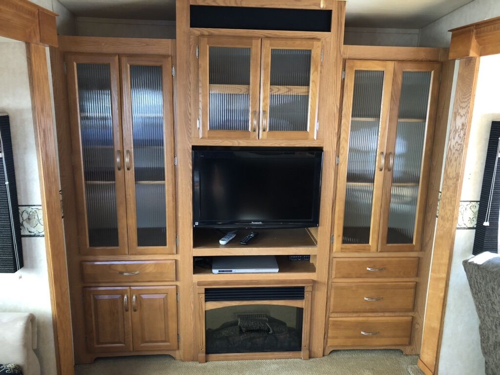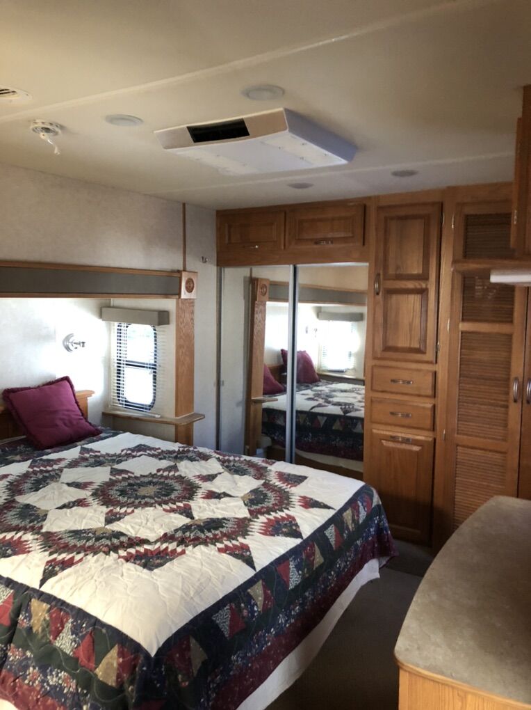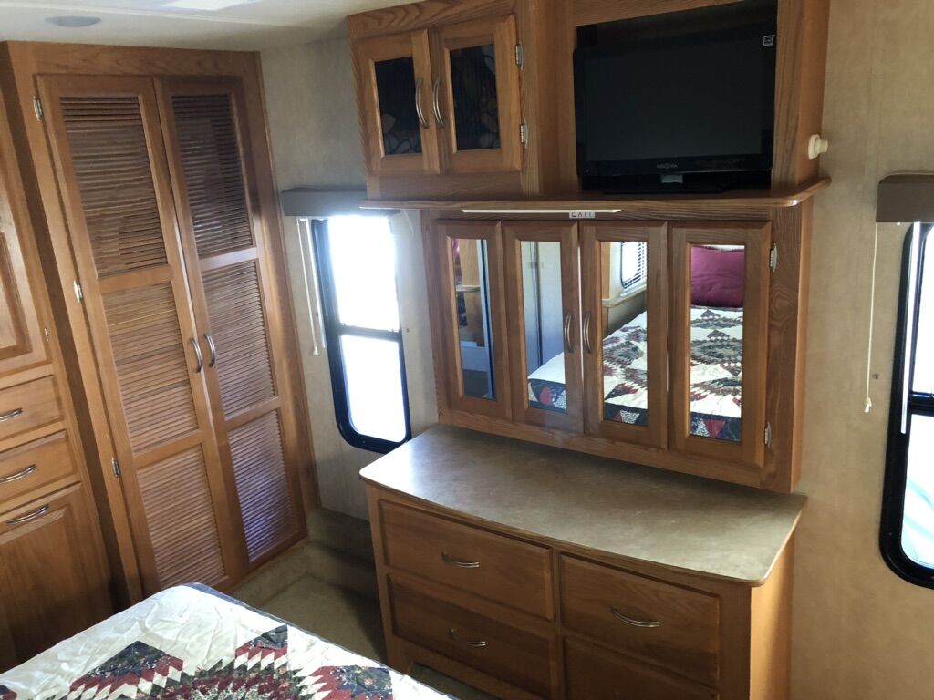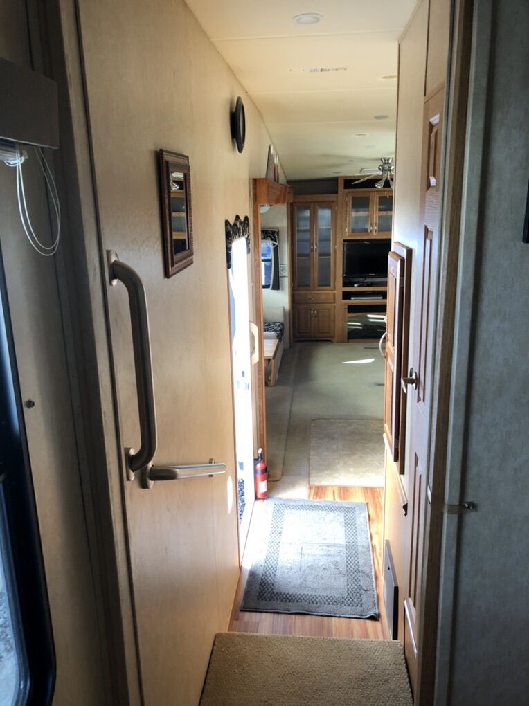 Approximately 38 ft long, 4 slides, 2 A/C units, 18ft electric awning, electric fireplace, ceiling fan, tall ceiling, 10gal water heater, washer and dryer, central vacuum, tinted and very big windows, florescent lights replaced with new LED ones, real wood cabinet doors throughout, Newer 14 ply tires with about 1,000 miles on them, generator ready, new fabric on slide outs and shade awning, roof recovered and sealed, All appliances serviced in the last month, everything in working order. Ready to go! No trades.