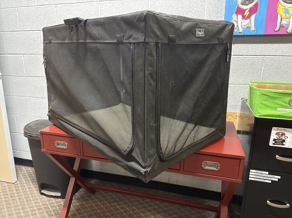 2 brown kennels with bag 1 black 1 gray