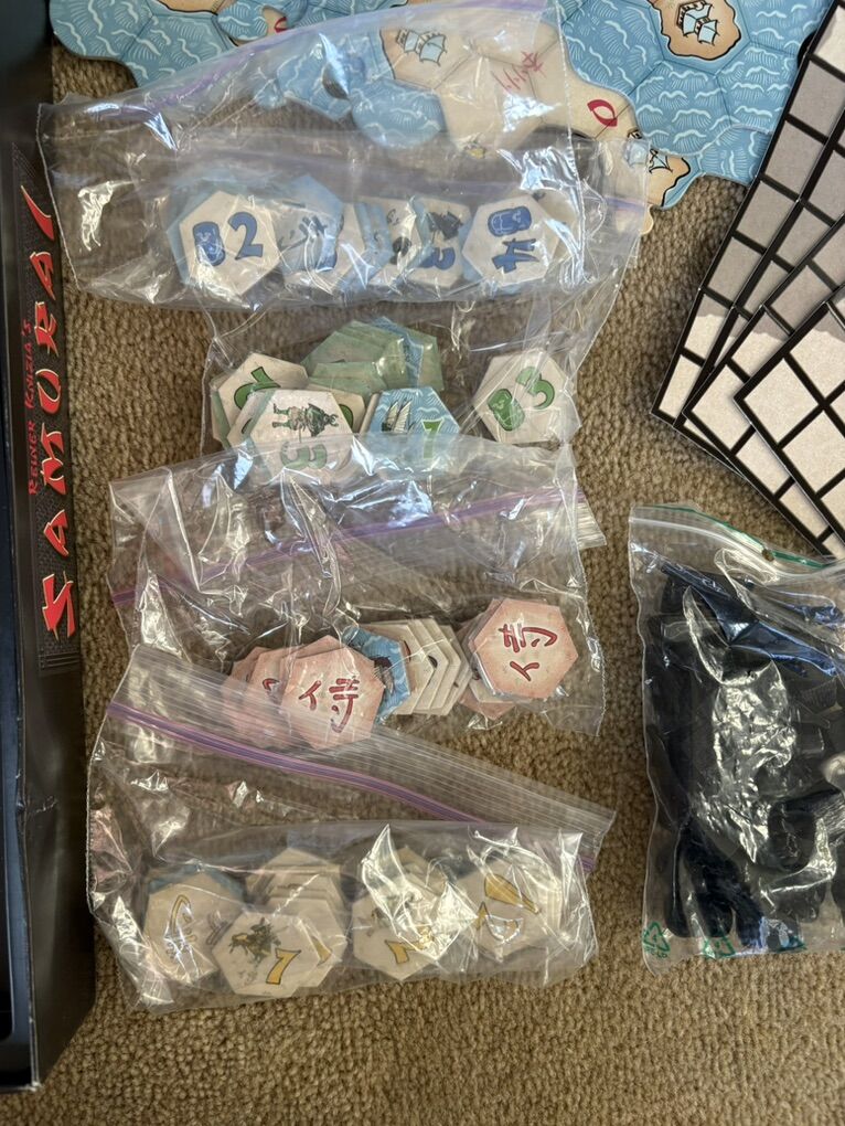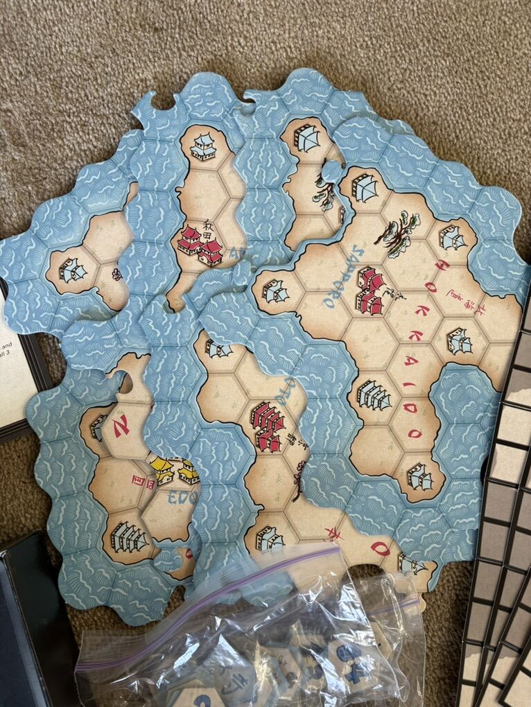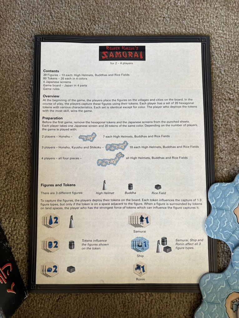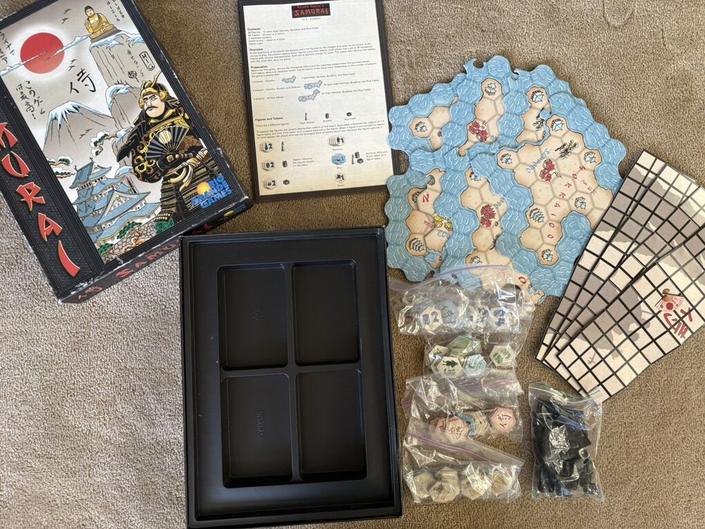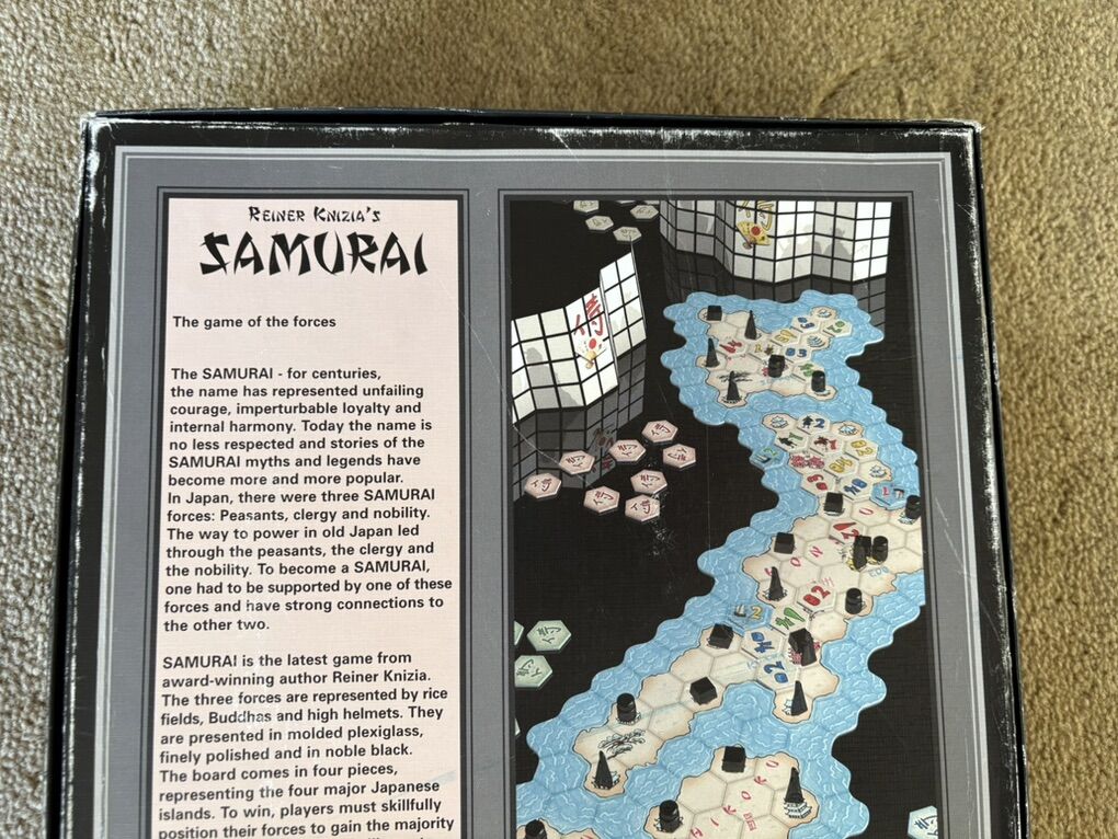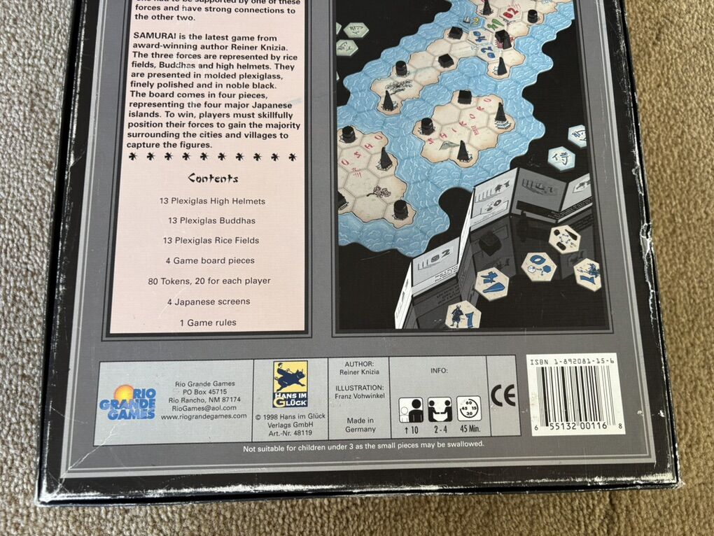 COMPLETE Reiner Knizia’s Samurai Board Game. Hans im Gluck/Rio Grande Games, original English edition, 1998. Very rare edition. 2-4 players, age 10+. Complete, no missing pieces. Components in excellent condition. Box edges/corners worn (see photos). Text only. Cash or Venmo.
