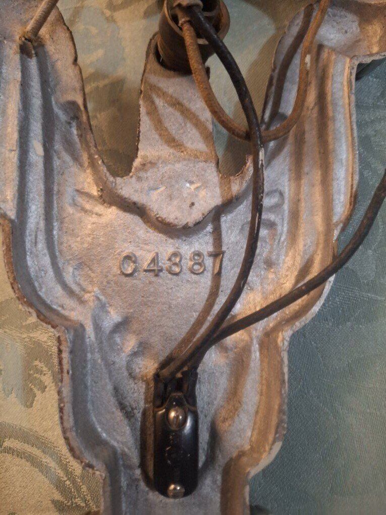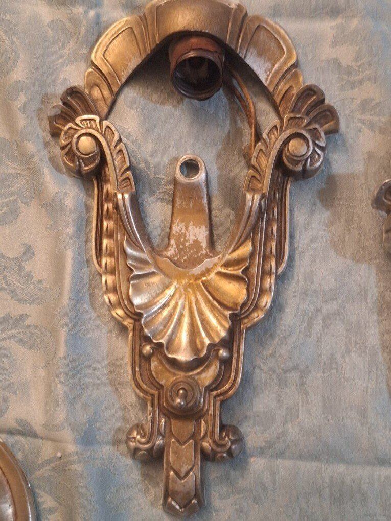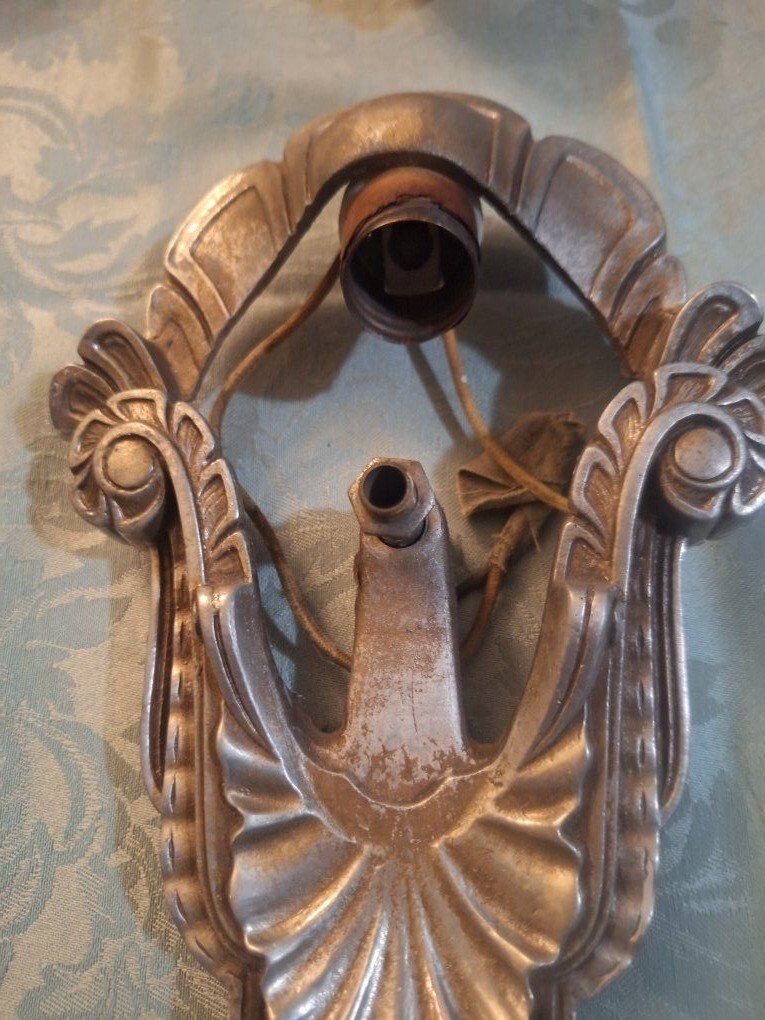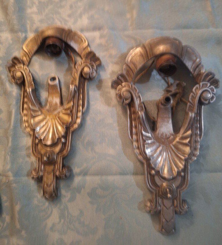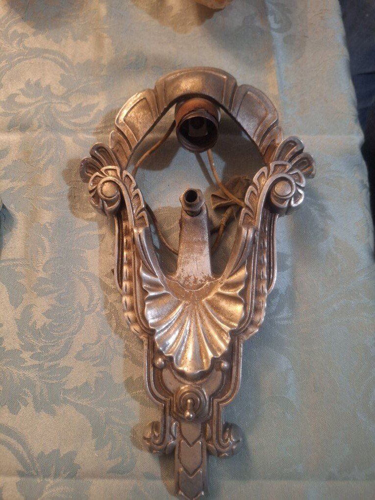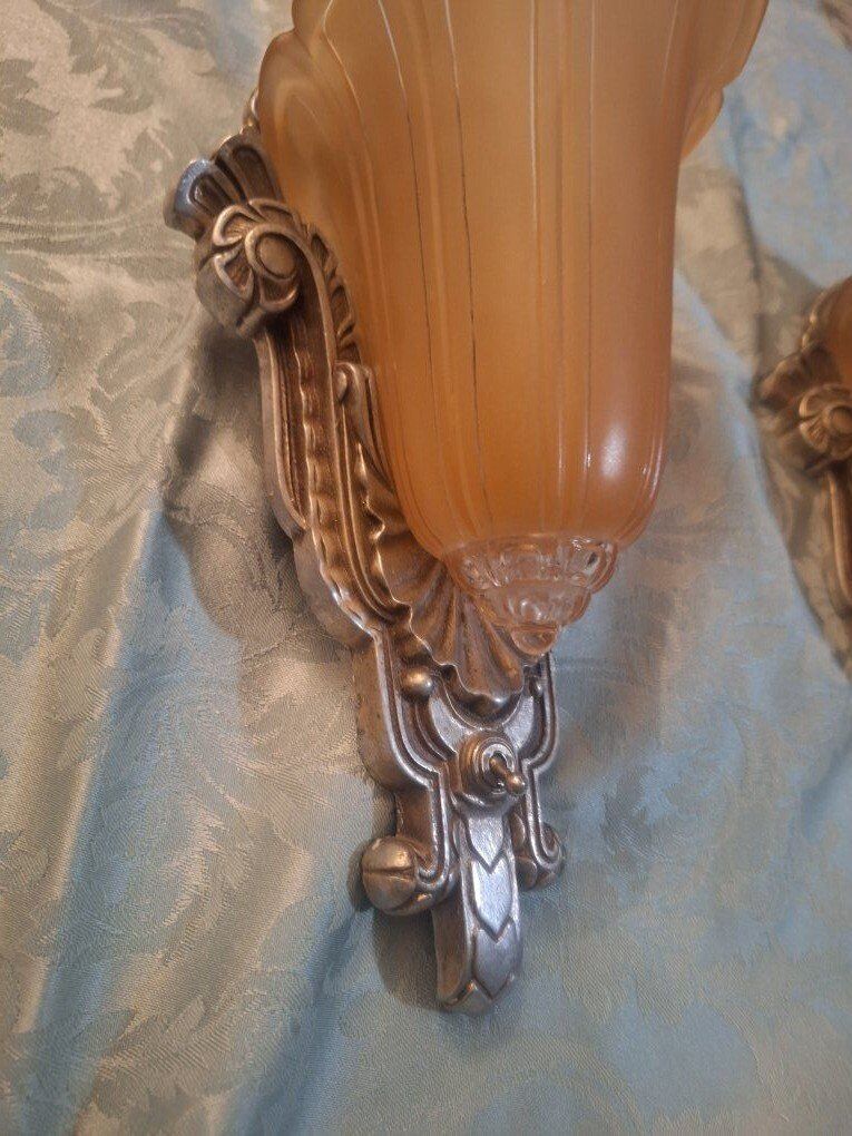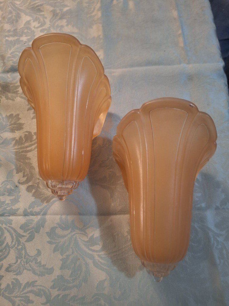 VenmoThis is a pair of circa 1920, Art Deco slip shade sconces. Each sconce has a height of 11 1/2 " and maximum width of 6 1/2". the sconce projects 4 3/4" from the wall; it connects into the junction bar 4 1/4" down from the top of the fixture. The sconce back plates are aluminum with polychrome finish--they have the number "C 4887" on the back but no manufacturer name. The glass slip shades are a frosted peach color, with a clear base. The glass is in very good condition. $300.00 each or $600.00 for both. there is 2 Chandler's the match. call or text Lisa @ 801-686-3863 for more info.