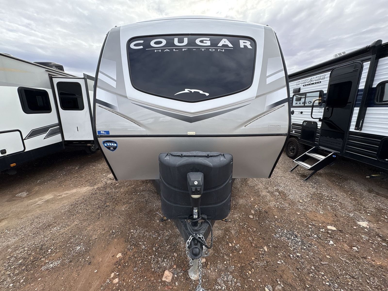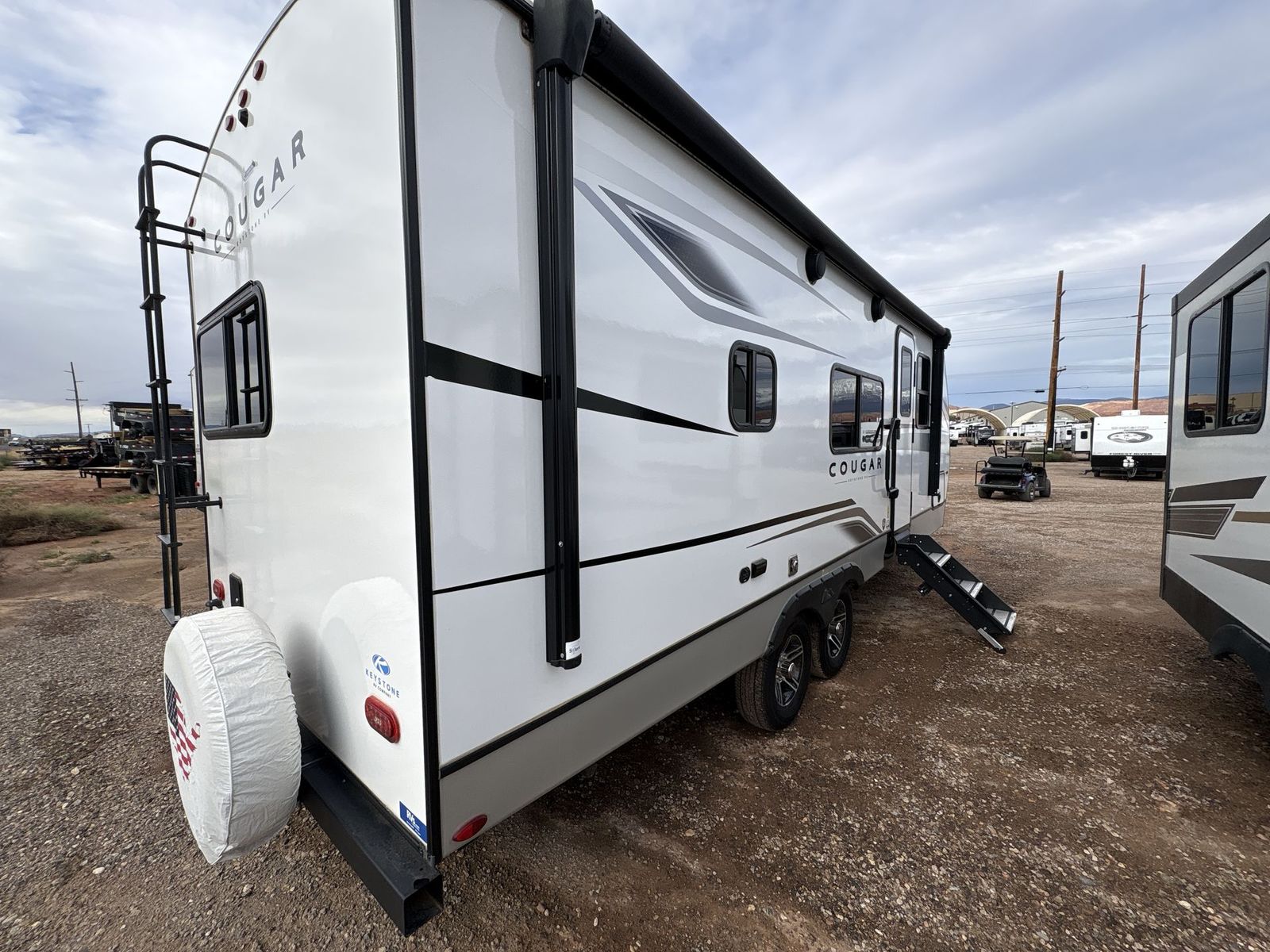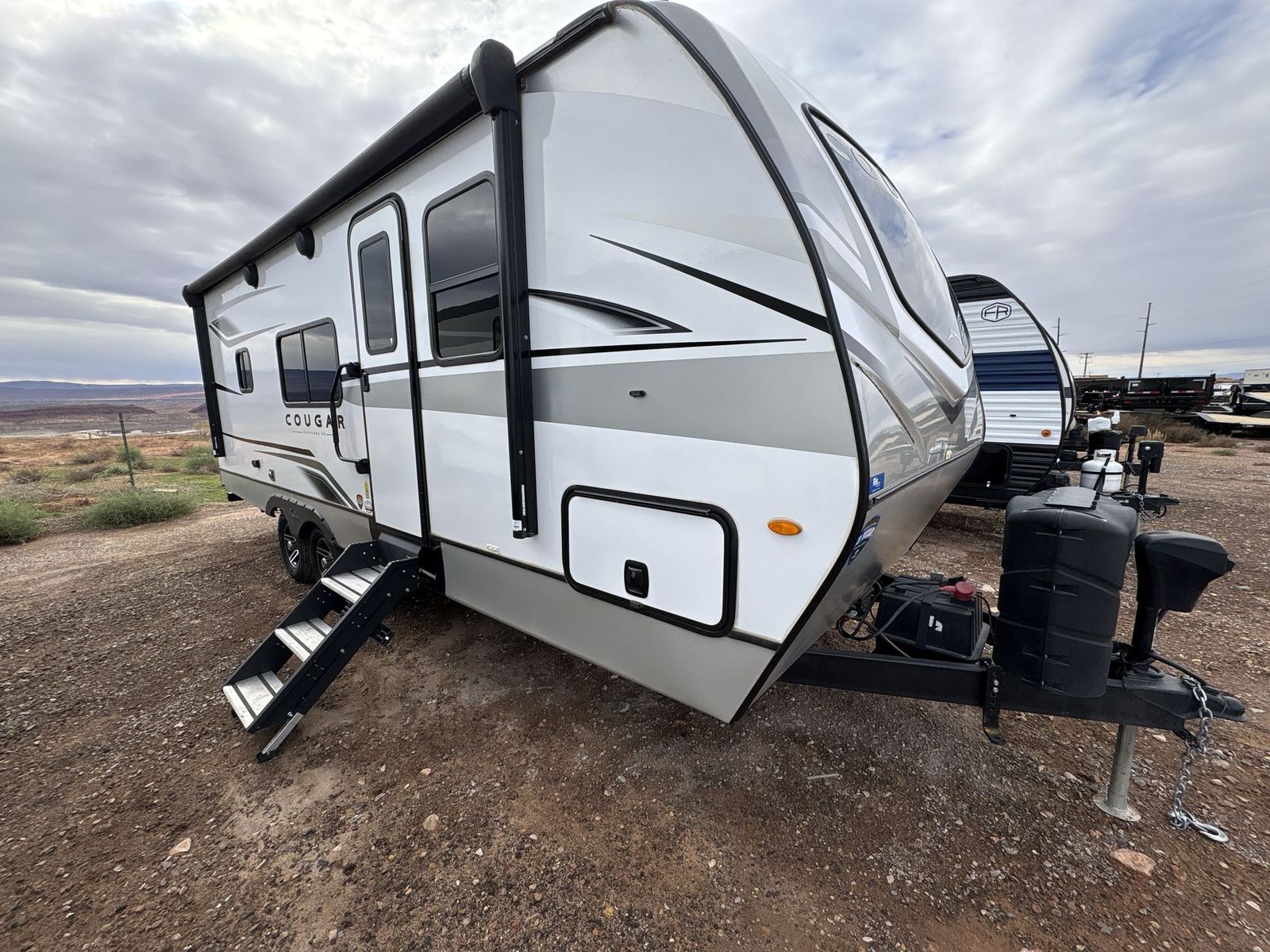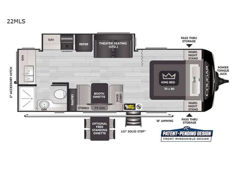 Keystone Cougar Half-Ton travel trailer 22MLS highlights: King-Size Bed Theater Seating Booth Dinette Large Slide Pass-Through Storage With a king-size bed, this Cougar Half-Ton travel trailer shows that you can still be comfortable even while you're away from home! The bed has wardrobes and nightstands on either side, and it also has a privacy curtain to section it off from the rest of the trailer. When you use the LCI Solid Step entry to get inside, you'll notice and appreciate the shoe cubby to your left. Right next to the booth dinette is the pantry, and next to the pantry is the full bathroom which is certainly one of the most valuable features to any trailer. The Keystone Cougar Half-Ton fifth wheel and travel trailers are known as one of America's favorites for a reason! Some of those reasons are the exclusive features that come from Keystone, like the preparations for 4G and Wi-Fi, the in-floor heating ducts, and the Hyper Deck flooring. The Cougar Half-Ton has a Climate Guard protection package to keep you safe during inclement weather, and you'll also find an iN-Command Generation 3 with global connect. Use the 21" Furrion range with Piezo ignition to create all of those familiar meals from home, and take charge of how you camp with the SolarFlex 200solar power system which has been fully integrated during the building process so that you don't have to worry about trying to add it on after purchase. This system provides continuous charge to ensure the operation of 12V systems and to protect your battery.