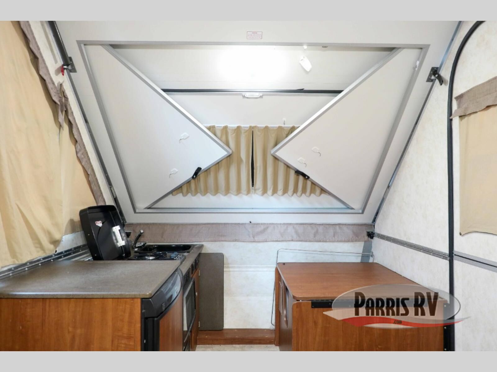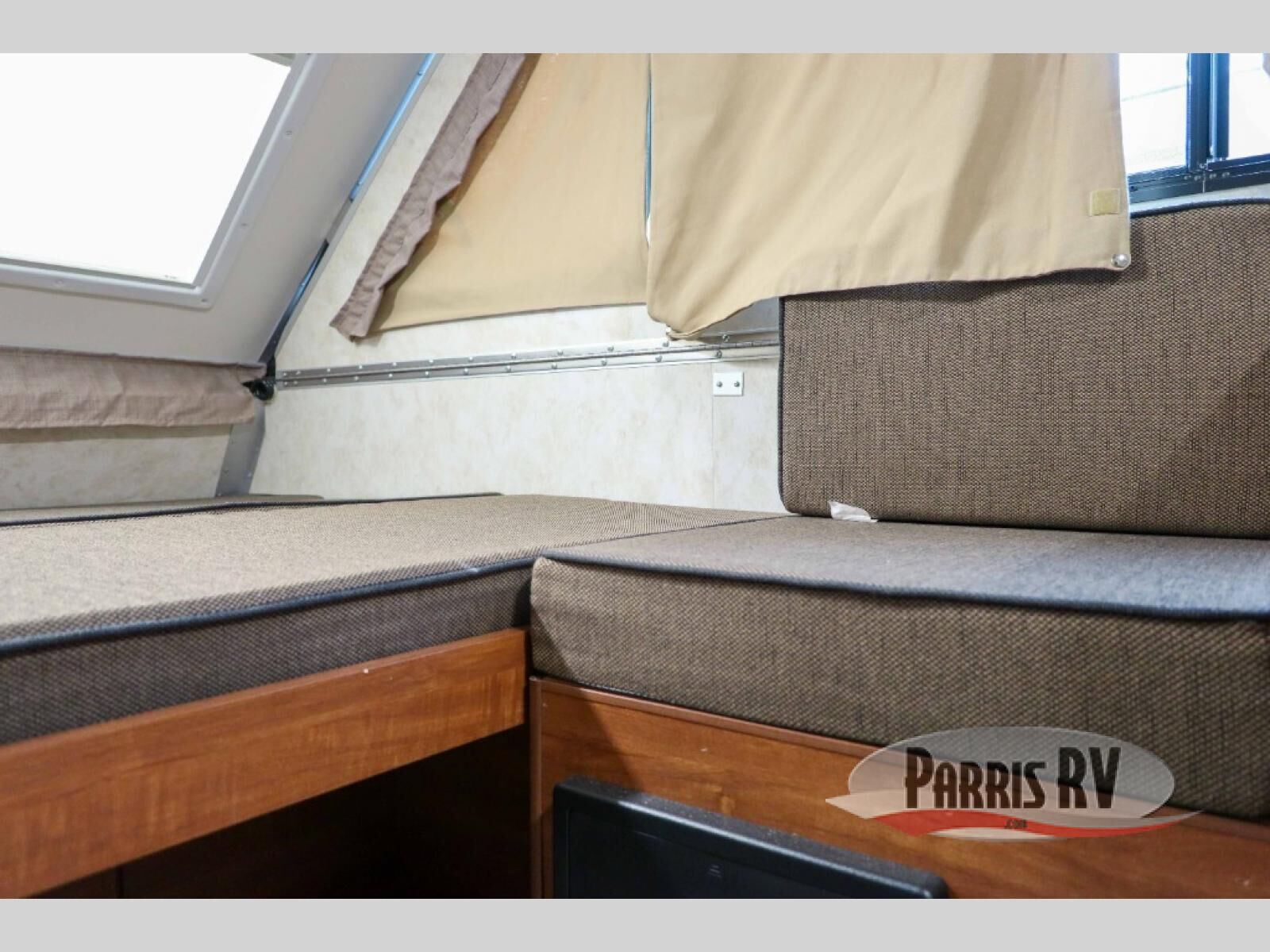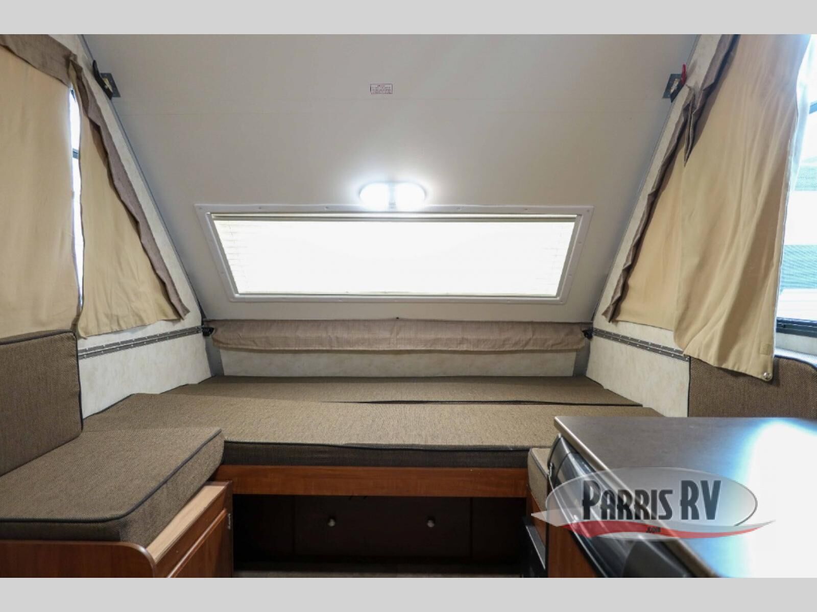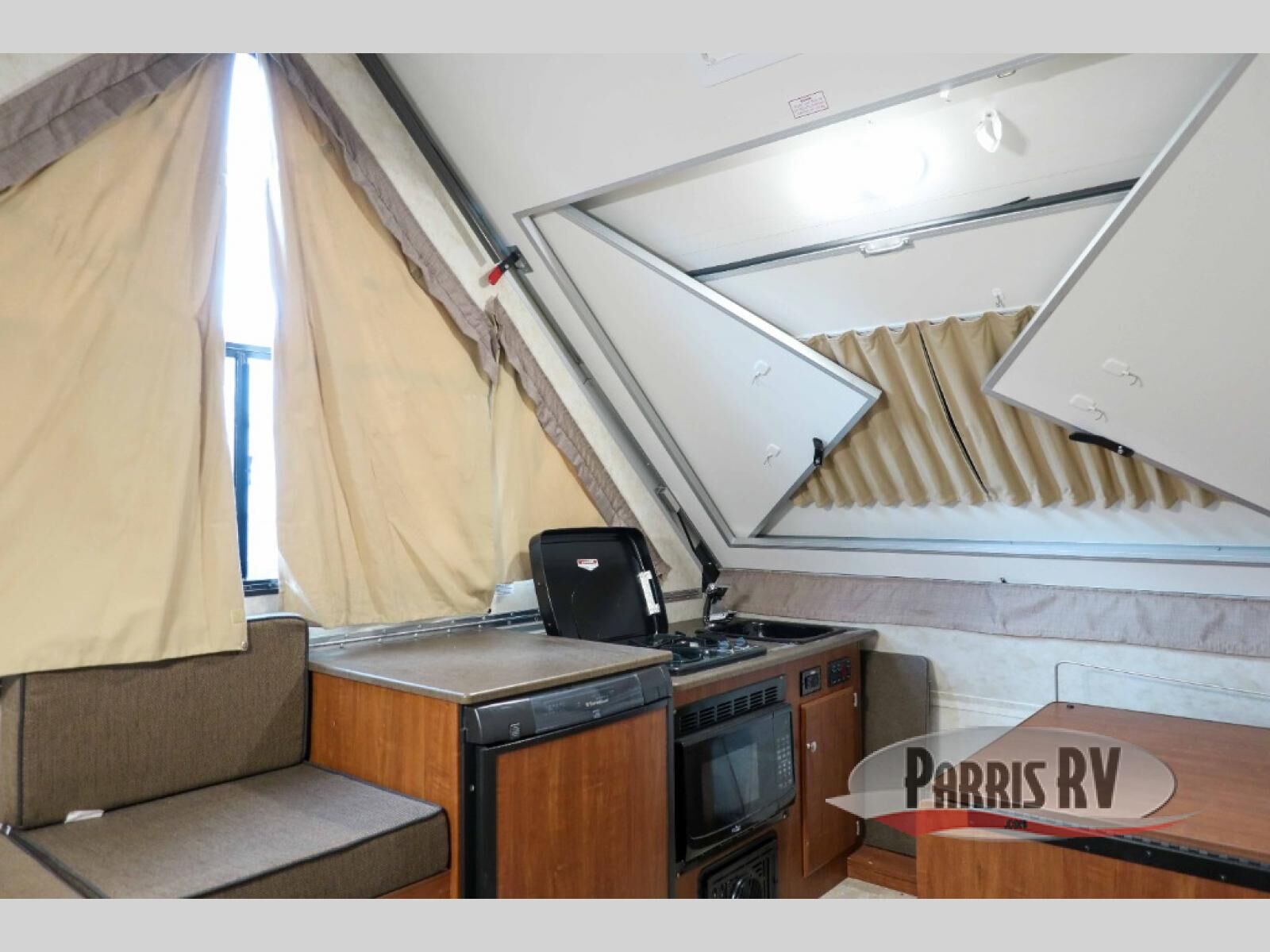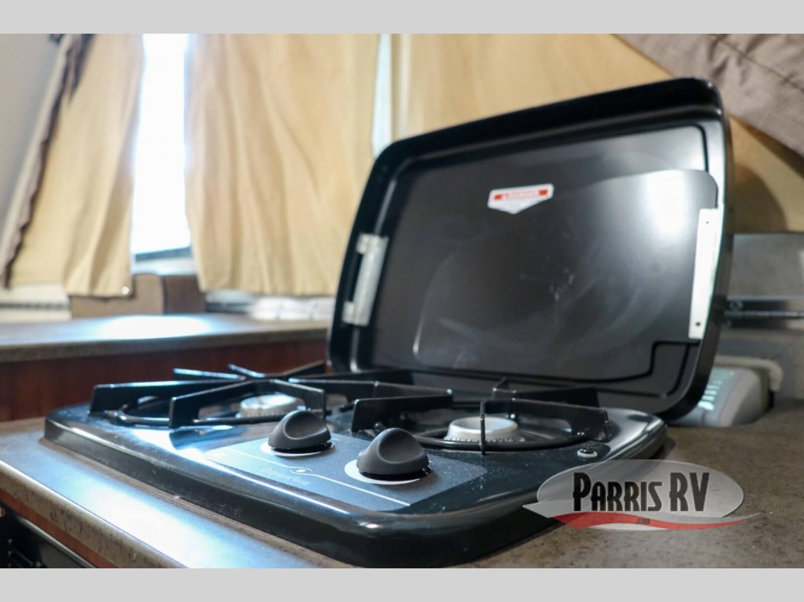 Along the road side of the pop-up there is a galley sink, two burner range where you can easily fix quick meals for your family, and a refrigerator under the counter. Enjoy your meal around the dinette, and at night you can get a good nights sleep on the 56" x 76" conversion bed, and more!