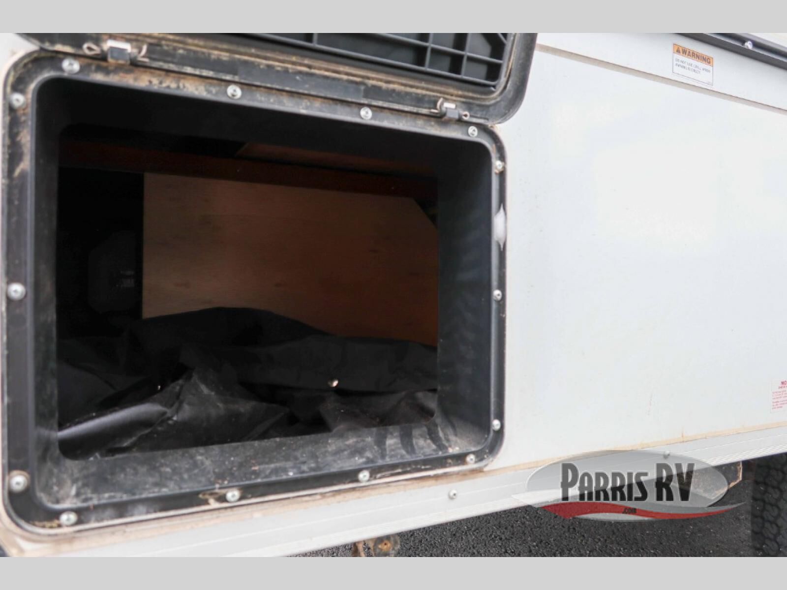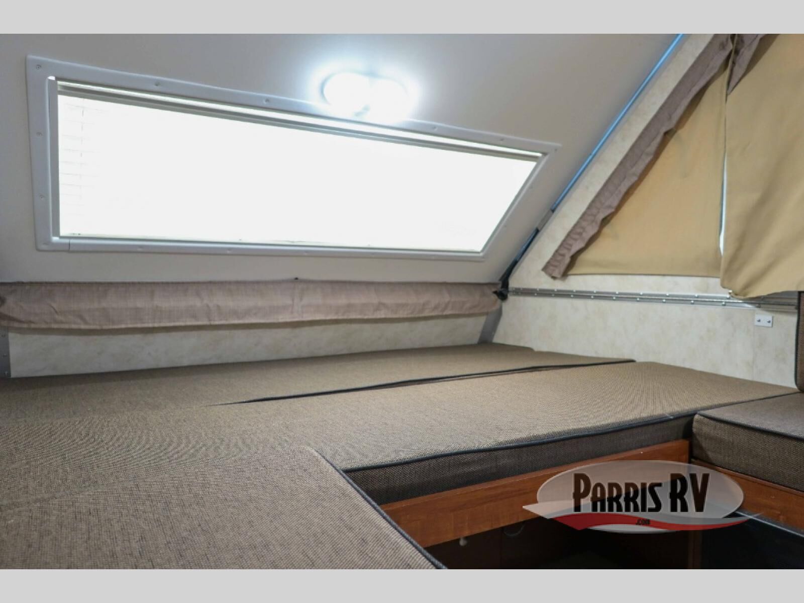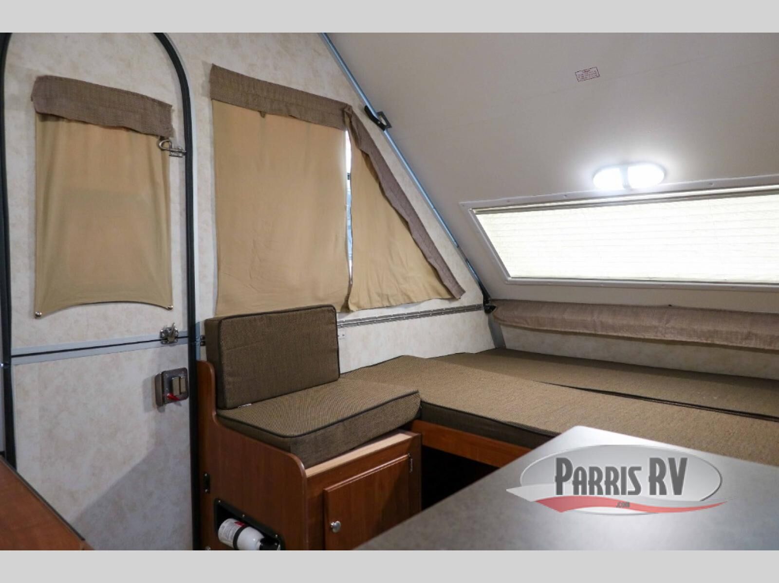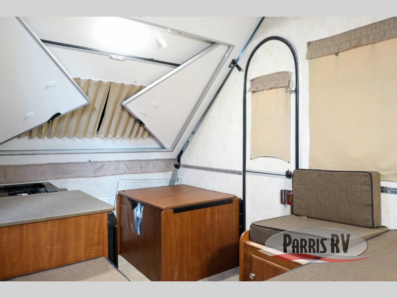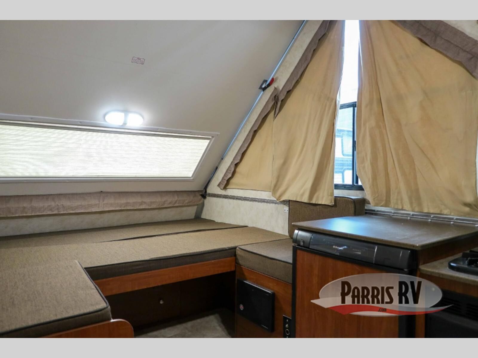 Along the road side of the pop-up there is a galley sink, two burner range where you can easily fix quick meals for your family, and a refrigerator under the counter. Enjoy your meal around the dinette, and at night you can get a good nights sleep on the 56" x 76" conversion bed, and more!