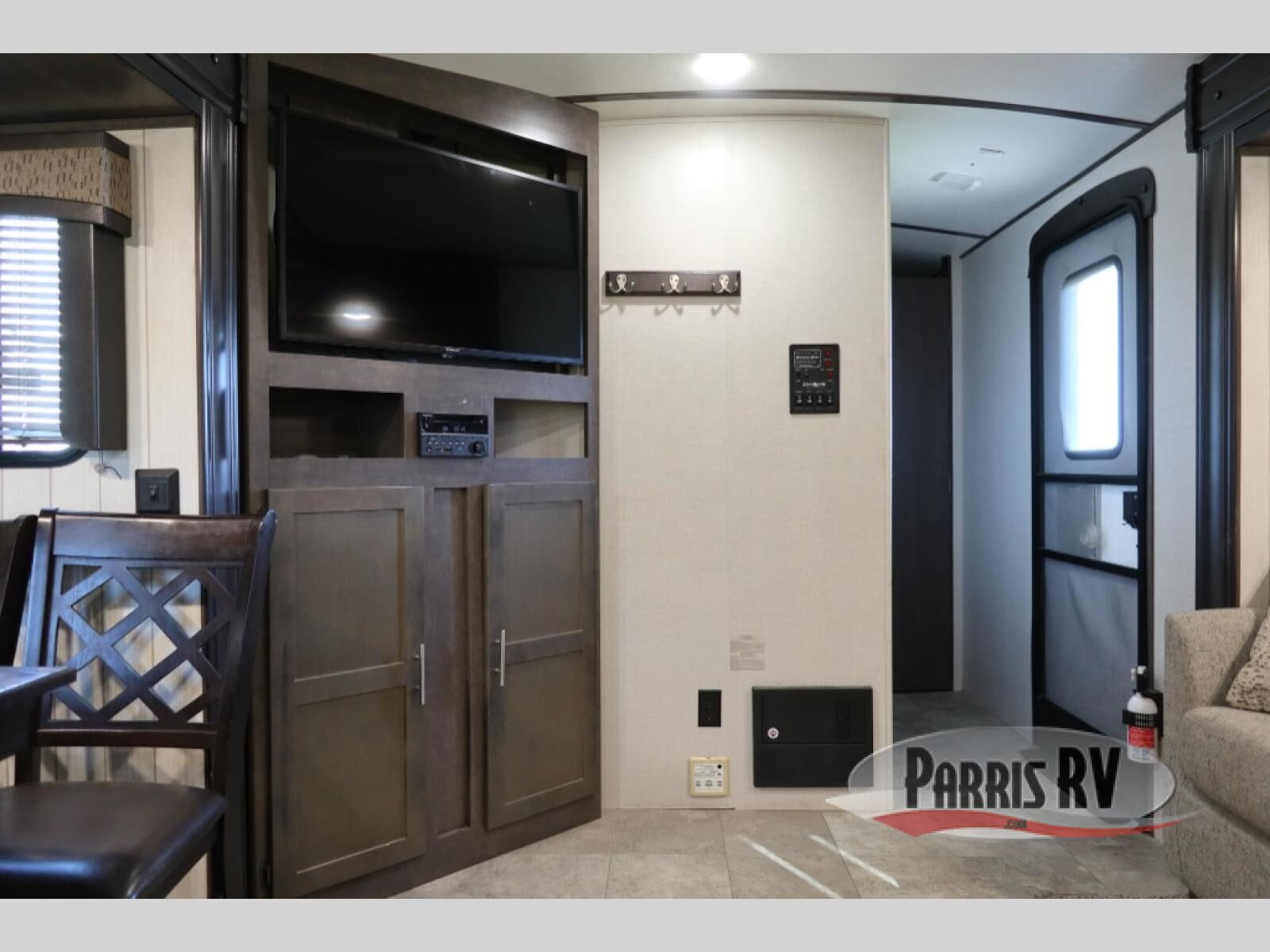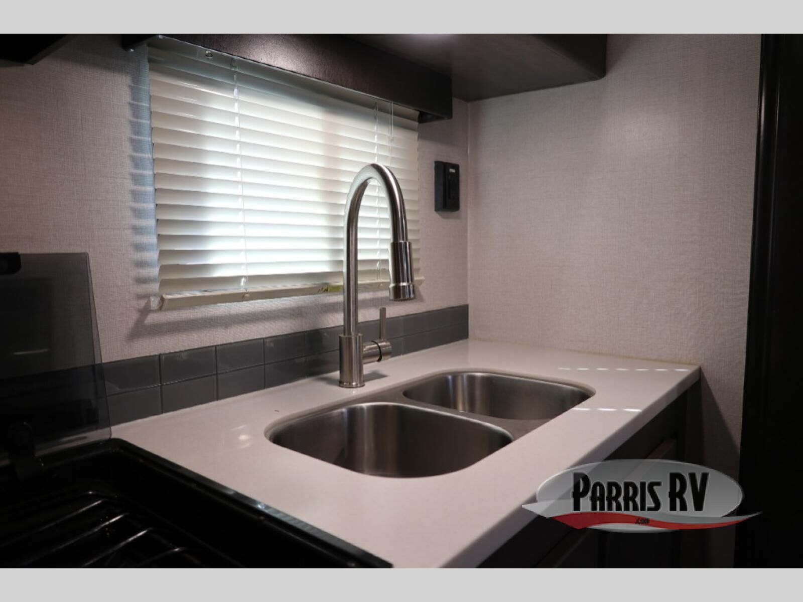 The exterior of the CrossRoads Sunset Trail Super Lite travel trailer is completely sleek and modern looking with its tinted windows that help protect your interior decor from fading and its painted fiberglass front cap that curves over to the roof and delivers a more aerodynamic approach. However, you will enjoy spending your evenings outside of the Sunset Trail for more reasons than just the appealing exterior vibe because each unit comes equipped with an electric awning with LED lights and outdoor speakers which create the perfect place to host a late-night get together with friends.