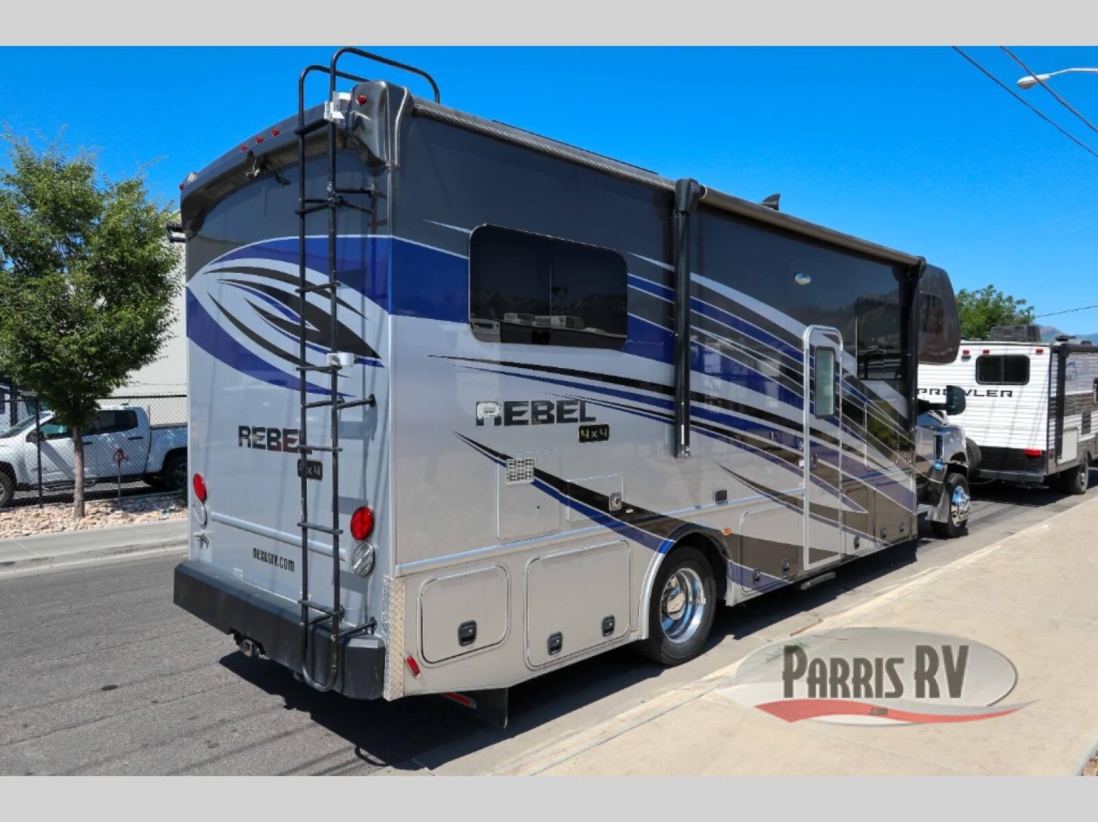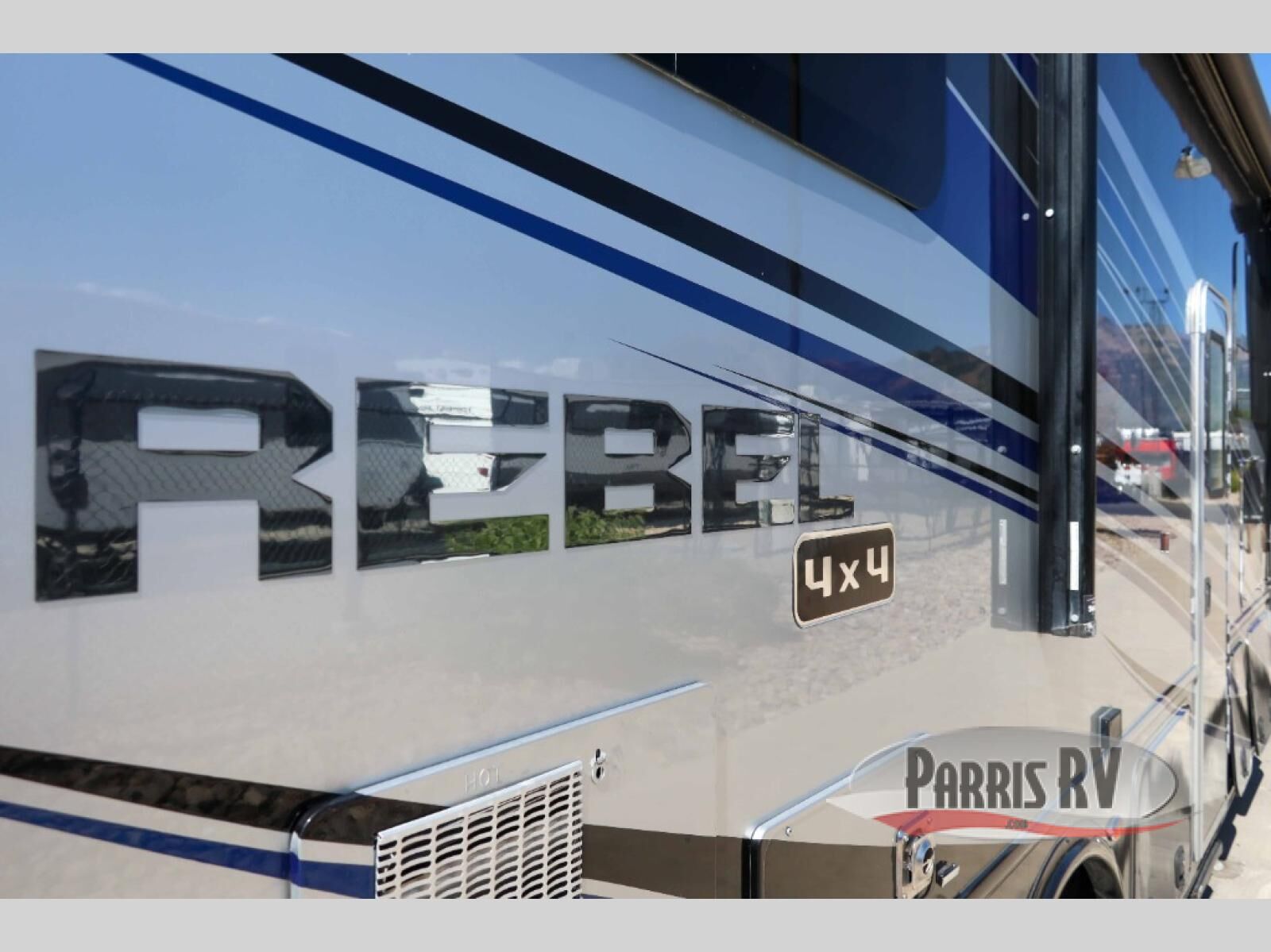 Check out this super cool Rebel Super C diesel 4x4 motorhome! Throughout the interior you will enjoy added living space thanks to the full-wall slide which makes it easy to snuggle up on the queen-size bed in the rear bedroom or make dinner on the three-burner range in the kitchen. Staying clean is easier than you ever thought it would be while camping since the full bathroom provides you with everything you need, and the shower skylight adds extra sunshine to this area so that you can clearly see while getting ready. Once you have hit the trails and worked up an appetite, come back to your coach and grab a snack from the residential refrigerator, or heat some leftovers up in the convection microwave.