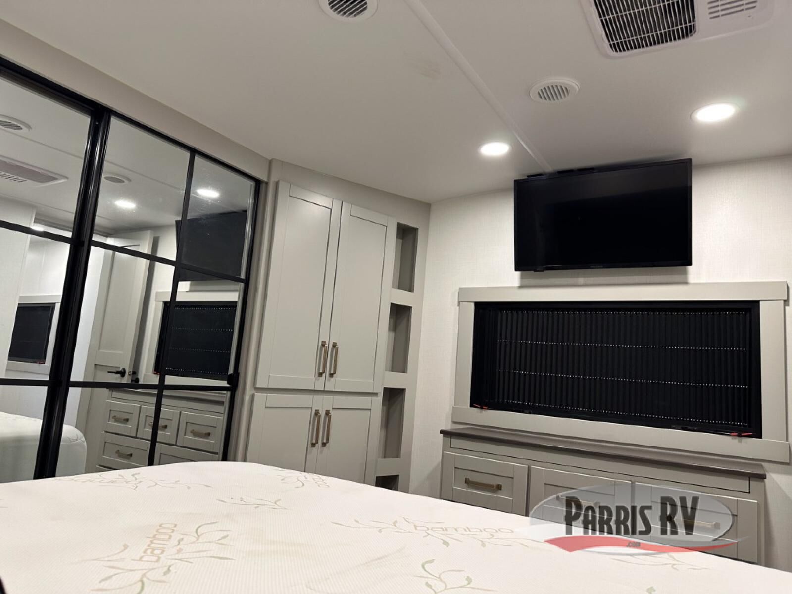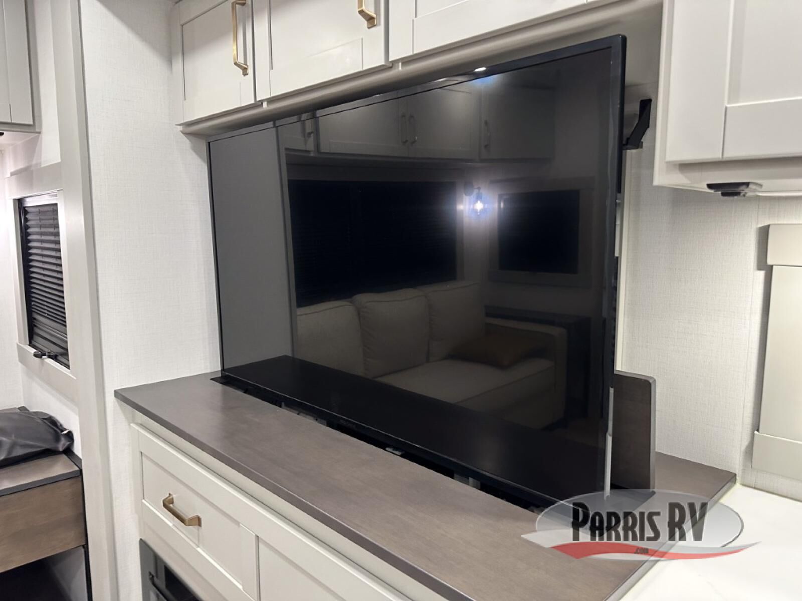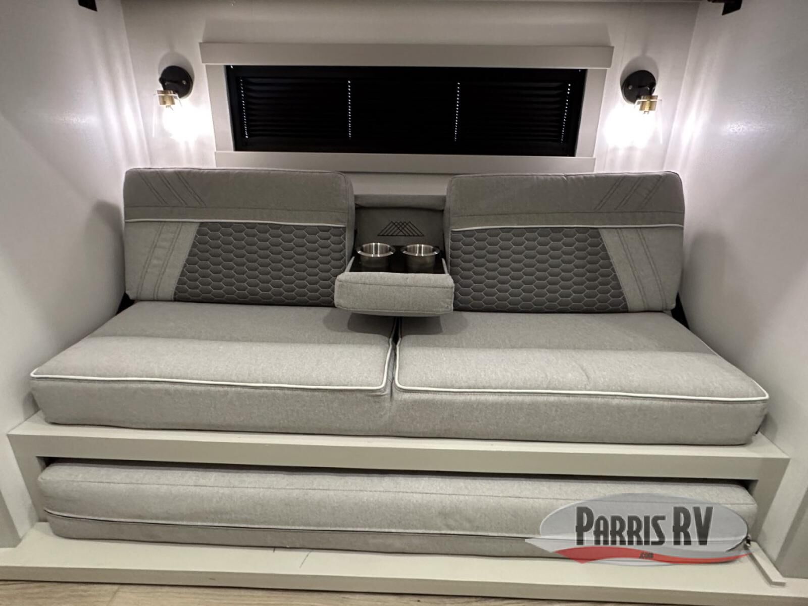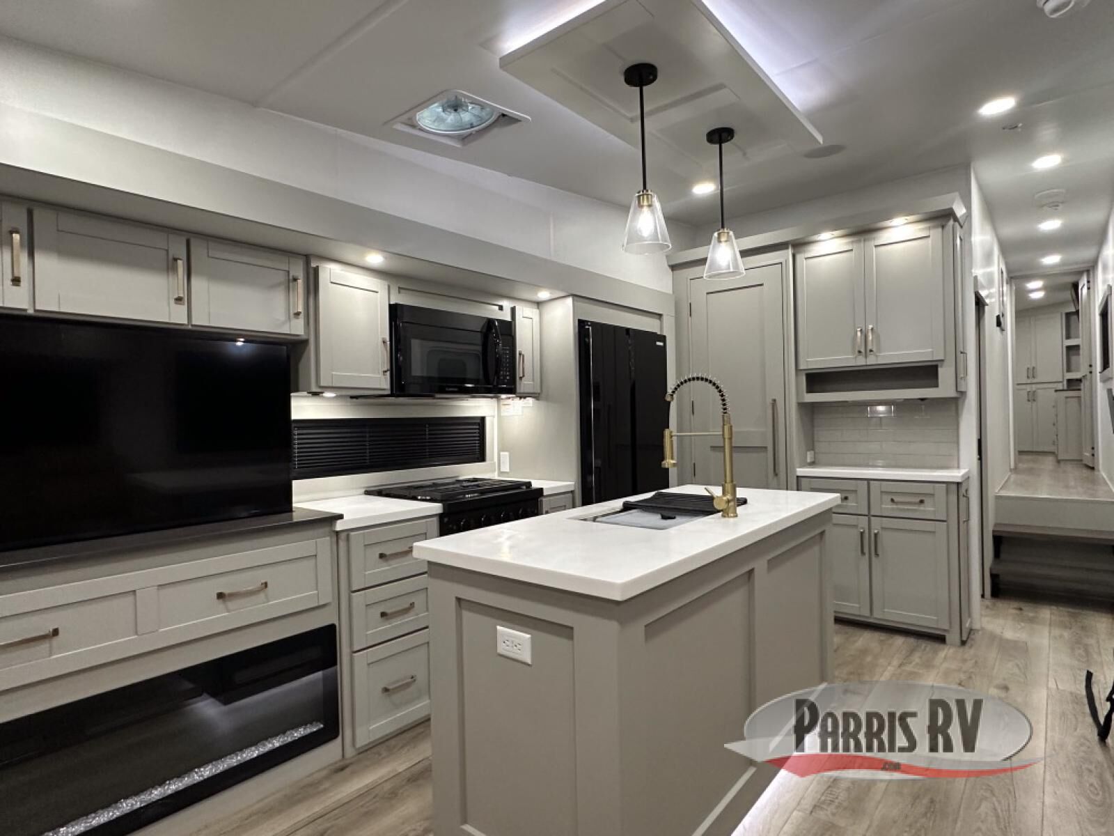 This unit is perfect for your family that needs sleeping space for eight! There is ample seating with a sliding desk/dining table, 62" theater seating, and a 72" tri-fold sofa along the rear wall. You can easily relax and enjoy the telescoping TV with a cozy fireplace below. The kitchen offers all that you need to prepare and cook meals just like home with a 16 cu. ft. refrigerator for your perishables, a 30" residential microwave oven, and three burner range top and oven. You will love the kitchen island all outfitted with pull-out pet bowls and double pull out trash bins with an integrated Stow & Go paper towel holder. There is also an 84" pantry with adjustable shelves for all of your canned and dry goods. Mid-coach, just ahead through the main entry, is a bonus room that can be used as a bedroom featuring a sofa bed with flip-up overhead bunk and trundle below, or an office with pull-out desk so that you can work easily while you travel, or it could also be used as a gaming room since there is also a 50" Smart TV. Head up the steps to a bathroom on your left and a private master suite with king bed slide all the way up front. A sliding dresser top features hidden storage which is perfect for jewelry and other personal belongings. The front wardrobe features mirrored doors and the corner closet has been prepped for a stackable washer and dryer if you choose to add that option.