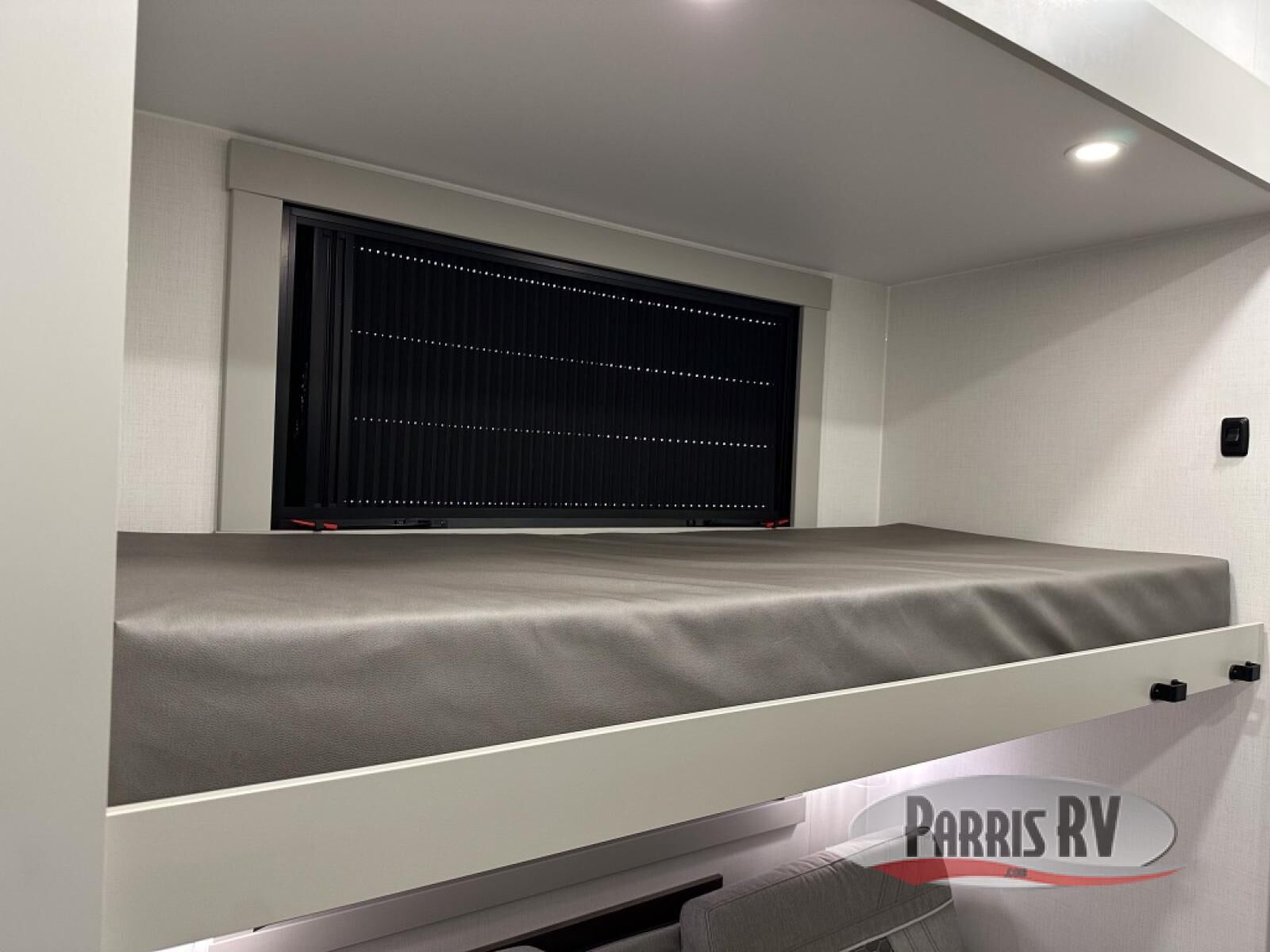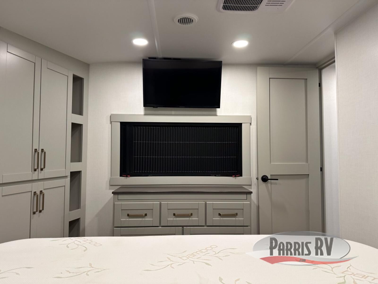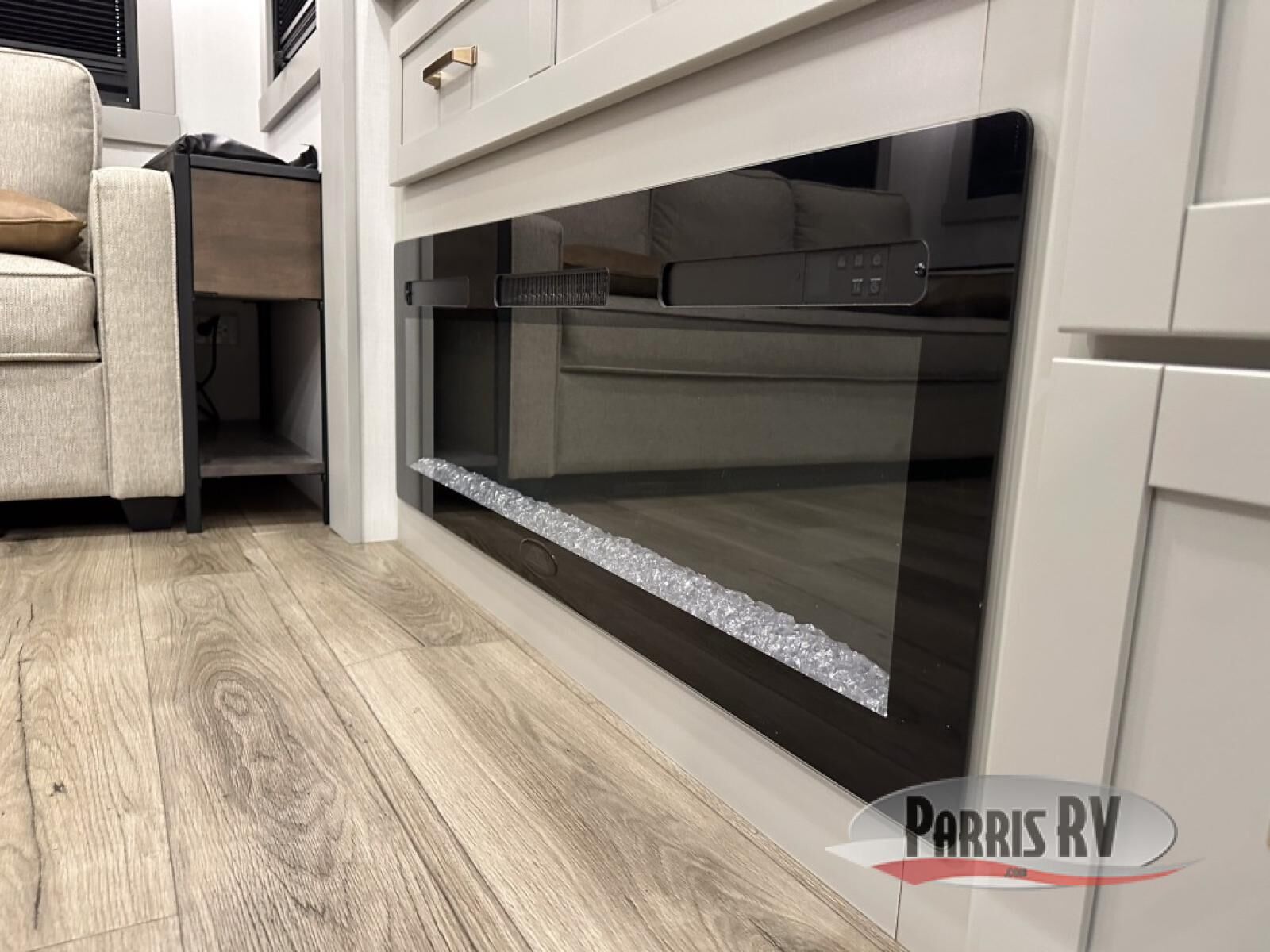 This unit is perfect for your family that needs sleeping space for eight! There is ample seating with a sliding desk/dining table, 62" theater seating, and a 72" tri-fold sofa along the rear wall. You can easily relax and enjoy the telescoping TV with a cozy fireplace below. The kitchen offers all that you need to prepare and cook meals just like home with a 16 cu. ft. refrigerator for your perishables, a 30" residential microwave oven, and three burner range top and oven. You will love the kitchen island all outfitted with pull-out pet bowls and double pull out trash bins with an integrated Stow & Go paper towel holder. There is also an 84" pantry with adjustable shelves for all of your canned and dry goods. Mid-coach, just ahead through the main entry, is a bonus room that can be used as a bedroom featuring a sofa bed with flip-up overhead bunk and trundle below, or an office with pull-out desk so that you can work easily while you travel, or it could also be used as a gaming room since there is also a 50" Smart TV. Head up the steps to a bathroom on your left and a private master suite with king bed slide all the way up front. A sliding dresser top features hidden storage which is perfect for jewelry and other personal belongings. The front wardrobe features mirrored doors and the corner closet has been prepped for a stackable washer and dryer if you choose to add that option.