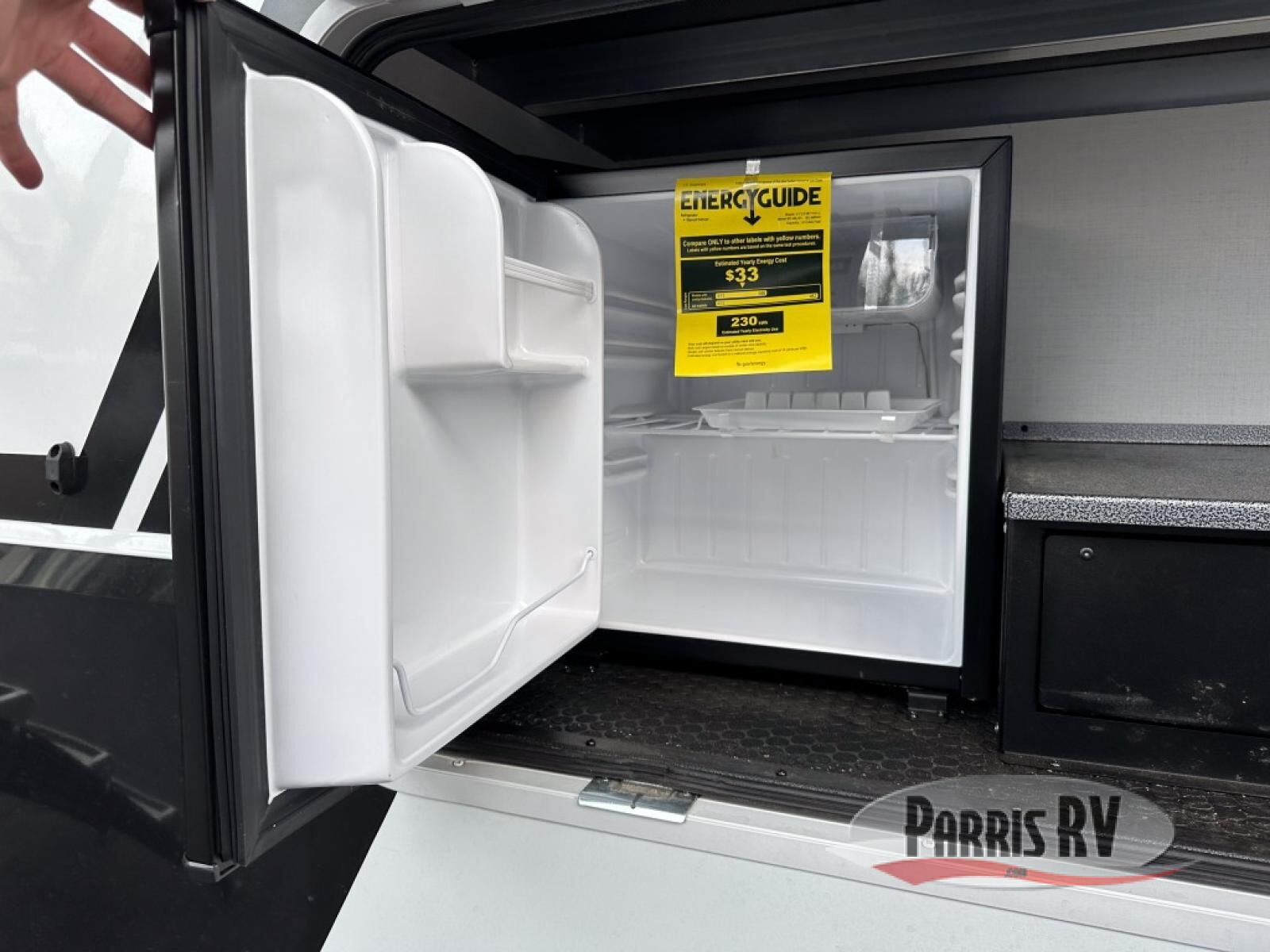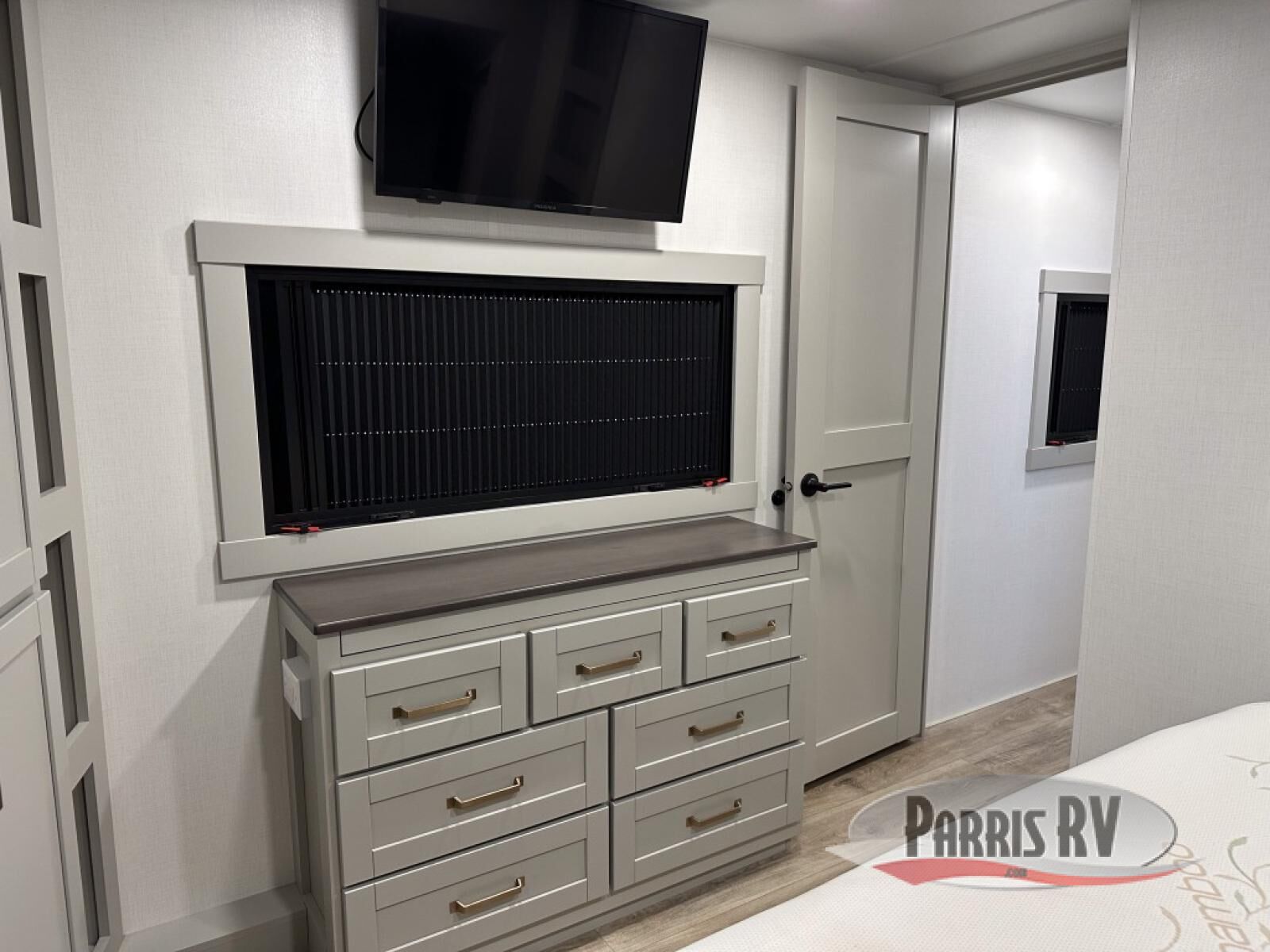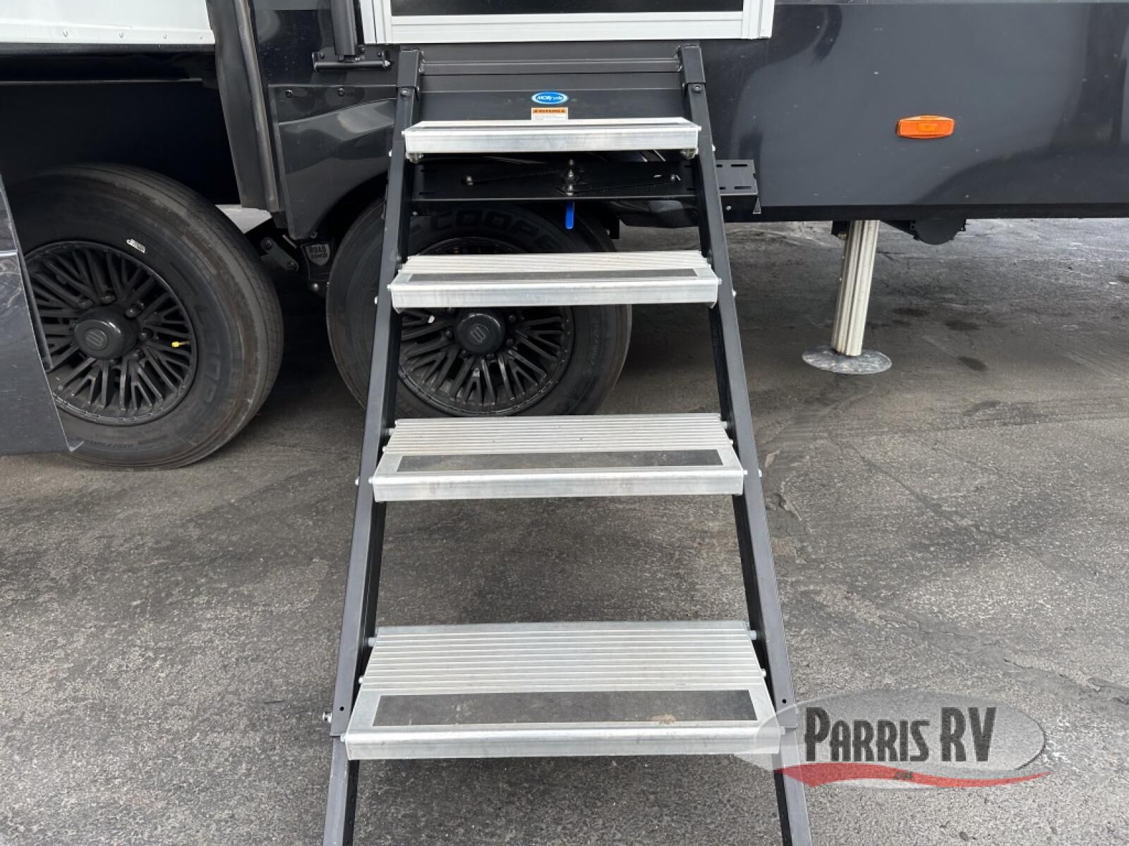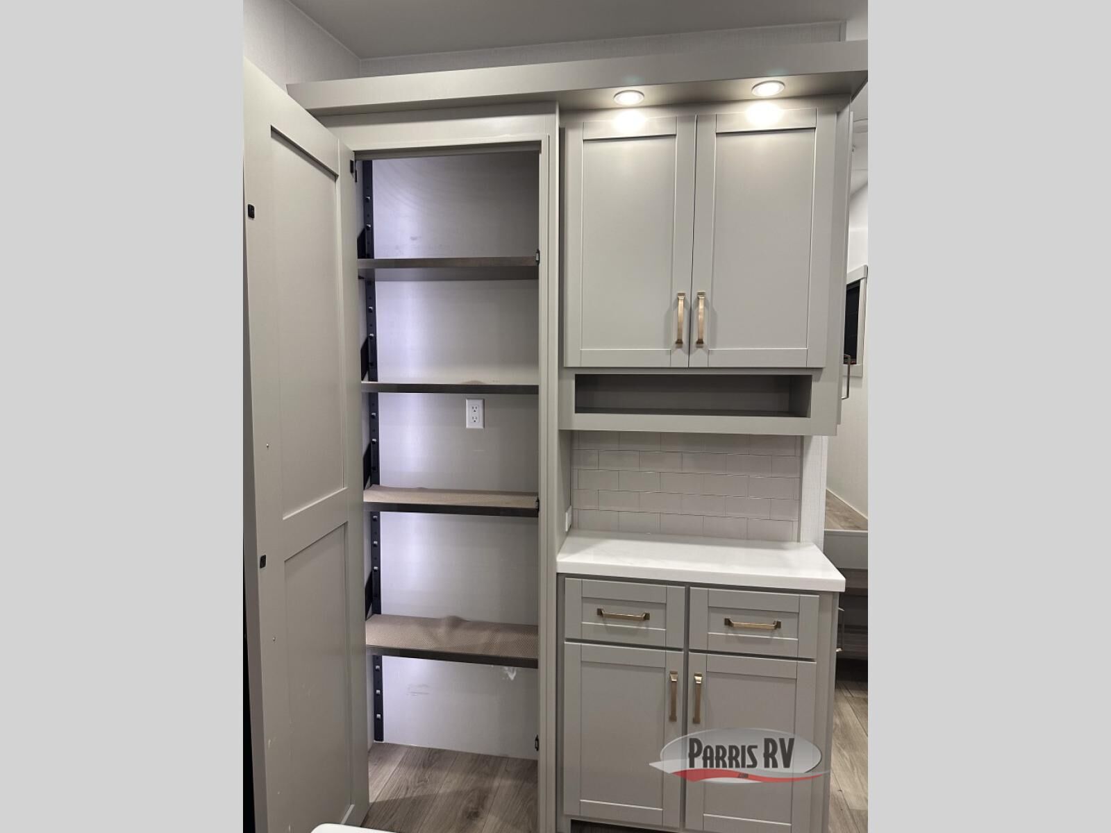 This unit is perfect for your family that needs sleeping space for eight! There is ample seating with a sliding desk/dining table, 62" theater seating, and a 72" tri-fold sofa along the rear wall. You can easily relax and enjoy the telescoping TV with a cozy fireplace below. The kitchen offers all that you need to prepare and cook meals just like home with a 16 cu. ft. refrigerator for your perishables, a 30" residential microwave oven, and three burner range top and oven. You will love the kitchen island all outfitted with pull-out pet bowls and double pull out trash bins with an integrated Stow & Go paper towel holder. There is also an 84" pantry with adjustable shelves for all of your canned and dry goods. Mid-coach, just ahead through the main entry, is a bonus room that can be used as a bedroom featuring a sofa bed with flip-up overhead bunk and trundle below, or an office with pull-out desk so that you can work easily while you travel, or it could also be used as a gaming room since there is also a 50" Smart TV. Head up the steps to a bathroom on your left and a private master suite with king bed slide all the way up front. A sliding dresser top features hidden storage which is perfect for jewelry and other personal belongings. The front wardrobe features mirrored doors and the corner closet has been prepped for a stackable washer and dryer if you choose to add that option.