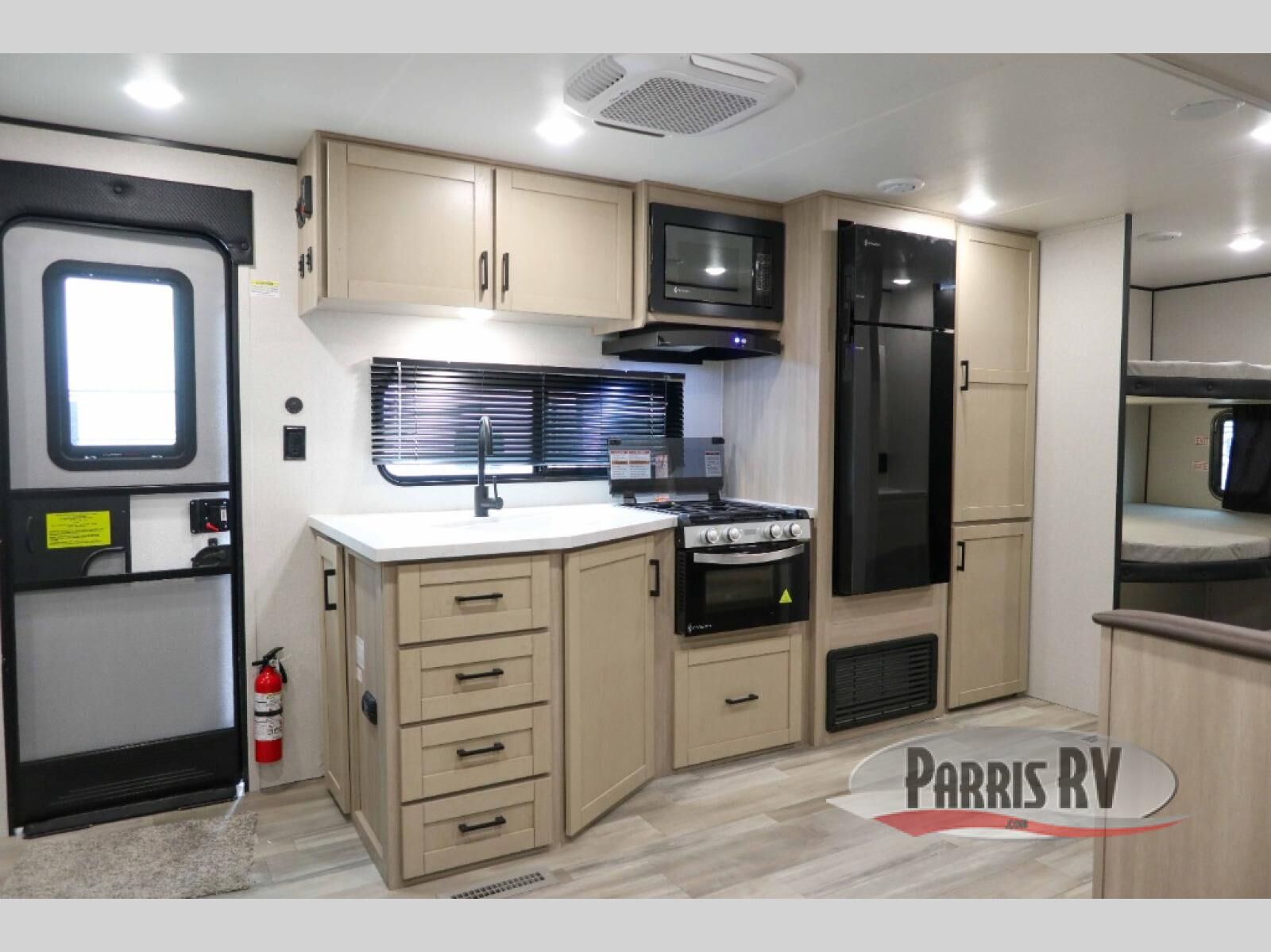 The whole gang will love weekends in the woods with this travel trailer in tow! There is a large slide out for added space, and here you'll find the jack-knife sofa and booth dinette. You can claim the front private bedroom to yourselves, while your guests or little ones take the double-size bunks. A full kitchen is complete with a three-burner cooktop and microwave oven to make meals each day, plus a 12V refrigerator and pantry for food storage. This unit also includes an outdoor kitchen with a refrigerator to keep cold drinks ready to enjoy!