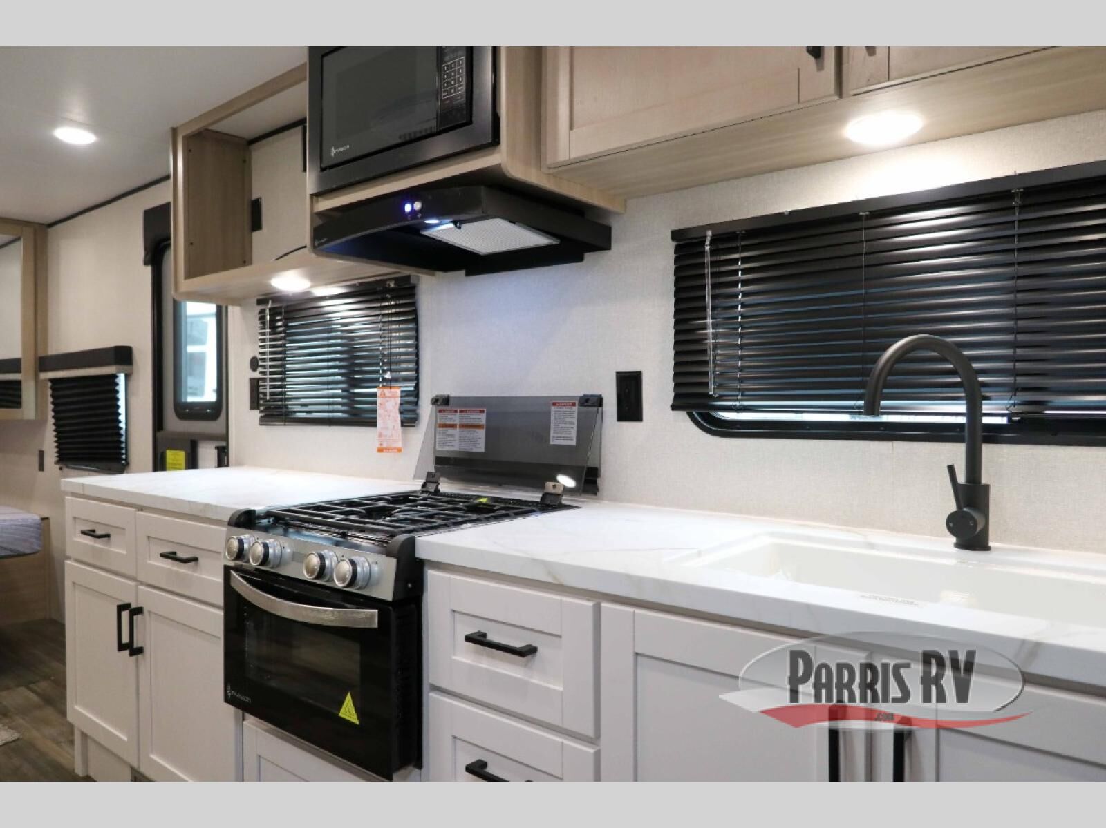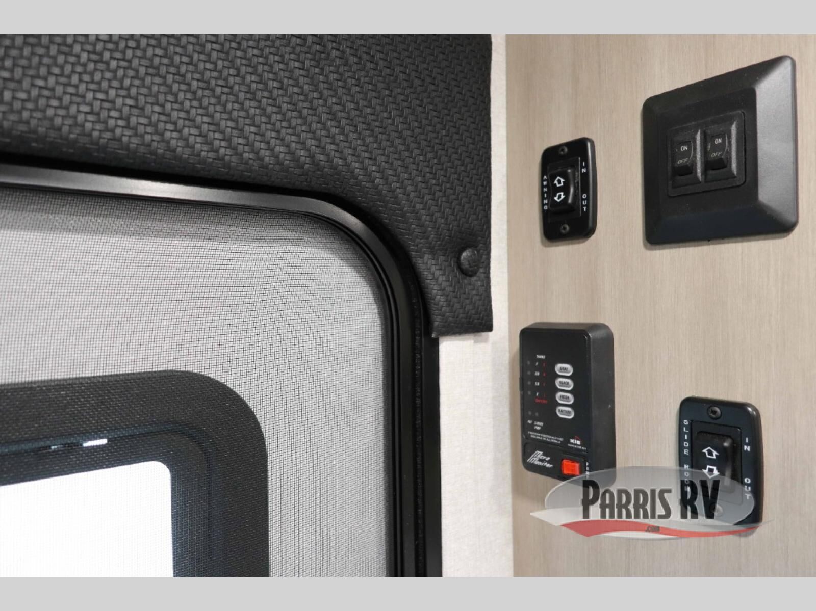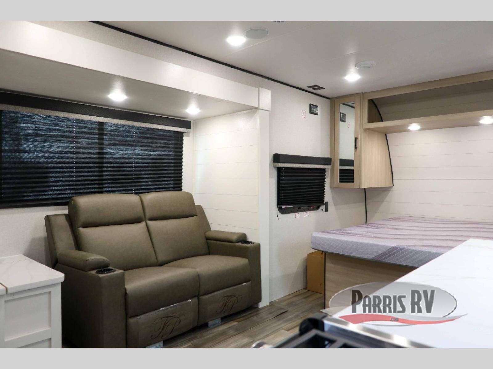 This couple's travel trailer is perfect for weekend trips to the lake! Once you arrive at the campground, you can unload the exterior storage, put out the 17' power awning with LED lights, then relax in your camp chairs. Head inside to make lunch on the three-burner cooktop in the rear corner kitchen, and you'll be pleased to find ample counter space here. The theater seat includes swivel tables where you can dine together, and the front queen bed is sure to bring a great night's rest!