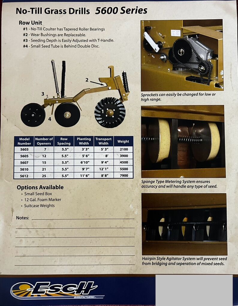 5.5 Row spacing for better ground coverage, No-till coulters cut through trash or sod for accurate seed placement, Precision foam seed meter works well with bin run seed and mixed seed sizes, Easy coulter and opener depth control, Additional small grain box for small seed