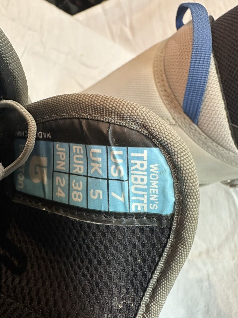 The Burton tribute is a light gray with blue trim. They lace up the front and are in good condition. See photos for details. $38. See photos for details. I take cash or Venmo, but cash is preferred. Text is best. 801-201-4446. Check out my other ads for additional sizes and styles.