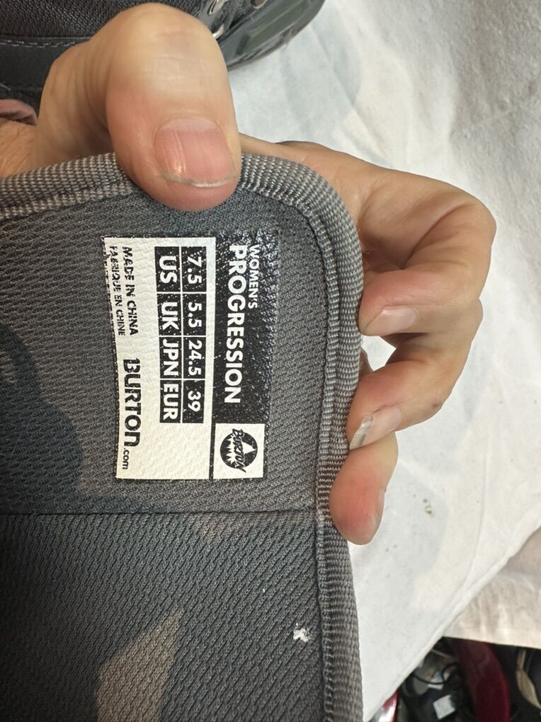 The dark grey pair are Burton progression womens size 7.5 and lace up the front. They are in good condition. See photos for details. $30. I take cash or Venmo, but cash is preferred. Text is best. 801-201-4446. Check out my other ads for additional sizes and styles.