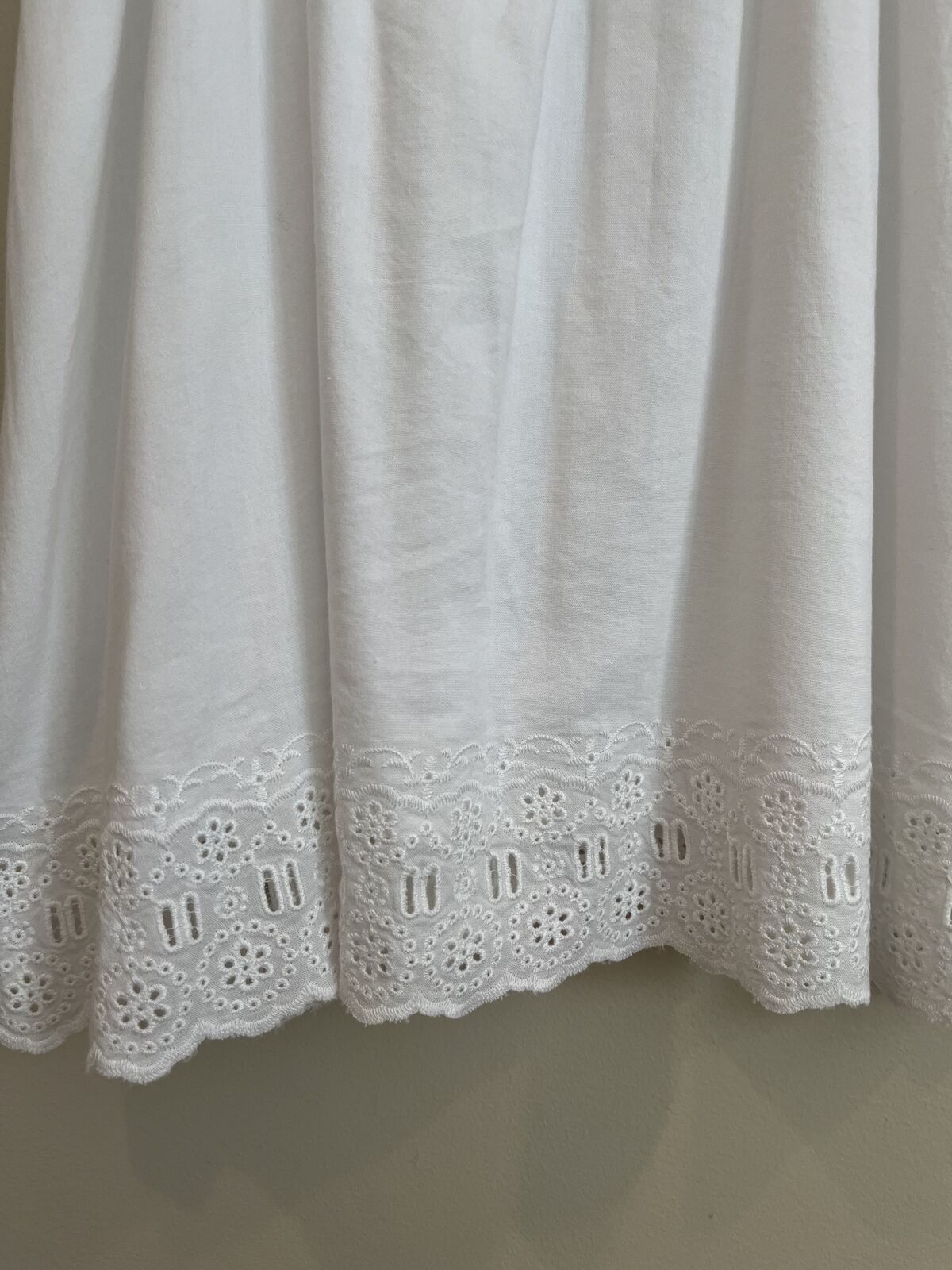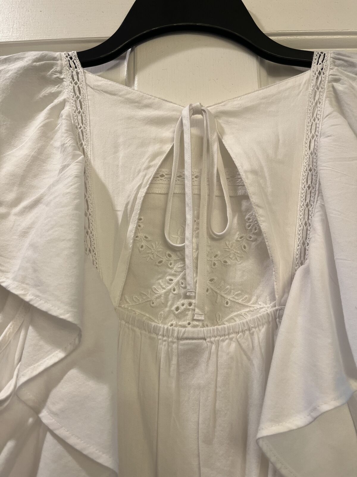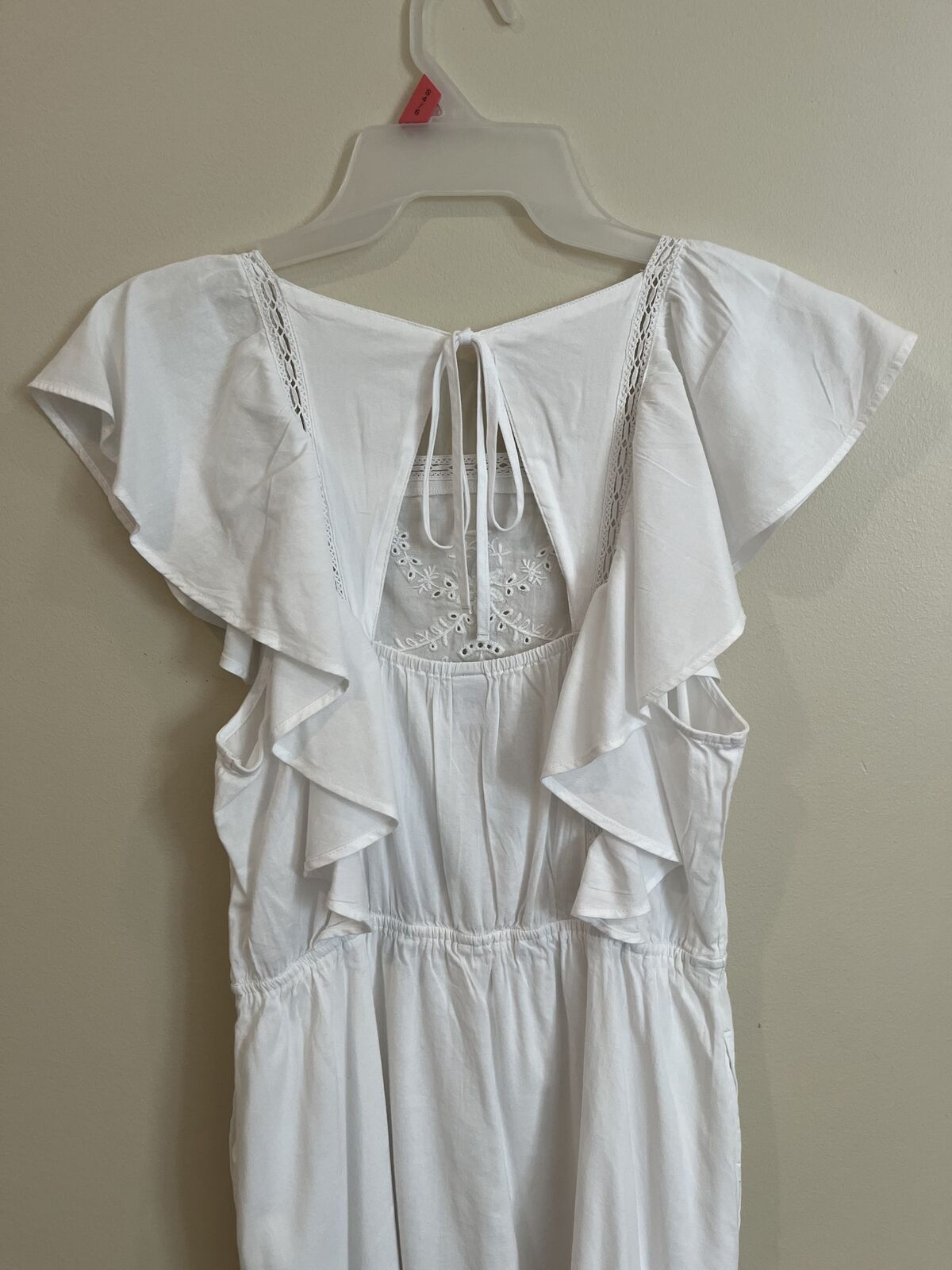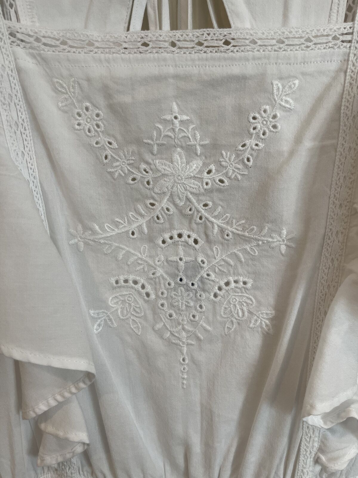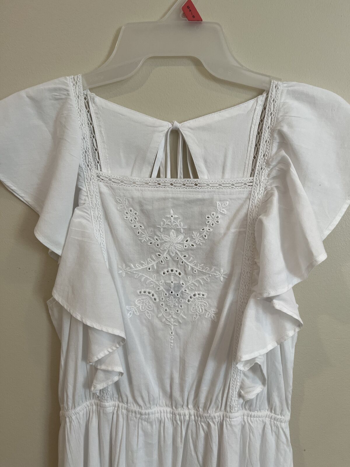 VenmoThis dress is new without tags. Never worn and stored in a smoke-free and pet-free home. Size adult small. The waist is a very stretchy elastic. When laid flat, the waist measures 13 inches across and can be stretched to 17 inches flat across. It is 35.5 inches from the shoulder to the bottom. It has lace-like details and embroidery, flutter sleeves, back self-ties, and pockets. No tears, rips, stains, etc.