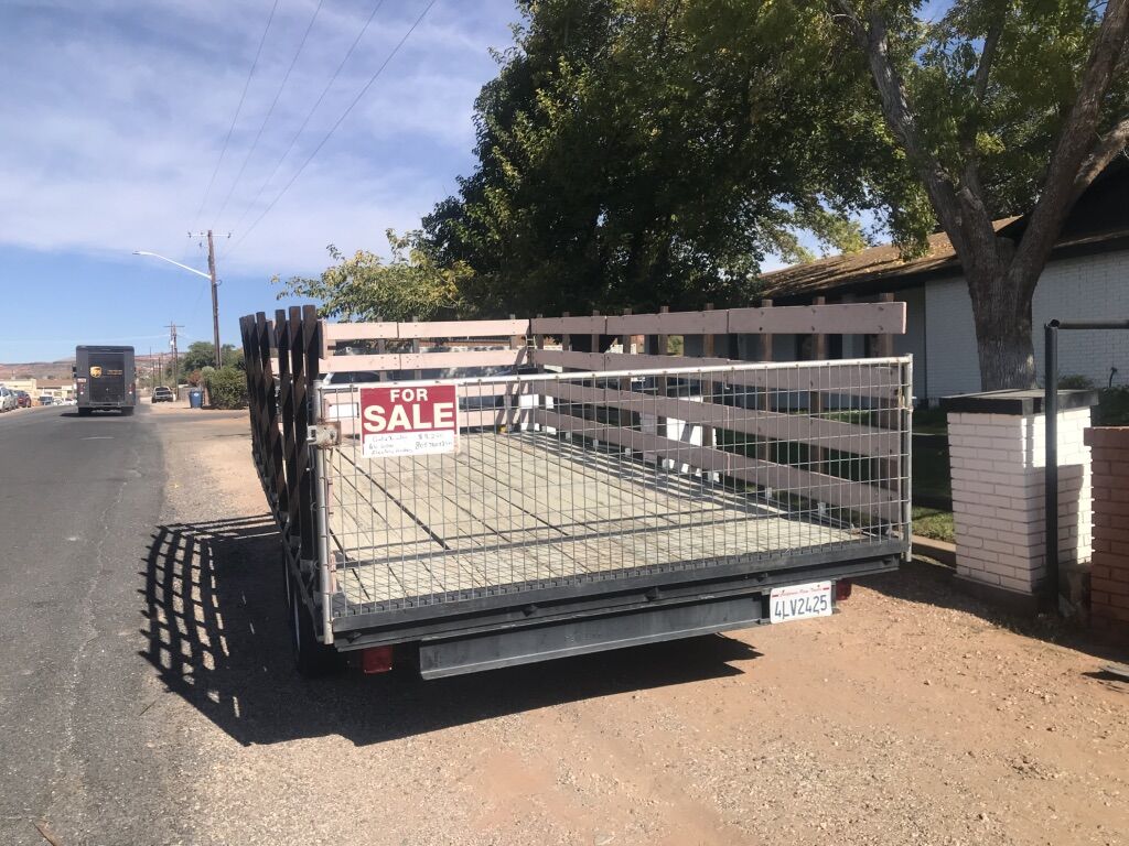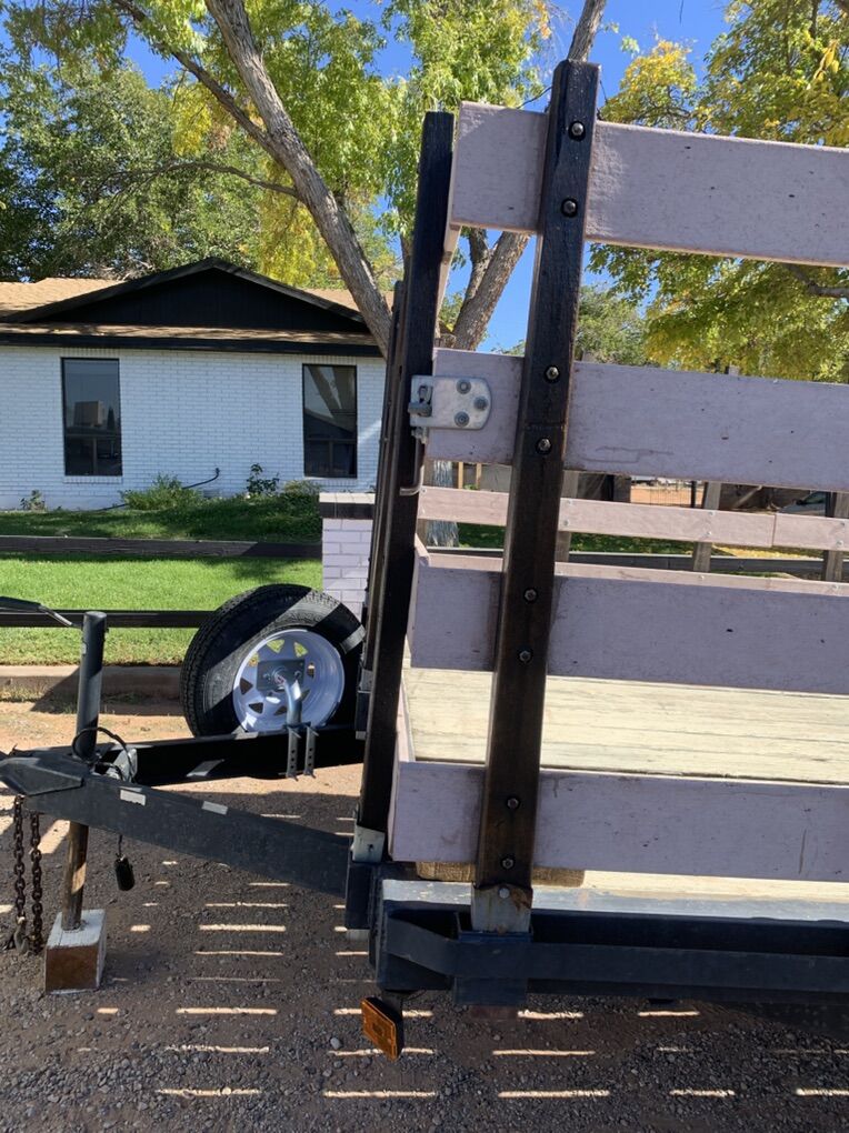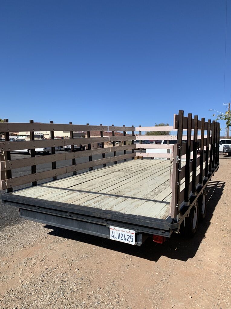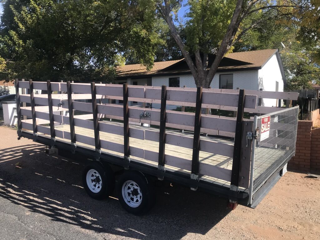 ApplePayHeavy duty 6,000 GVW double axle, deck over trailer with electric breaks and removable gates to become a FLAT BED. Gate and all sides are removable. Perfect for landscaping, pigs, hay, tires, lumber, insulation, etc. New lights, new wiring, solid deck, good tires, hardwood stake posts. Overall length is 20’, and deck dimensions are 16’ 3” x 8’ 2”. Gates are 43 high. In good condition. Clean Title.