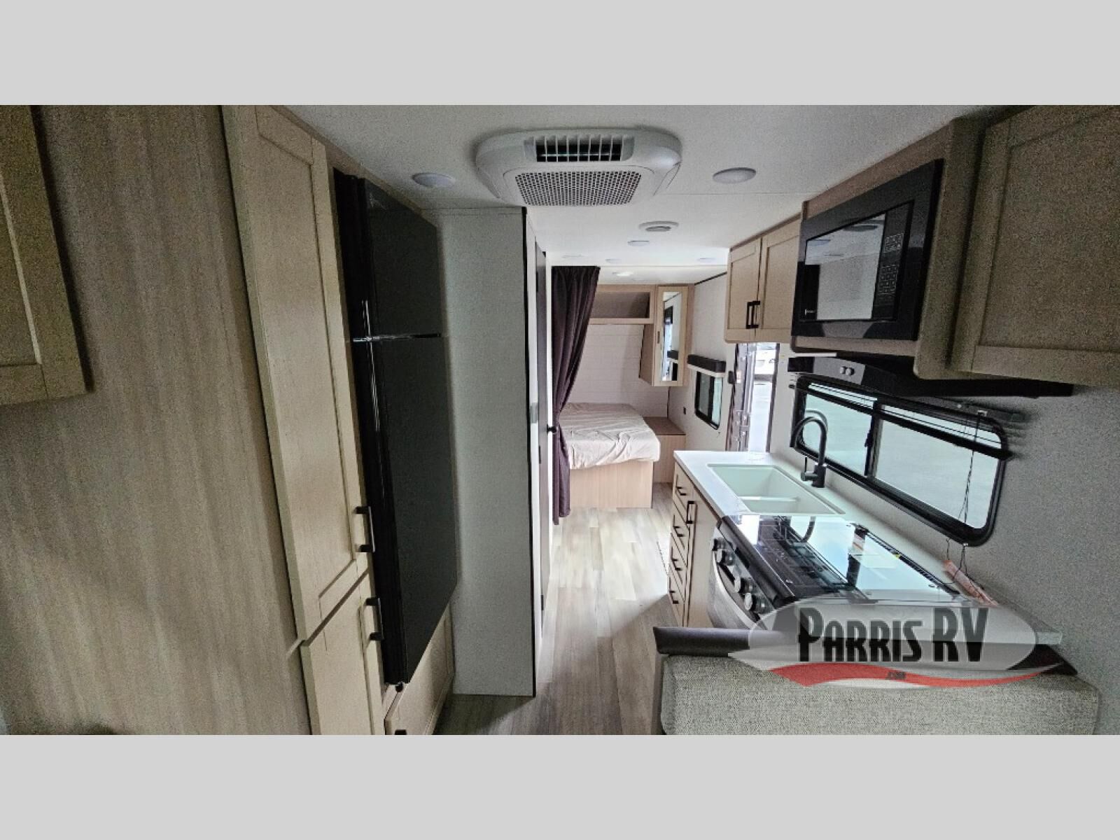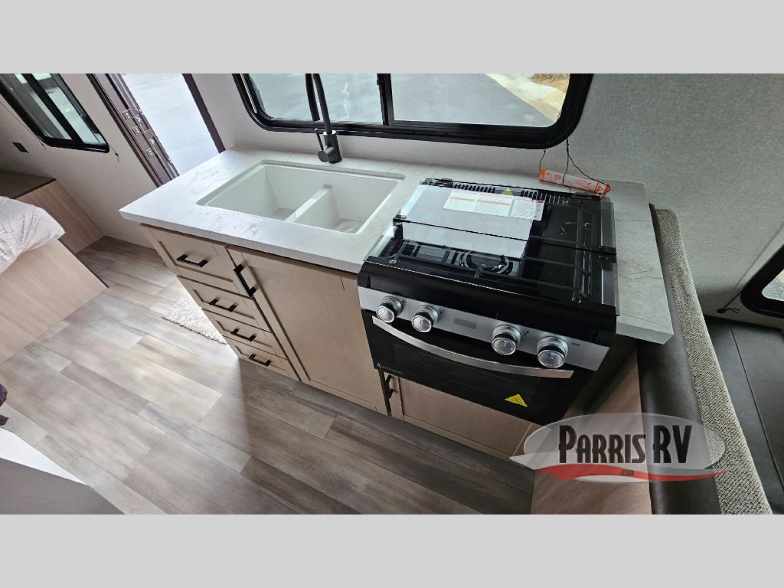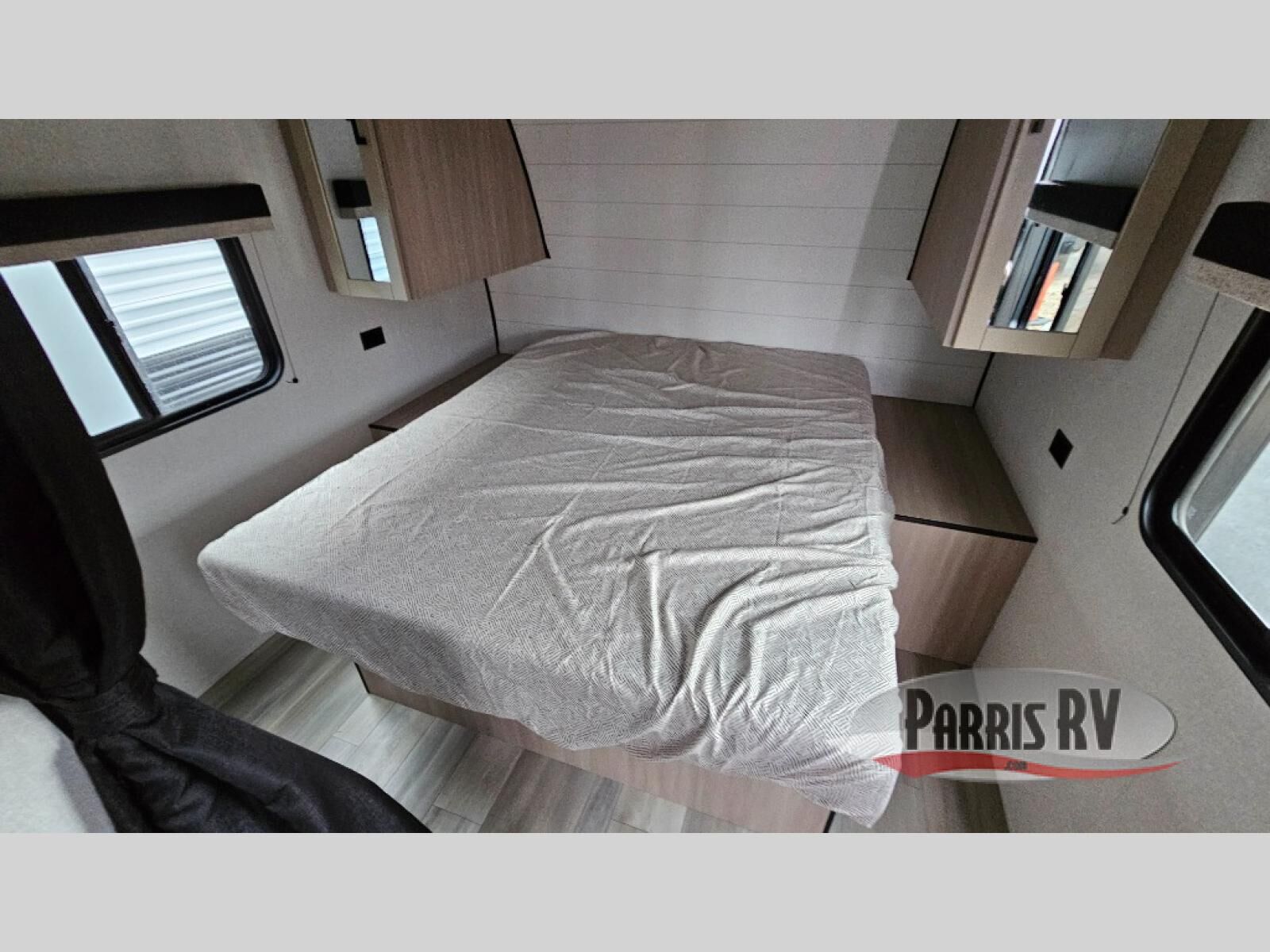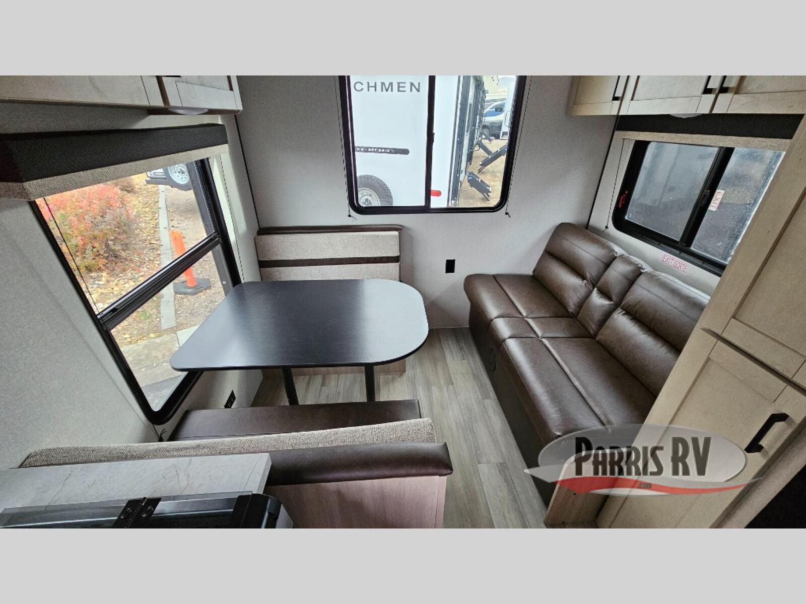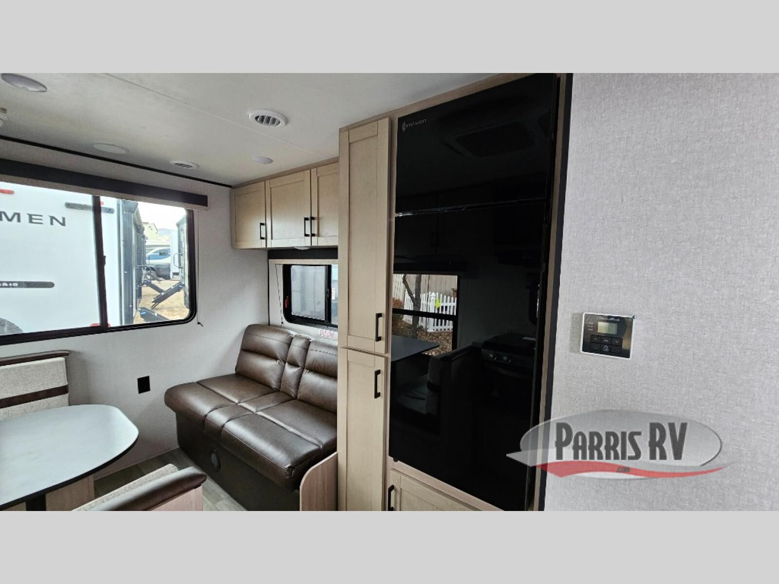 Weekend trips to the campground will be made unforgettable in this travel trailer for five to six. You will enjoy your own space in the front bedroom with a privacy curtain, RV queen bed and dual bedside wardrobes to keep your things tidy. If you have any guests staying over, then can convert the jack knife sofa and booth dinette back into seating spaces for breakfast in the morning. Speaking of breakfast, you'll have a three-burner cooktop and microwave oven to cook eggs and bacon, plus an 8-cu. ft. 12V refrigerator and pantry for food storage.