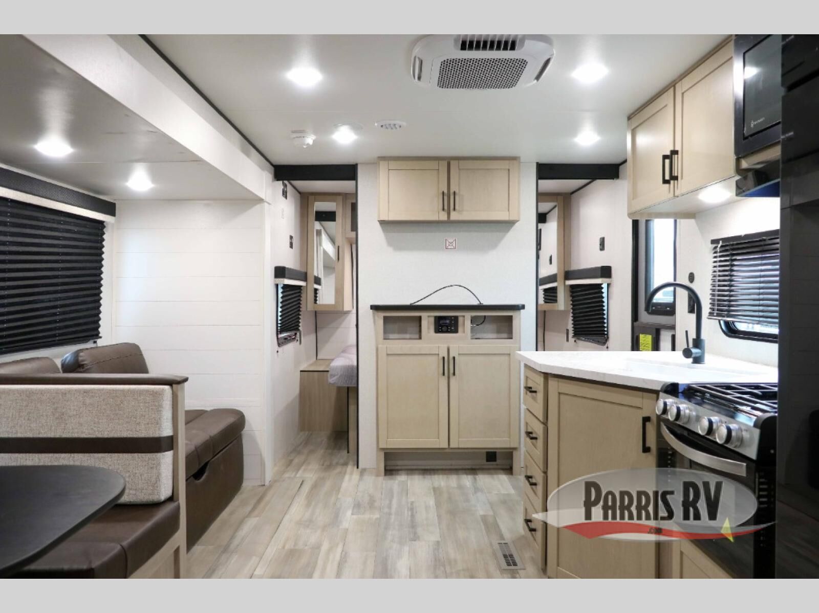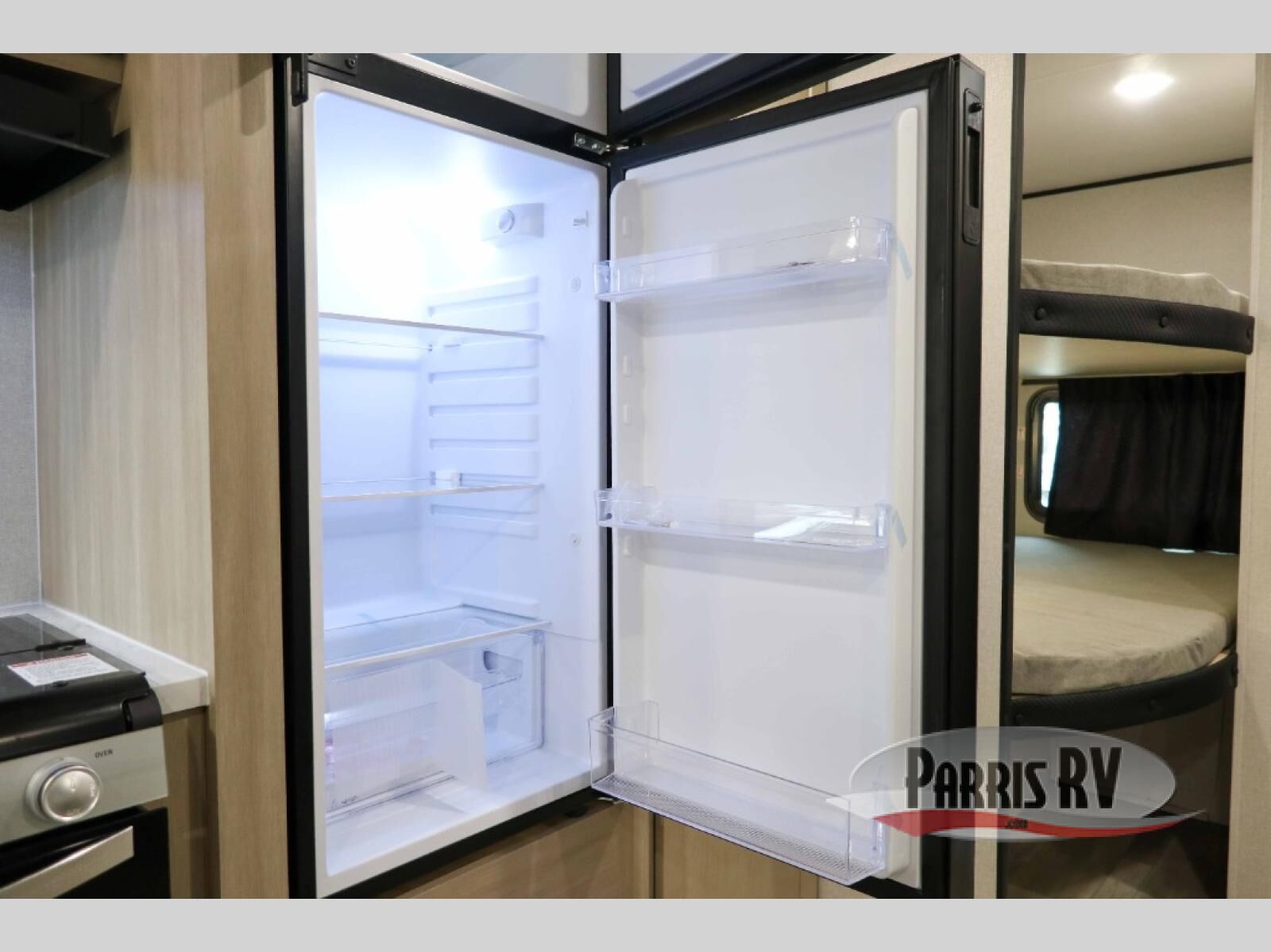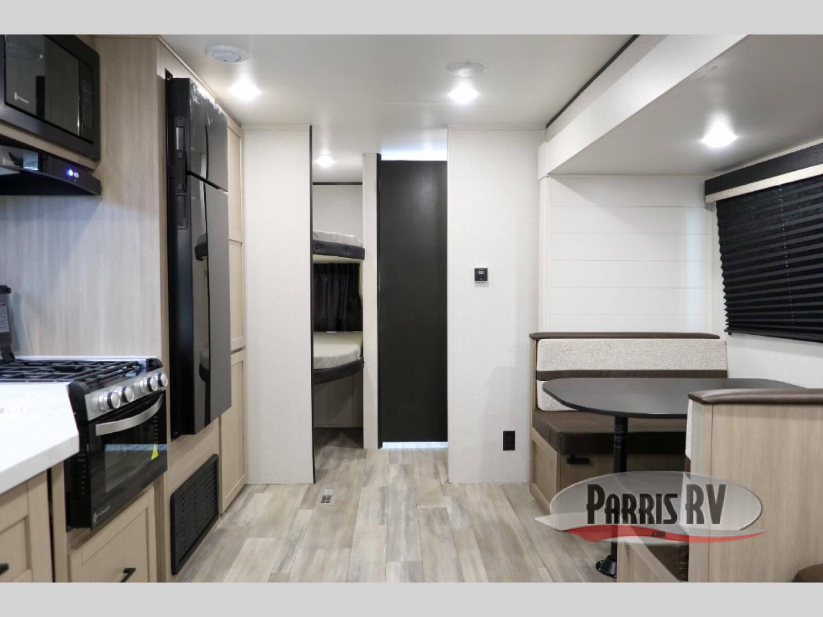 The whole gang will love weekends in the woods with this travel trailer in tow! There is a large slide out for added space, and here you'll find the jack-knife sofa and booth dinette. You can claim the front private bedroom to yourselves, while your guests or little ones take the double-size bunks. A full kitchen is complete with a three-burner cooktop and microwave oven to make meals each day, plus a 12V refrigerator and pantry for food storage. This unit also includes an outdoor kitchen with a refrigerator to keep cold drinks ready to enjoy!