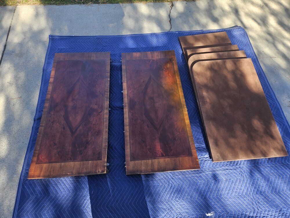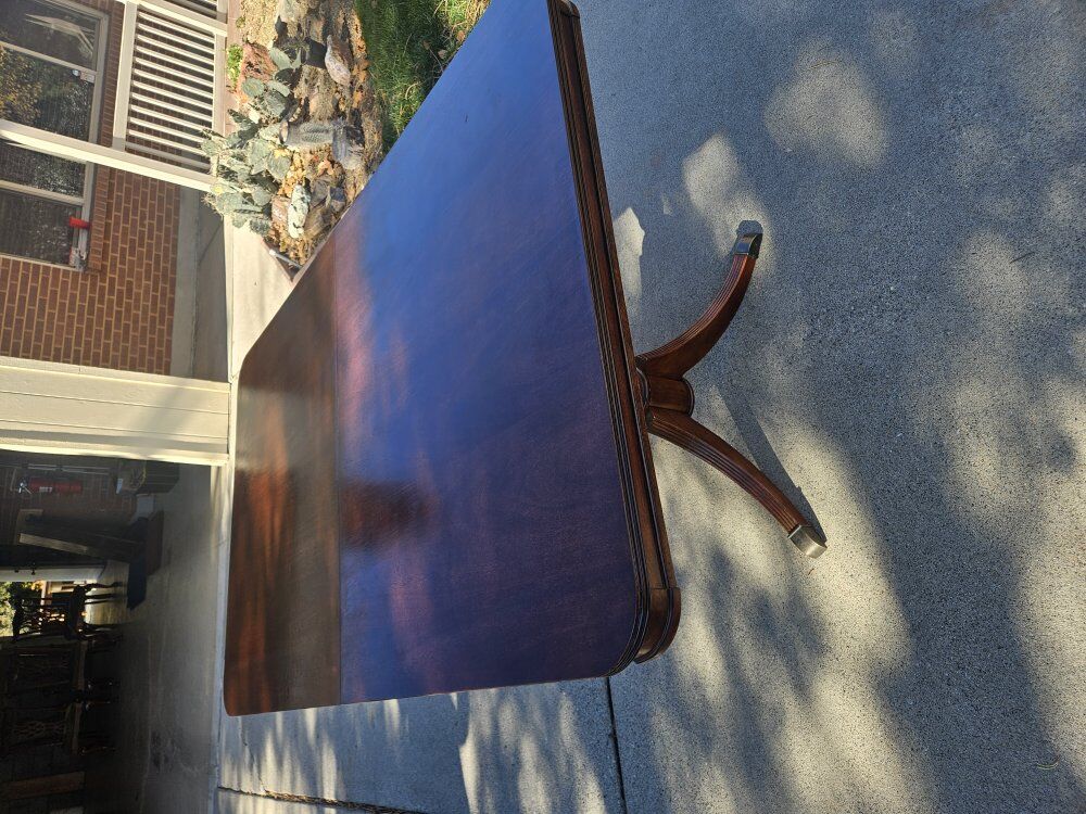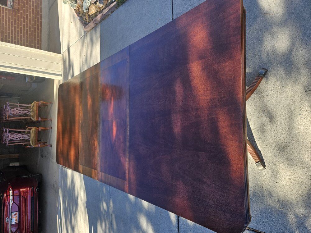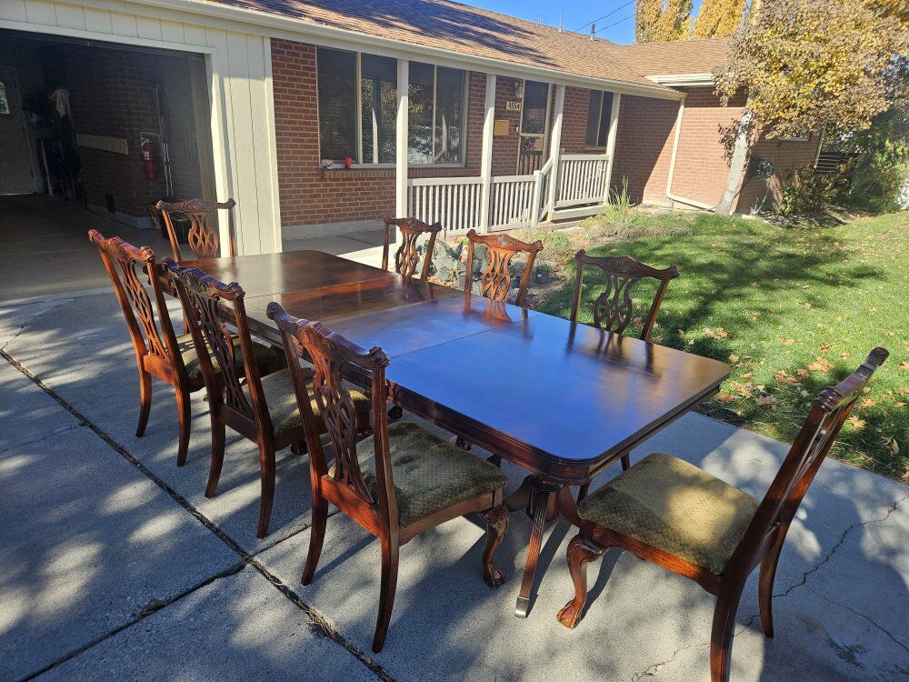 ZelleThis mahogany dini.g set includes a table, 2 leaves, pads, and 8 Chamberlain chairs. Both table and all the chairs have been fully refurbished and refinished, like new. The table is 70 inches long (110 inches with the leaves) and 44 inches wide. Perfect for holiday family gatherings!