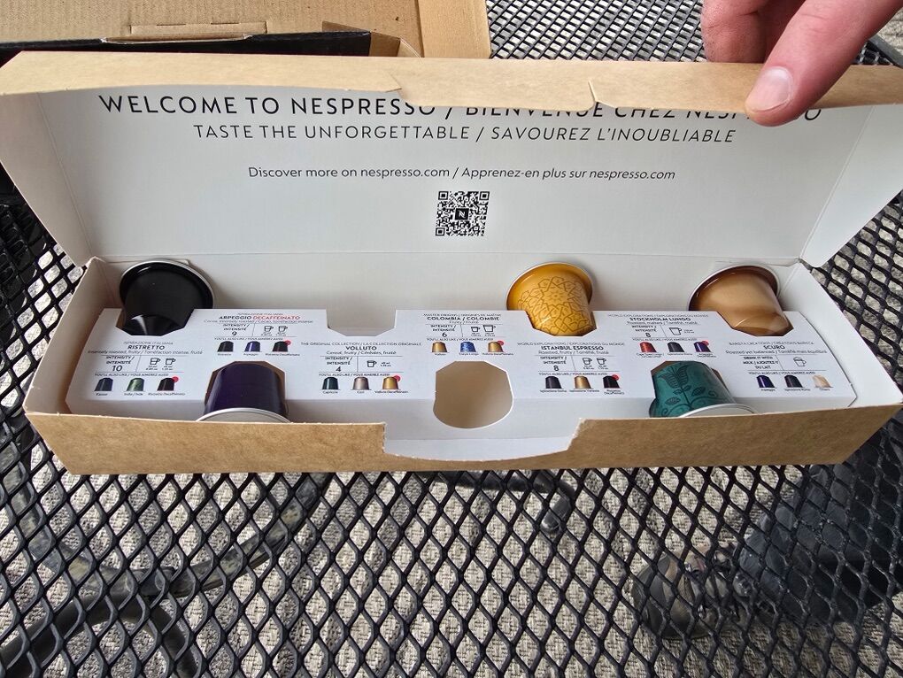 The pods are sold separately on the nespresso website, but this comes with a discount included in the booklet in the box for your first order of pods.