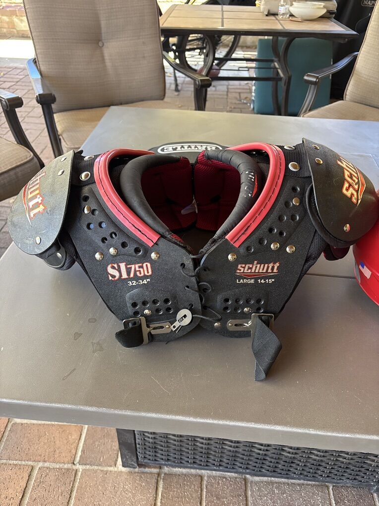 Used Schutt SI750 Youth Football Shoulder Pads Black Large 14-15” 32-34” In good condition. Helmet included.