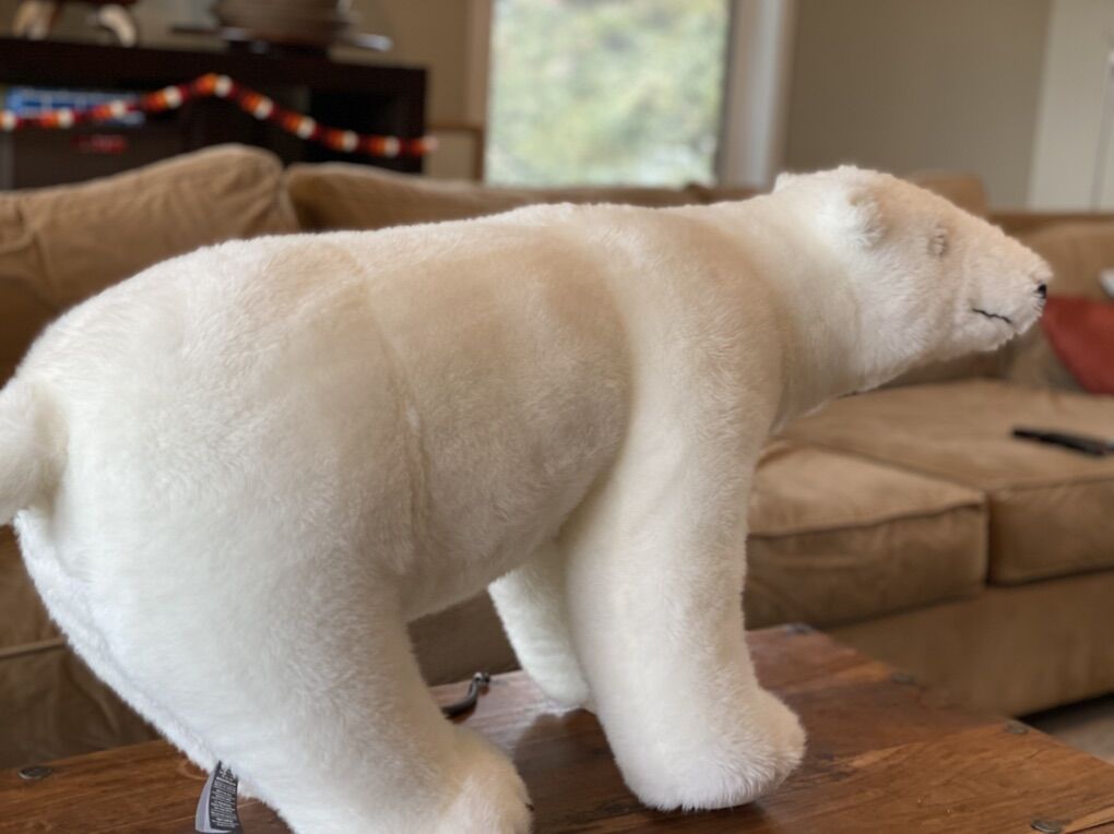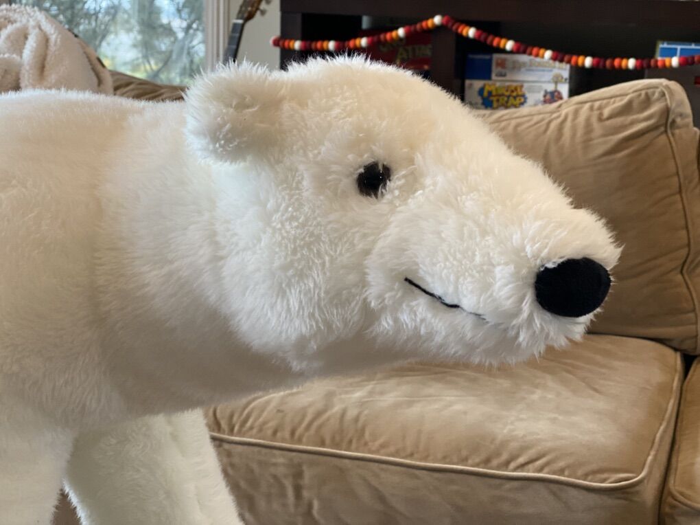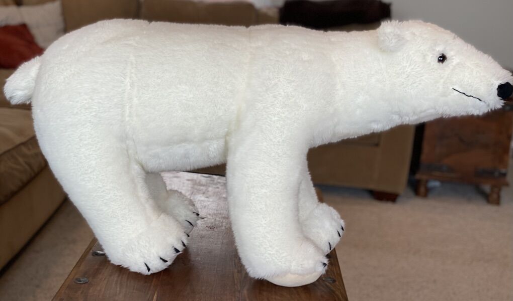 Melissa and Doug giant polar bear plush stuffed animal. In new condition. So snuggly and fun for kids. Would make a great addition to any playroom or as an adorable winter/Christmas holiday display. Purchased recently for $100 and has hardly been played with. Used as a room decoration.