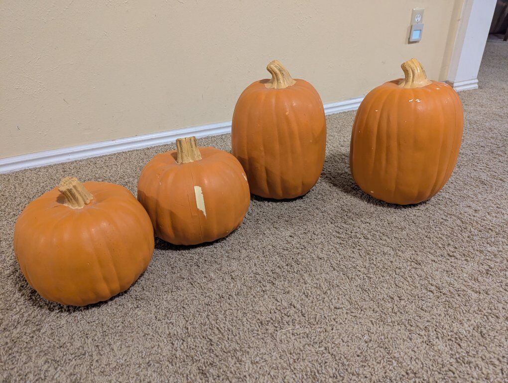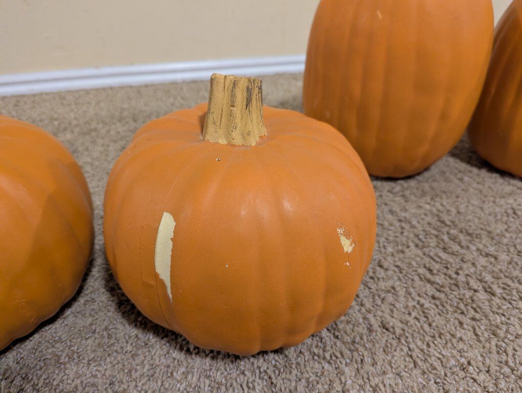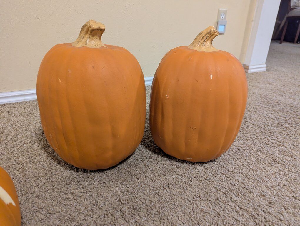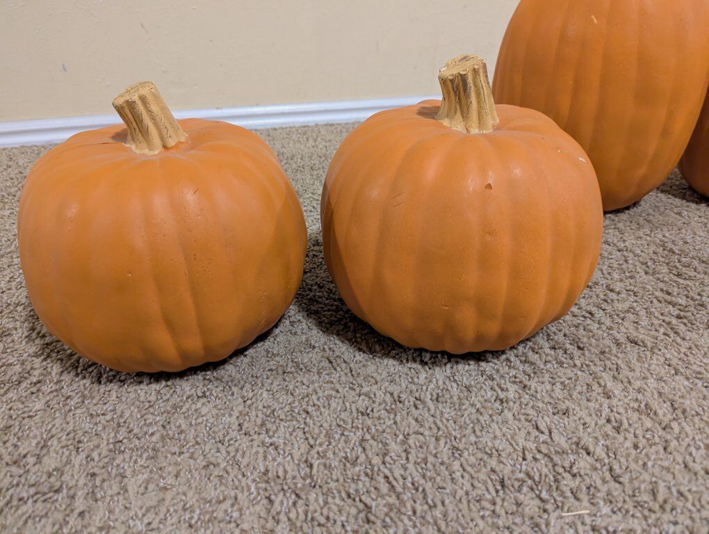 Venmo4 pumpkins of a hard foam plastic variety. They can be painted easily. as some have a few minor spots of peeled paint. $5 each or $20 for all